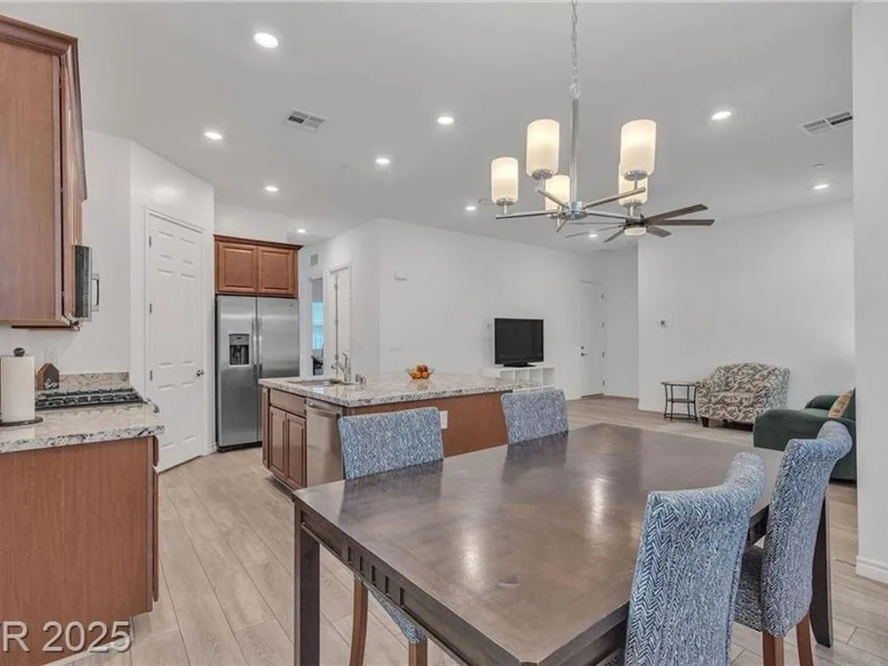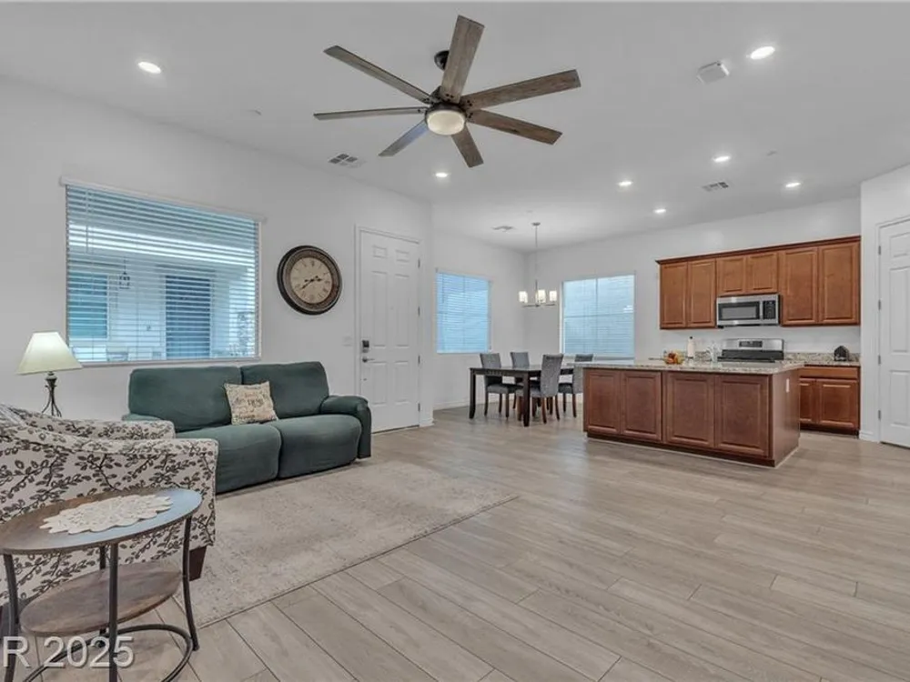 Beautiful, Modern and Move-In-Ready 2BR + Den / 2BA home in 55+ Guard-Gated Heritage at Cadence featuring a popular single-story courtyard design and open-concept floor plan. The kitchen boasts granite countertops, large island, stainless steel appliances and walk-in pantry. Additional features include luxury vinyl plank flooring throughout, decorative ceiling fans, Rheem water softener, Brisa retractable screen door and LV Pro Tint on select windows for heat/UV protection. Garage includes NEMA outlet for EV/golf cart charging and Genie Garage Door opener compatible w/Aladdin Connect. Enjoy resort-style amenities: clubhouse, indoor/outdoor pools, pickleball, tennis, fitness center, dog parks, social events and more. Located in Cadence - ranked in 2025 as a Top 3 U.S. master-planned community—near trails, parks, golf, shopping, world class dining and entertainment!