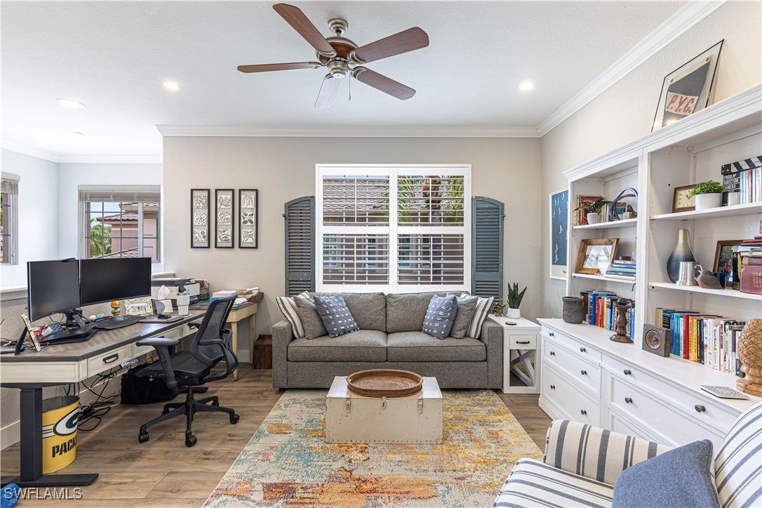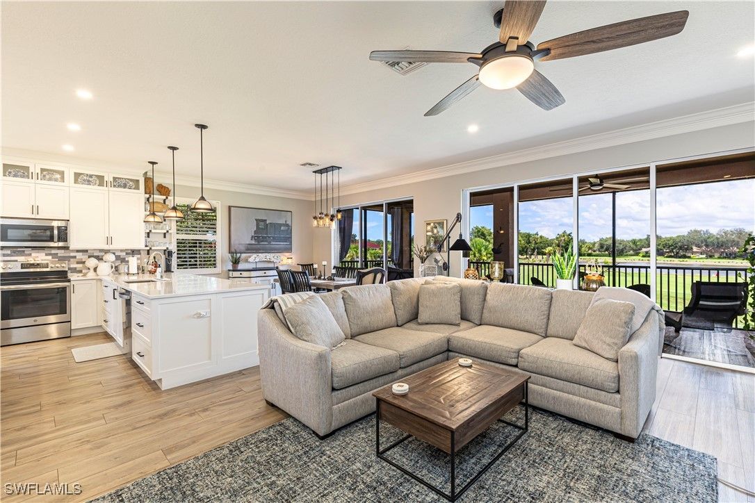 A beautifully renovated home located in the Vineyards. This popular model is 2494 sq ft with 3 bedrooms, den and 3 full baths. Enjoy the golf action from your large lanai overlooking the 7th hole. The open floorplan is light and bright with a wall of windows and doors facing the golf course. The home feels spacious with 10-foot-high ceilings and crown molding throughout. The custom kitchen has stainless appliances, quartz counters and lots of storage. The den/loft is open and with tons of natural light. The primary bedroom has sliding glass doors out to the lanai and a gorgeous reconfigured bathroom. The other two bedrooms are generously sized ensuites. Regency Reserve replaced all roofs in 2021 and has its own renovated clubhouse, resort-style pool and fitness center. The Vineyards Country Club offers two levels of optional memberships. A 36-hole championship golf course, restaurant, tennis courts, pickleball courts, resort-style pool, lap pool and bocce. In addition, the wellness and spa center offer on-site fitness trainers, physical therapist, café, salt room, massage and salon services
