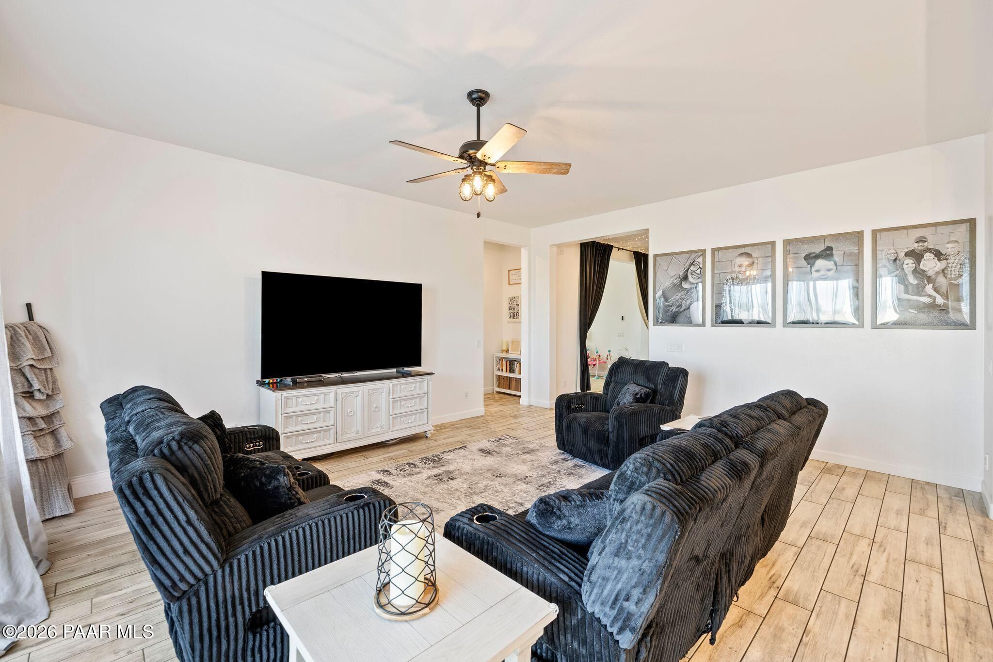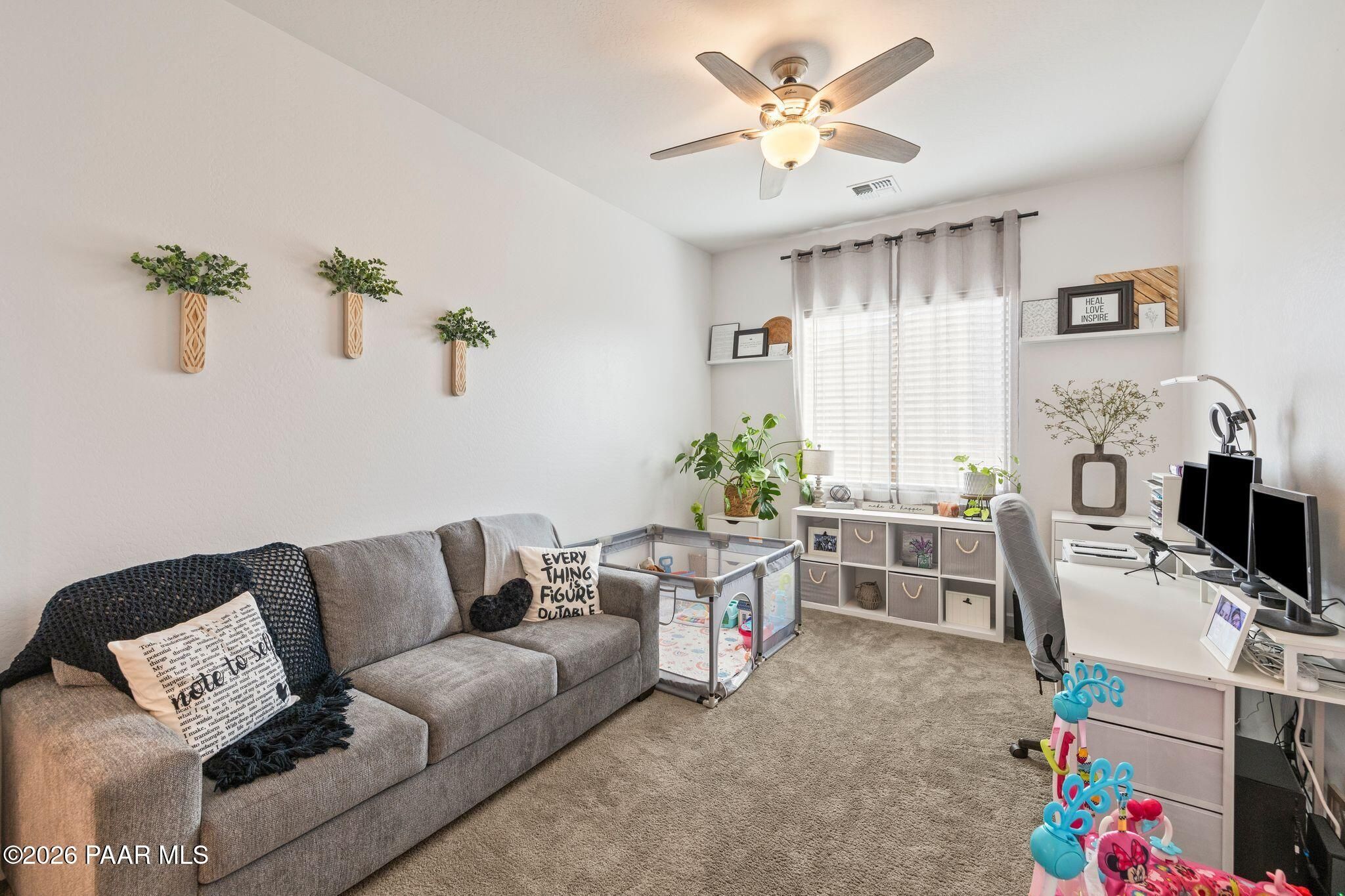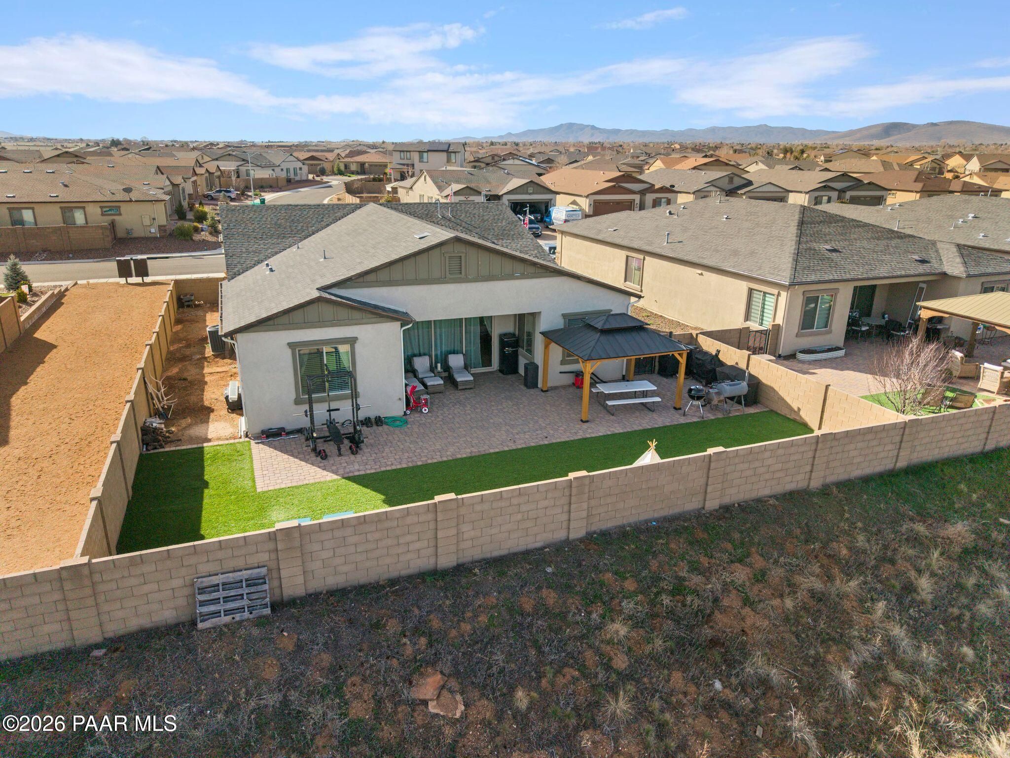 Welcome to this stunning 2021-built home in the highly sought-after Pronghorn Ranch community of Prescott Valley! Built by award-winning Dorn Homes, this spacious 4-bedroom, 3-bath residence with a bonus room offers 2,311 sq ft and one of the builder's largest floorplans. The open-concept great room flows into a gourmet kitchen with granite countertops, large island, stainless steel appliances, and ample cabinetry. The split floor plan provides privacy, highlighted by an oversized primary suite with dual vanities, walk-in shower, garden tub, and generous walk-in closet. Enjoy low-maintenance landscaping with pavers, turf, and a covered patio and no one directly behind your property. Community amenities include a heated pool, spa, fitness center, clubhouse, parks, and walking trails, all just minutes from shopping and dining. Don't miss this exceptional opportunity!