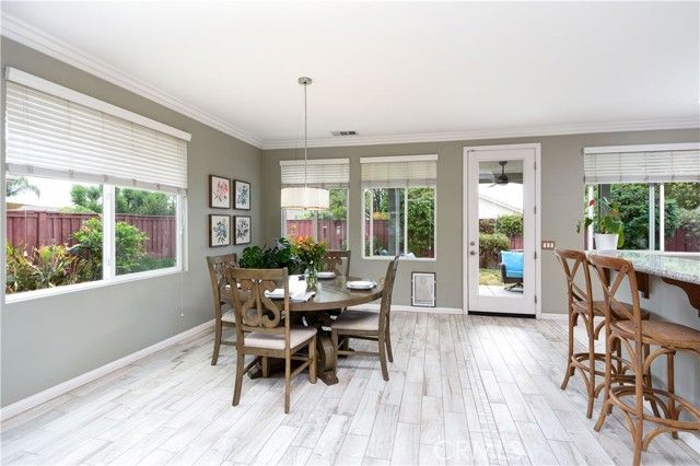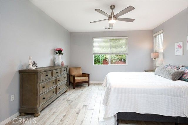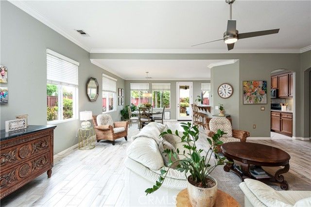 Four Seasons is a Premier 55+ master planned community with unparalleled activities and amenities. Contemporary, light and welcoming epitomize the feeling of this spacious two bedroom two bath home with 2021 sq. ft. and two car garage. The versatile floor plan offers a third room to suit your lifestyle, whether you need an office, art studio or guest room. Nestled on a quiet cul-de-sac, double door entry w/ custom security screen doors, primary en suite offers 2 walk in closets, high ceilings, light wood look tile floors, updated lighting and ceiling fans, floor to ceiling stack stone faced F/P, granite kitchen, all appliances included, crown molding, covered patio, fully landscaped. Water softener system, updated light fixtures, faux wood blinds. Resort style living, HOA $214.00. gated community with attendant, roving 24 hour security. Come experience fulfilling clubs and fun filled events or just luxuriate at the gorgeous pool. The privately owned golf course of Hemet Golf Club winds gracefully throughout the community adding to the natural beauty of the landscape.