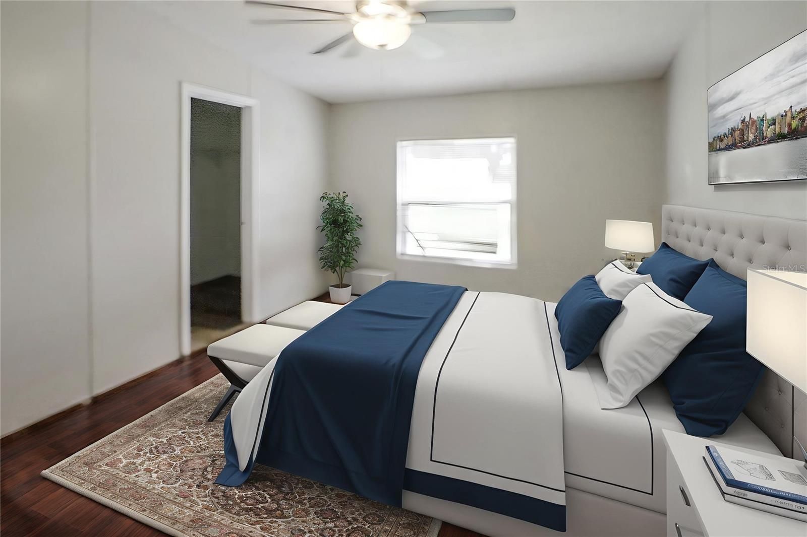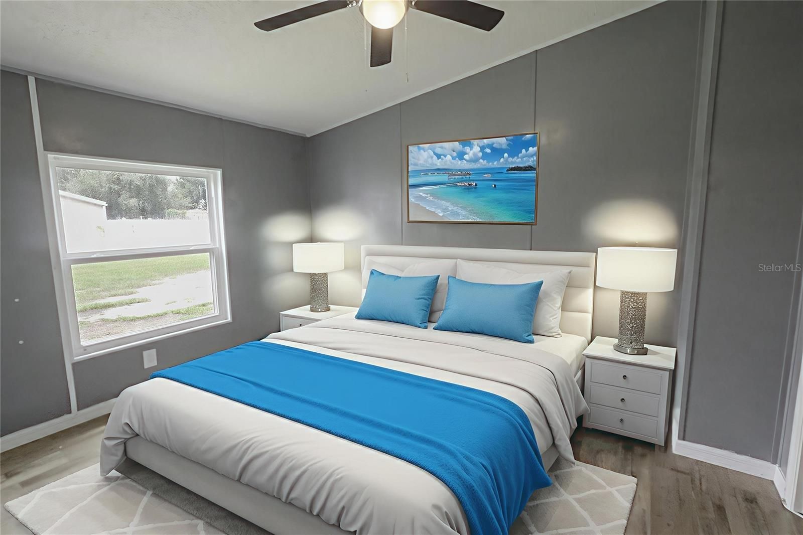 - Cathedral Ceiling(s), Ceiling Fan(s), High Ceilings, Living/Dining Room, Open Floorplan, Main Level Primary, Split Bedrooms, Thermostat, Walk-In Closet(s)