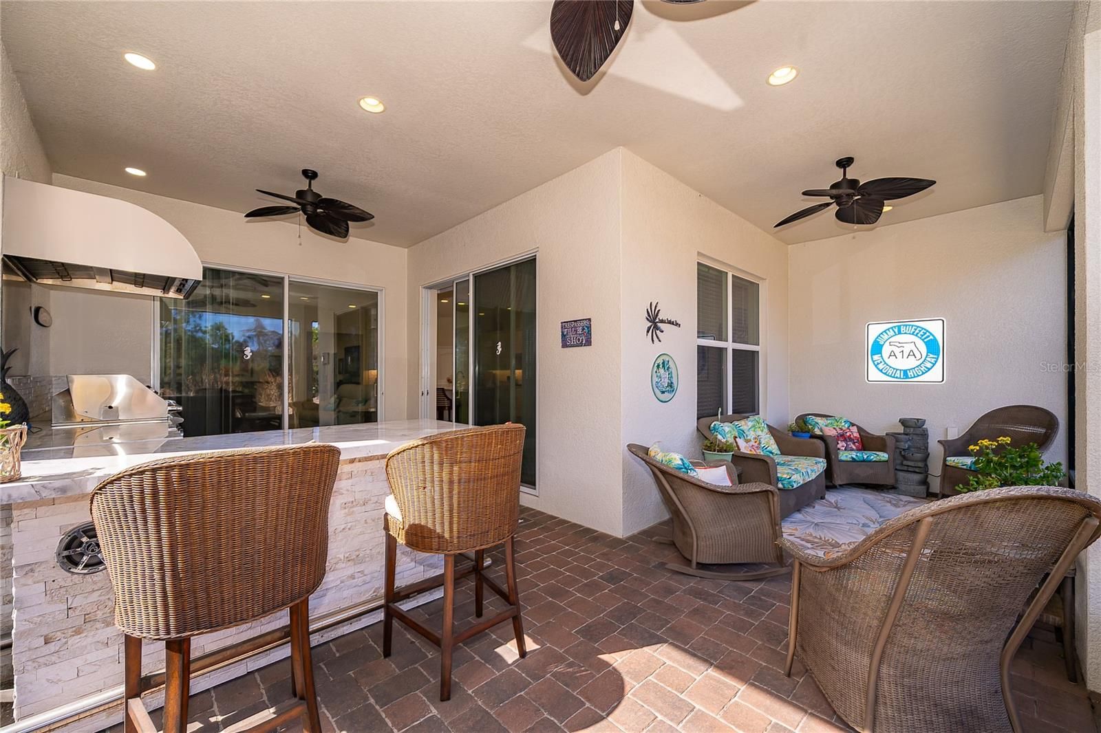 Welcome to refined Florida living in the sought after Four Seasons Orlando 55 plus community. This beautifully upgraded single family home offers 2,360 square feet of thoughtfully designed space, combining comfort, function, and lifestyle in one of Central Florida’s most desirable active adult neighborhoods. The sought-after Dominica model showcases a thoughtfully designed floor plan features 2 spacious bedrooms, 2.5 baths, and a dedicated office with a closet that can easily function as a 3rd bedroom. A private guest suite with its own full bath creates an ideal setup for visitors, while the expanded primary suite delivers a true retreat with a bump out design, 2 walk in closets with custom built ins, and a fully upgraded primary bath. The bath showcases dual sinks, granite countertops and a large walk in shower with a repositioned rain head for a spa like experience. The kitchen is both stylish and functional, equipped with GE Profile appliances, enhanced lighting, added outlets, and a reworked pantry featuring custom shelving for exceptional storage. The laundry room has been fully built out with cabinetry and additional storage, and fans have been added throughout the home for comfort and energy efficiency. The dedicated office is a standout feature, offering wall to wall built ins and a large desk, perfect for working from home or managing hobbies. The garage has also been enhanced with added shelving and a separate storage area. Outdoor living is where this home truly shines. Seamless corner glass sliders open to your private outdoor oasis. Enjoy a large covered patio with ceiling fans and a fully equipped summer kitchen featuring a gas grill, 2 burners, refrigerator, sink, and generous storage. The outdoor kitchen alone represents an estimated $17,000 investment. The pavers have been sealed and re sanded adding both beauty and longevity. The interior shows extremely well, with systems in good working order. Furniture is negotiable, and TVs can remain with the home. Jimmy Buffett and Disney themed memorabilia and media do not convey. Located close to the clubhouse and community amenities, this home offers a lifestyle focused on leisure, connection, and comfort. Four Seasons Orlando continues to see steady buyer interest that supports both value and opportunity. Residents of Four Seasons at Orlando enjoy an exceptional lifestyle with 24-hour guarded entry, a 13,000-square-foot clubhouse, two resort-style pools, spa, fitness center, tennis, pickleball, and bocce courts. HOA fees include exterior landscaping, allowing for truly maintenance-free living. This home is ideal for a buyer seeking a turnkey lifestyle with meaningful upgrades, strong indoor and outdoor living spaces, and the unique energy of a resort style 55 plus community. All of this just minutes from Walt Disney World® and Central Florida’s premier dining, shopping, and entertainment destinations. Luxury, leisure, and location, perfectly combined in one extraordinary home. Reach out today to schedule your private showing!