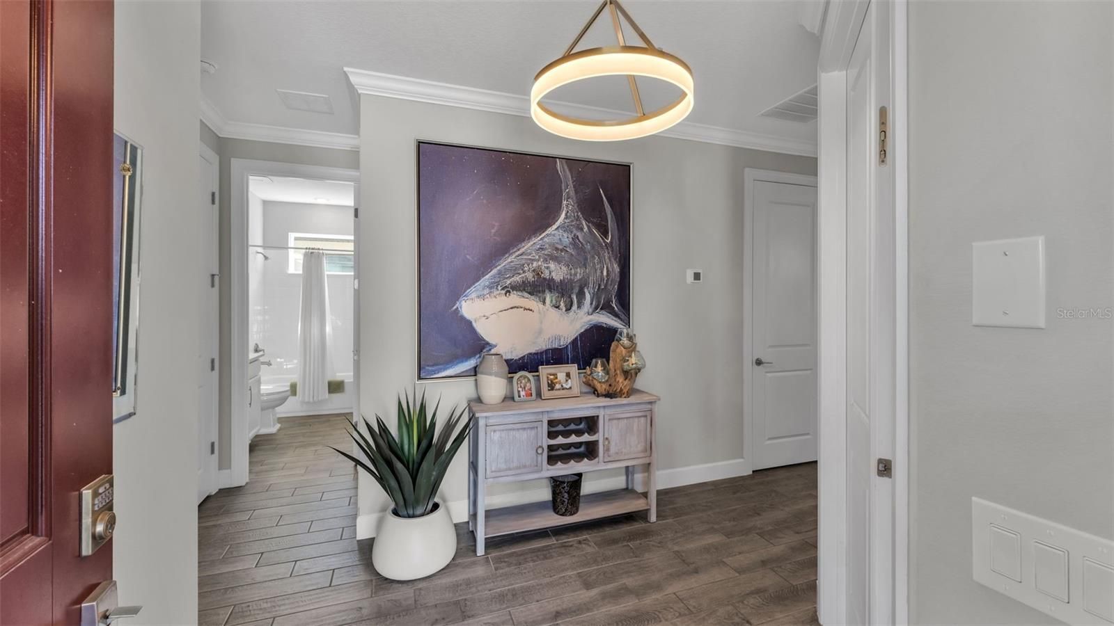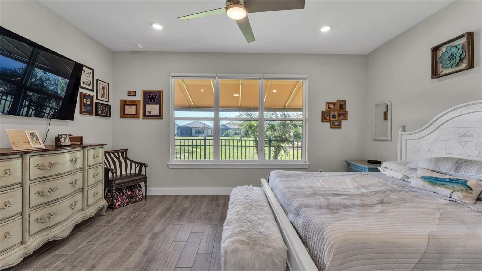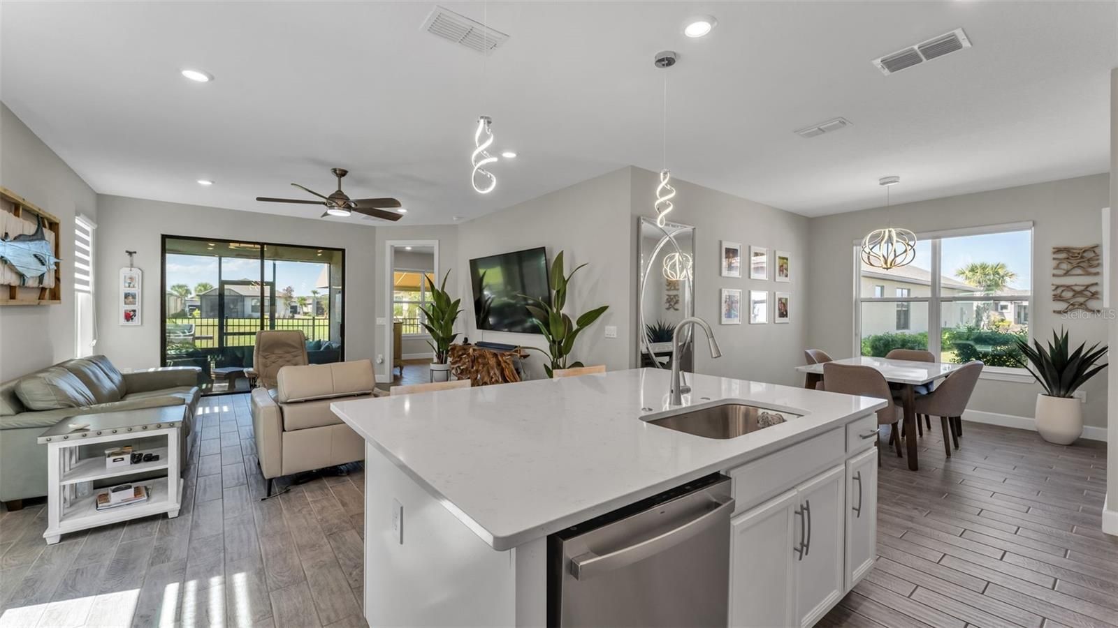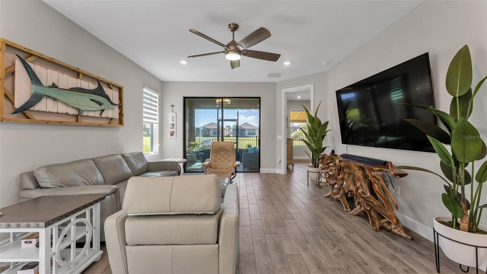 One or more photo(s) has been virtually staged. Don’t Miss This Upgraded Waterview Gem with Rare Golf Cart Garage! This beautifully appointed 2023 Allora model offers 2 bedrooms, 2 bathrooms, plus a versatile flex room. Perfect for a home office, den, or guest space, along with a 2-car garage and a highly sought-after golf cart garage, a premium feature not found in all homes. Ideally located near the Village Center, this home showcases serene water views, high ceilings, and taller interior doors that enhance the spacious, airy feel throughout. Inside, you’ll find a bright open-concept layout with a spacious dining area and no carpet throughout, featuring ceramic wood-look tile for style and easy maintenance. The upgraded kitchen is designed to impress with a custom pantry, tile backsplash, breakfast bar, and pull-out double-level cabinetry, making everyday living and entertaining seamless. The expansive great room opens to a screened, covered lanai overlooking the tranquil water, creating the perfect indoor-outdoor space. The primary suite also enjoys peaceful water views and features a spa-like en-suite bath with dual sinks, a large walk-in shower with built-in seating, and a custom-designed oversized walk-in closet. The split-bedroom layout ensures privacy for guests, while the flex room adds valuable functionality to suit your lifestyle needs. Additional upgrades include built-in closets, gutters, and enhanced storage throughout, plus a laundry room with sink and cabinetry. Step outside to an extended, fenced paver patio featuring pet-friendly artificial turf, a shaded Sunshade awning, and a dedicated pet area ideal for relaxing or entertaining. Built in 2023, this home offers peace of mind with ROOF, HVAC, WATER HEATER, and APPLIANCES all 2023. Located in the award-winning 55+ community of Solivita, residents enjoy access to world-class amenities including 14 heated pools, championship golf courses, pickleball and tennis courts, fitness centers, dining, and endless social opportunities. This is more than a home, it’s a lifestyle. Schedule your private showing today!