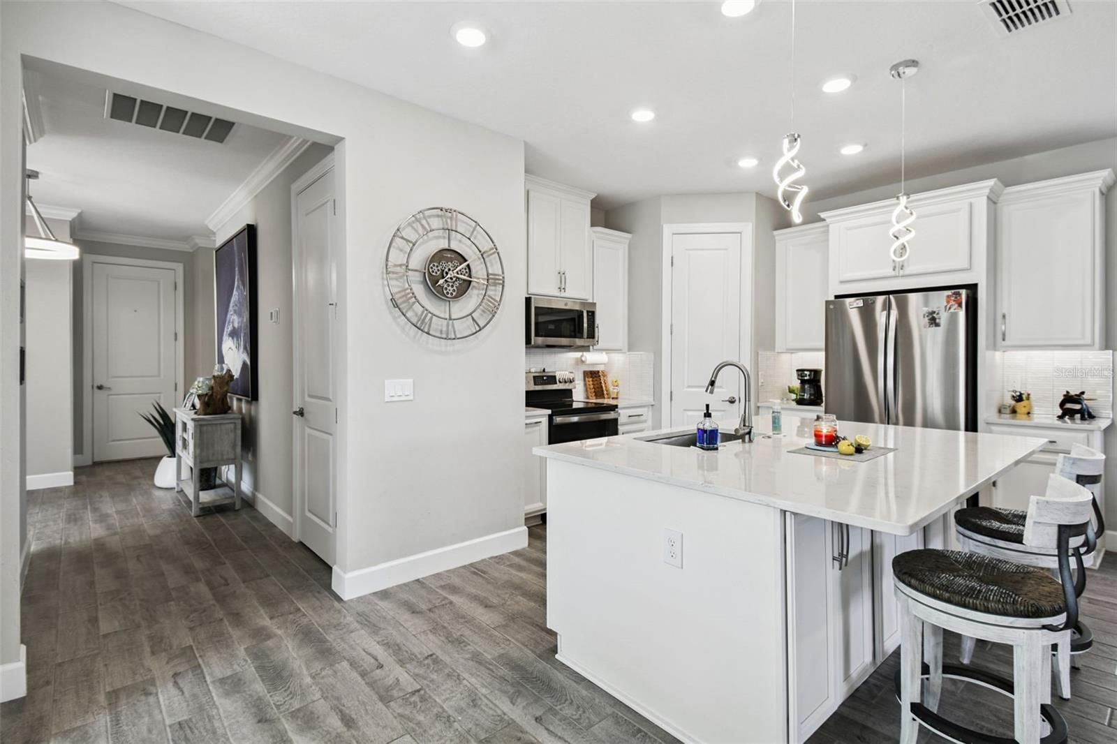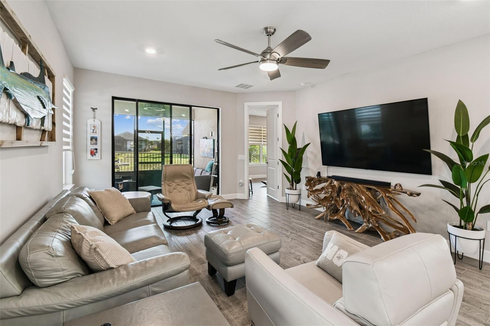 This beautifully appointed 2023 Allora model offers 3 bedrooms, 2 bathrooms, a 2-car garage plus a coveted golf cart garage, all perfectly positioned near the Village Center amenities. Enjoy a serene water view and an open-concept layout with a dining area and NO CARPET — featuring ceramic wood-look tile throughout for both style and easy maintenance. The chef’s delight kitchen showcases a custom pantry, breakfast bar, tile backsplash, and pull-out double-level cabinet drawers, making both cooking and entertaining a pleasure. The spacious great room opens via sliders to a screened and covered lanai overlooking the tranquil water, creating the perfect indoor-outdoor living space. The primary suite also enjoys peaceful water views and includes an en-suite bathroom with double sinks, a large walk-in shower with built-in seat, and a custom-designed oversized walk-in closet. Guest bedrooms and the guest bathroom are thoughtfully split from the primary suite for added privacy. Step outside to your extended living area featuring a fenced-in patio with pavers, pet friendly artificial turf which is covered by a SunShade awning and a pet-friendly grass/carpet area — ideal for pets and relaxing or entertaining. Additional highlights include a laundry room with sink and cabinetry and a generous garage with ample storage plus the extra golf cart bay.(Golf Cart is available outside of offer contract) Built in 2023, this stress-free home comes with ROOF, HVAC, WATER HEATER, and APPLIANCES all 2023 — offering peace of mind and modern efficiency. A must-see home combining location, luxury, and low-maintenance living! All this in one of the top 55+ communities in America. Solivita offers residents access to state of the art amenities and work out facilities, dance and aerobics studios, a business center, 14 heated swimming pools, 2 heated spas, tennis courts, pickleball courts, shuffleboard, bocce ball, billiards room, art gallery, 3 restaurants and 2 championship 18-hole golf courses, driving range and putting course. Every day offers something new to explore and enjoy! This home also features easy access to nearby shops, dining, and health care, offering the perfect balance of privacy and lifestyle. Don't miss out on the opportunity to have a first class lifestyle.