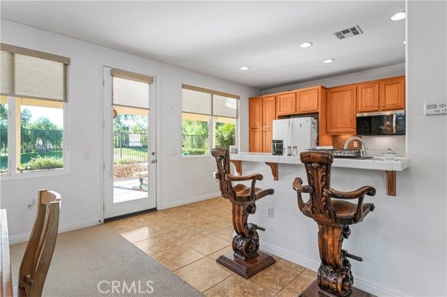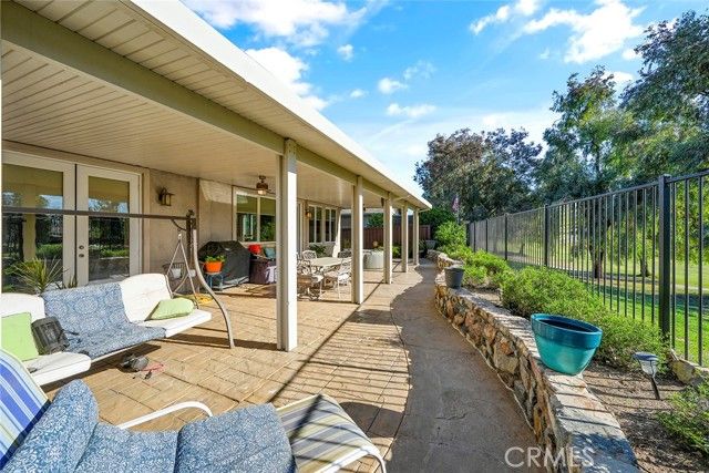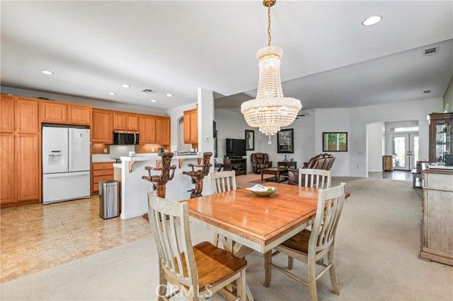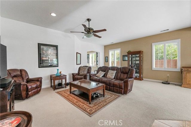 Welcome to Four Seasons Hemet! This Beautiful 3 Bedroom 2 Bath, 2024 Square foot home sits right on the scenic 18th fairway! This beautifully maintained home offers one of the most peaceful and desirable golf-course settings in all of Four Seasons Hemet. A bright open floor plan, and modern energy upgrades including solar and battery backup, this home blends comfort, efficiency, and resort-style living. Inside, the layout flows effortlessly from the spacious living room to the dining area and kitchen, creating an ideal environment for entertaining or relaxing. The kitchen features warm caramel cabinetry, stainless steel appliances — and a view that opens toward the backyard and golf course. Plantation shutters, and soft indirect lighting add to the elegant, inviting feel throughout the home. The primary suite is a true retreat, with French doors that open directly to the serene golf-course view. The ensuite bath includes a Jacuzzi soaking tub, upgraded cabinetry with dramatic granite counters, and dual walk-in closets. Two additional bedrooms — lightly lived in and flexible for guests, office use, or hobbies — provide valuable versatility. Outside, a large alumawood covered patio spans the back of the home, offering shaded comfort all day long while you take in the sweeping views of the fairway, mature shade trees, and colorful rock-wall landscaping. It’s the perfect spot for morning coffee, afternoons with friends, or simply unwinding in the evening breeze. A spacious two-car garage with golf-cart parking and charging capability completes this exceptional home. Residents of Four Seasons enjoy 24/7 security and access to a 23,000-square-foot lodge featuring a bistro, fitness center, beauty salon, movie theater, ballroom, billiards, card room, library, and computer room. Outdoor amenities include a heated pool and spa, covered BBQ areas, tennis, pickleball, bocce ball, and shuffleboard courts — all set among the beautifully maintained Hemet Golf Course. Whether relaxing on the patio watching golfers approach the 18th green or participating in the community’s many social and recreational activities, this home offers the lifestyle you’ve been waiting for — peaceful, comfortable, and perfectly located. professional photos coming