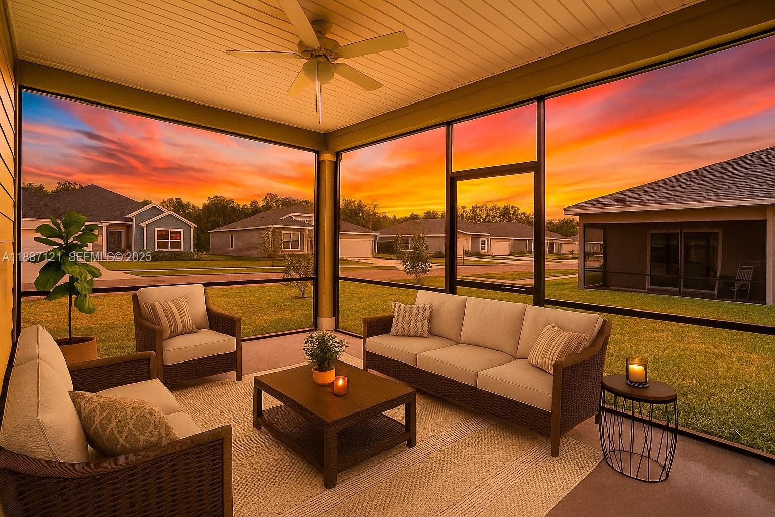 Step into low-maintenance living in this 2023-built Halle Model located in Liberty Village, a 55+ active adult community in Ocala. This move-in-ready home offers 3 bedrooms, 2 baths, plus a flex/den (possible 4th bedroom, no closet). Open layout with 9’ ceilings, recessed lighting, wood-look tile, and great natural light. Kitchen features quartz countertops, 42” cabinets with crown molding, and Frigidaire appliances. Interior laundry includes washer, dryer, sink, and cabinetry. Enjoy a screened lanai and corner lot with room for a future pool. Low HOA includes internet and cable. Community amenities include pool, pickleball, shuffleboard, and bocce. Convenient to I-75, shopping, dining, medical facilities, and local parks and recreation. Ideal for full-time or seasonal Florida living.