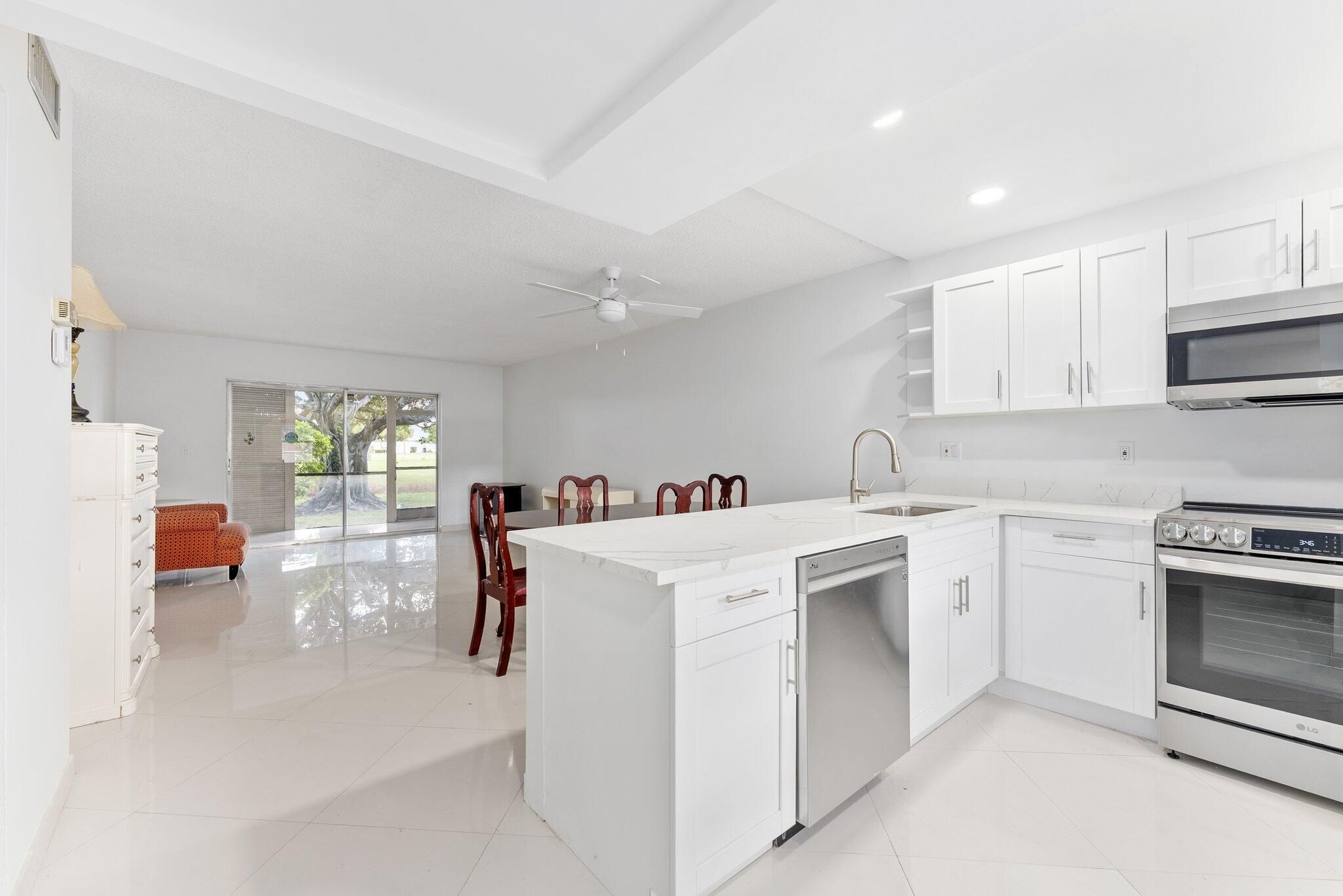 Renovated & open, move-in ready ground-floor condo with tranquil views of the Oriole Golf Course. 2BD/2BA First-floor, ground-entry unit featuring an open modern kitchen, tile flooring, fully renovated. Spacious walk-in closets with built ins. All renovations completed with permits by a licensed contractor. Well-maintained 55+ community offering heated pool, fitness center, game room, social room with events and movie nights, shuffleboard, billiards, BBQ area, and bike storage. Includes 1 assigned parking space and 1 storage unit. Condo fees include; water/utilities, bundled TV and internet, routine pest control, professional property management and landscaping.