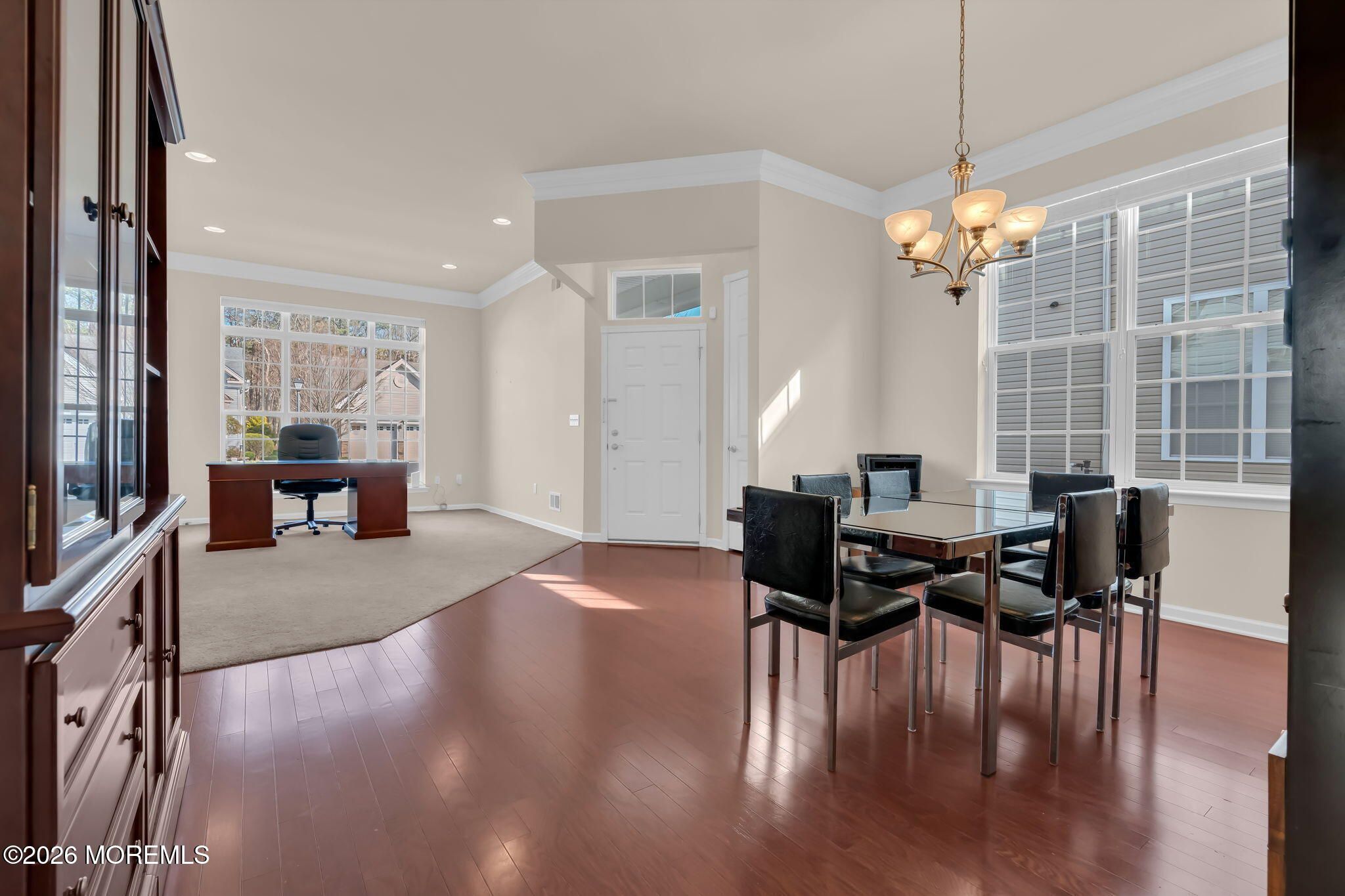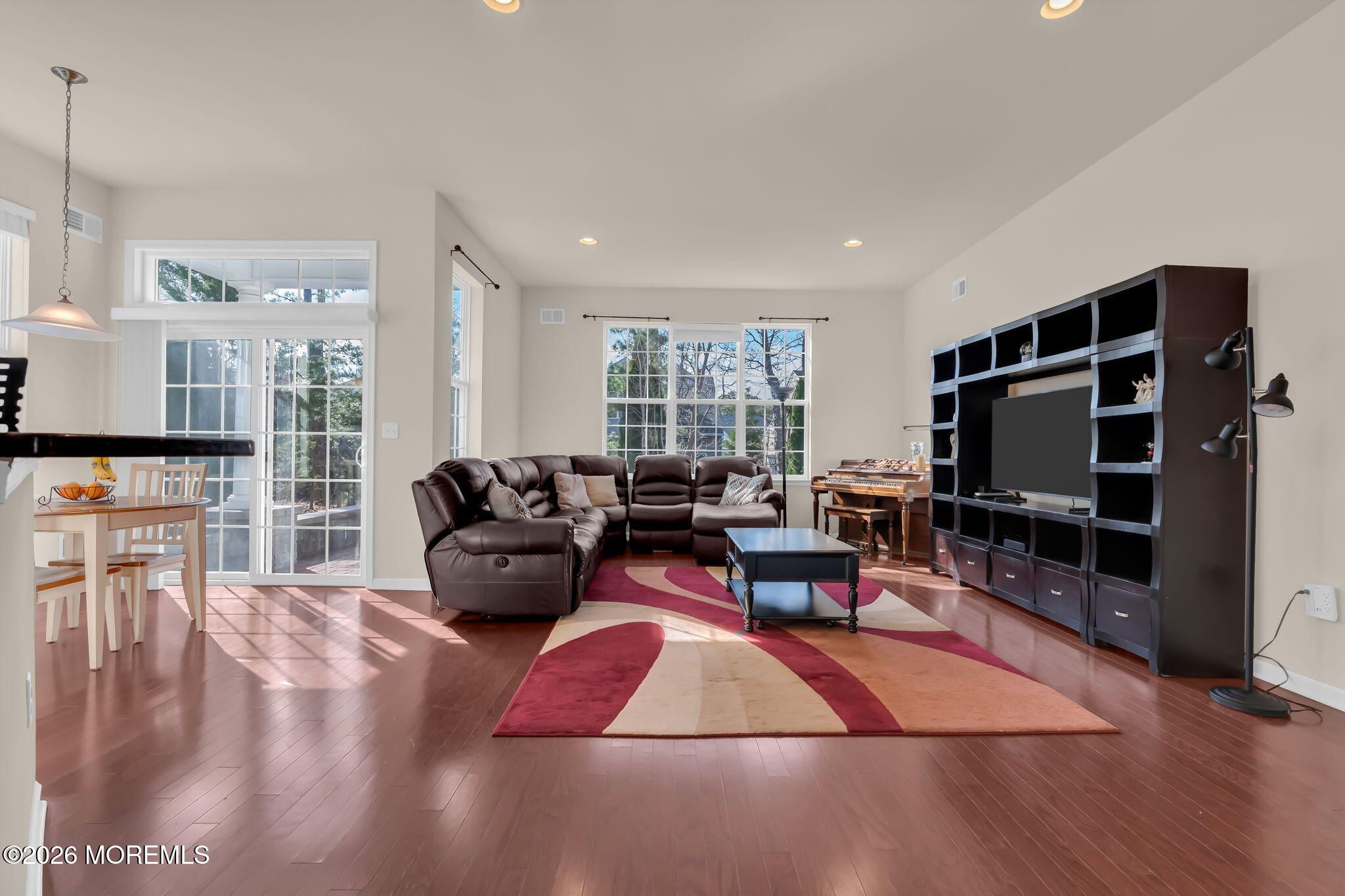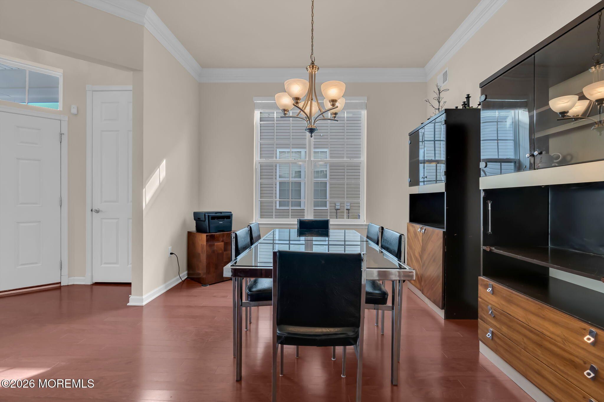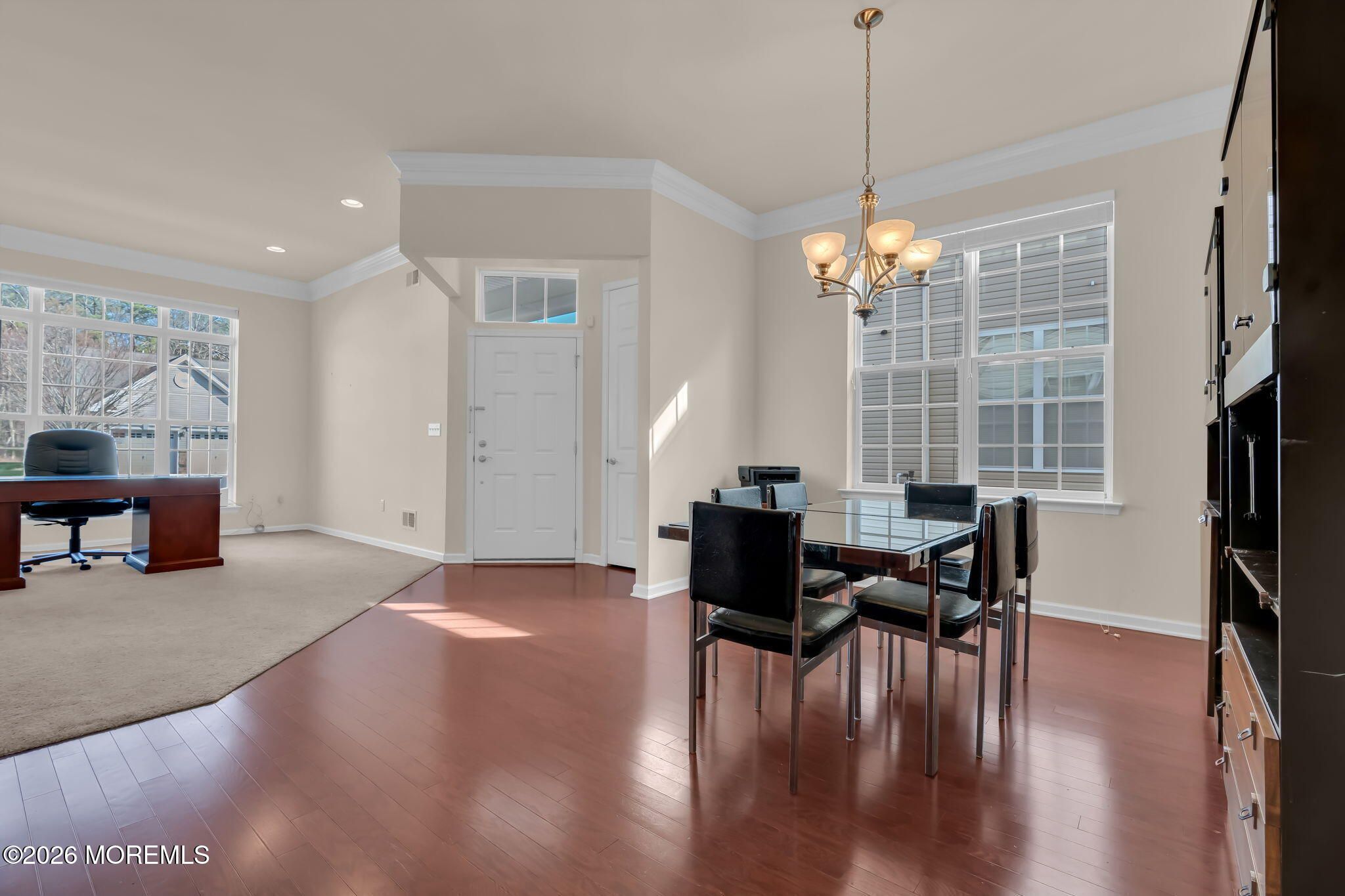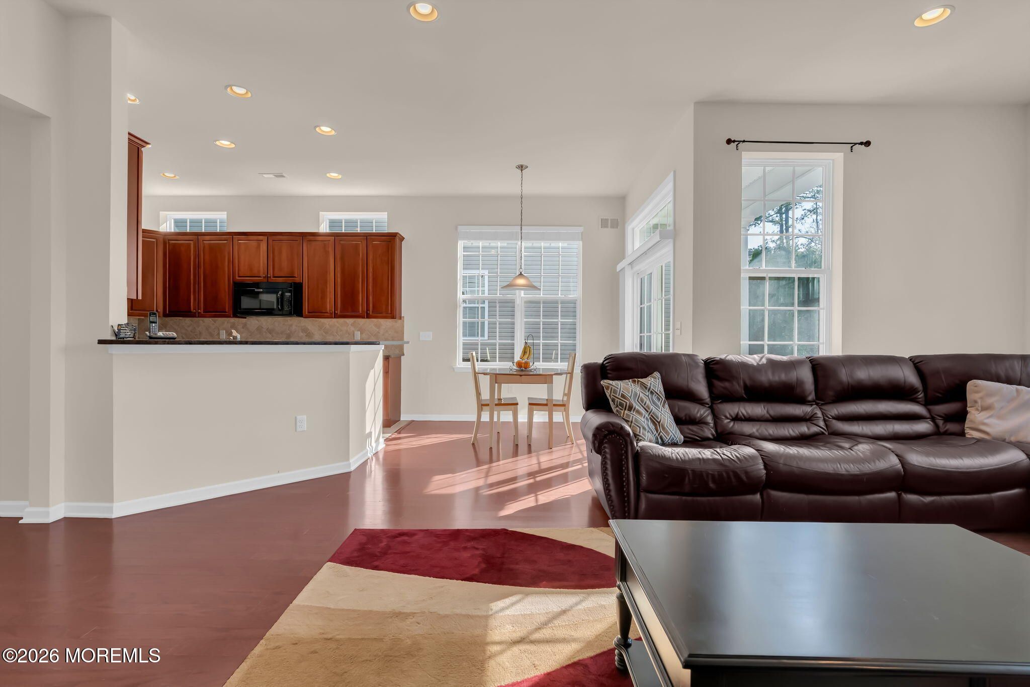 Check out this pristine Norwich model in the resort-style Sea Breeze 55+ community in Forked River, offering 2 bedrooms, 2 full bathrooms, and a 2-car garage. From the moment you arrive, you'll notice the great curb appeal with stunning landscaping. Step inside to find decorative molding, hardwood flooring, recessed lighting, and custom blinds throughout. The home opens to a spacious dining area with an adjacent bonus space, perfect for a home office. The eat-in kitchen features granite countertops, 42-inch cabinets, a breakfast counter, and a dining area with sliding doors leading to the patio. The cozy living room is spacious with ample natural light. The expanded primary suite offers a tray ceiling, walk-in closet, and a private en suite bathroom with double sinks, a full tile shower, and tile flooring. A laundry room is located off the garage. Outside, there is a paver patio with a paver wall, all backing to a peaceful walking path. Residents of Sea Breeze can enjoy a clubhouse, fitness center, pickleball and tennis courts, pool, lawn maintenance, and more. Don't miss the opportunity to own this turnkey home!
