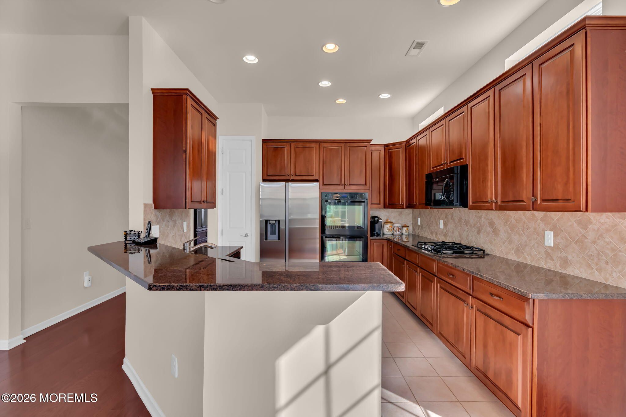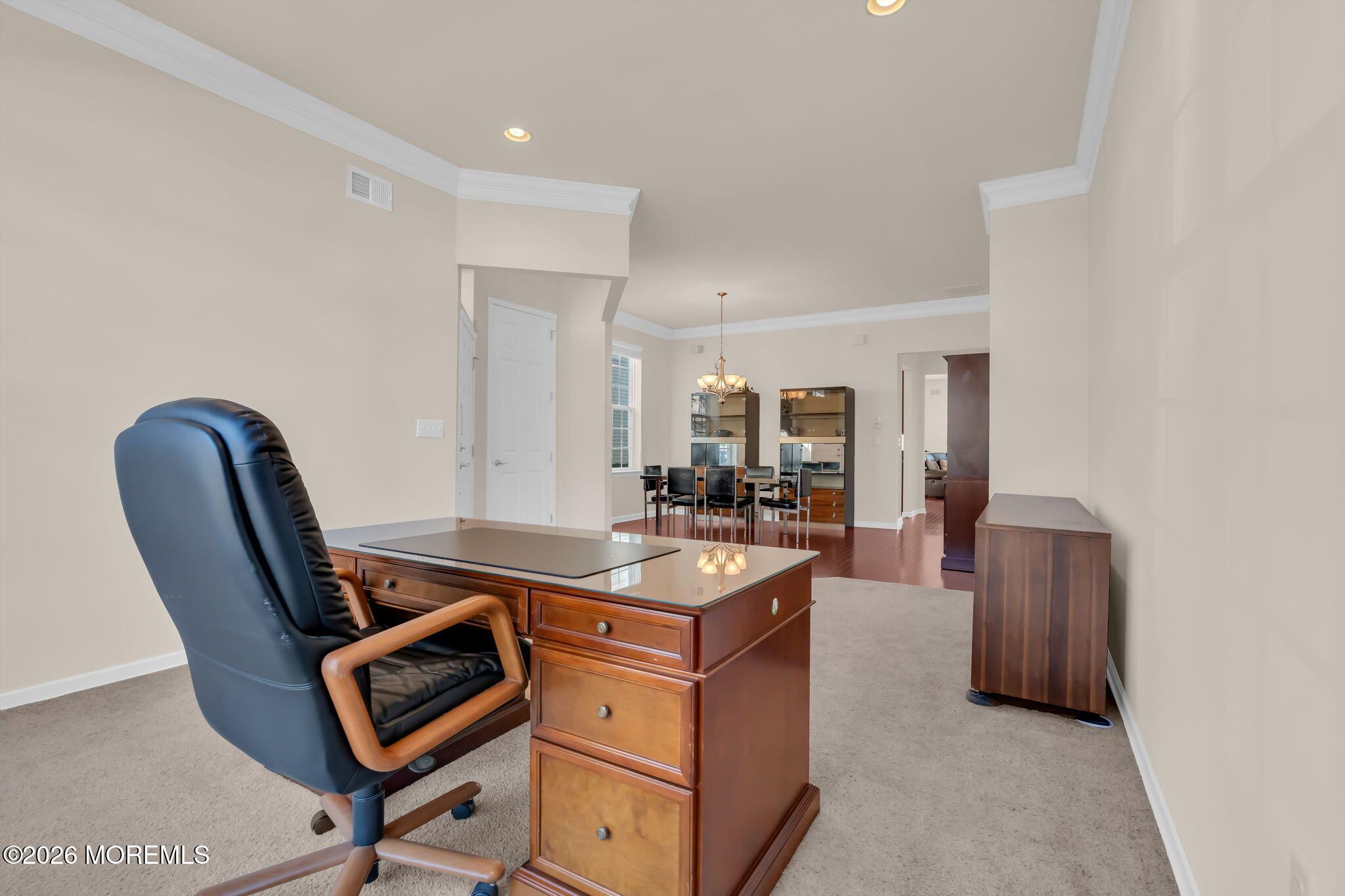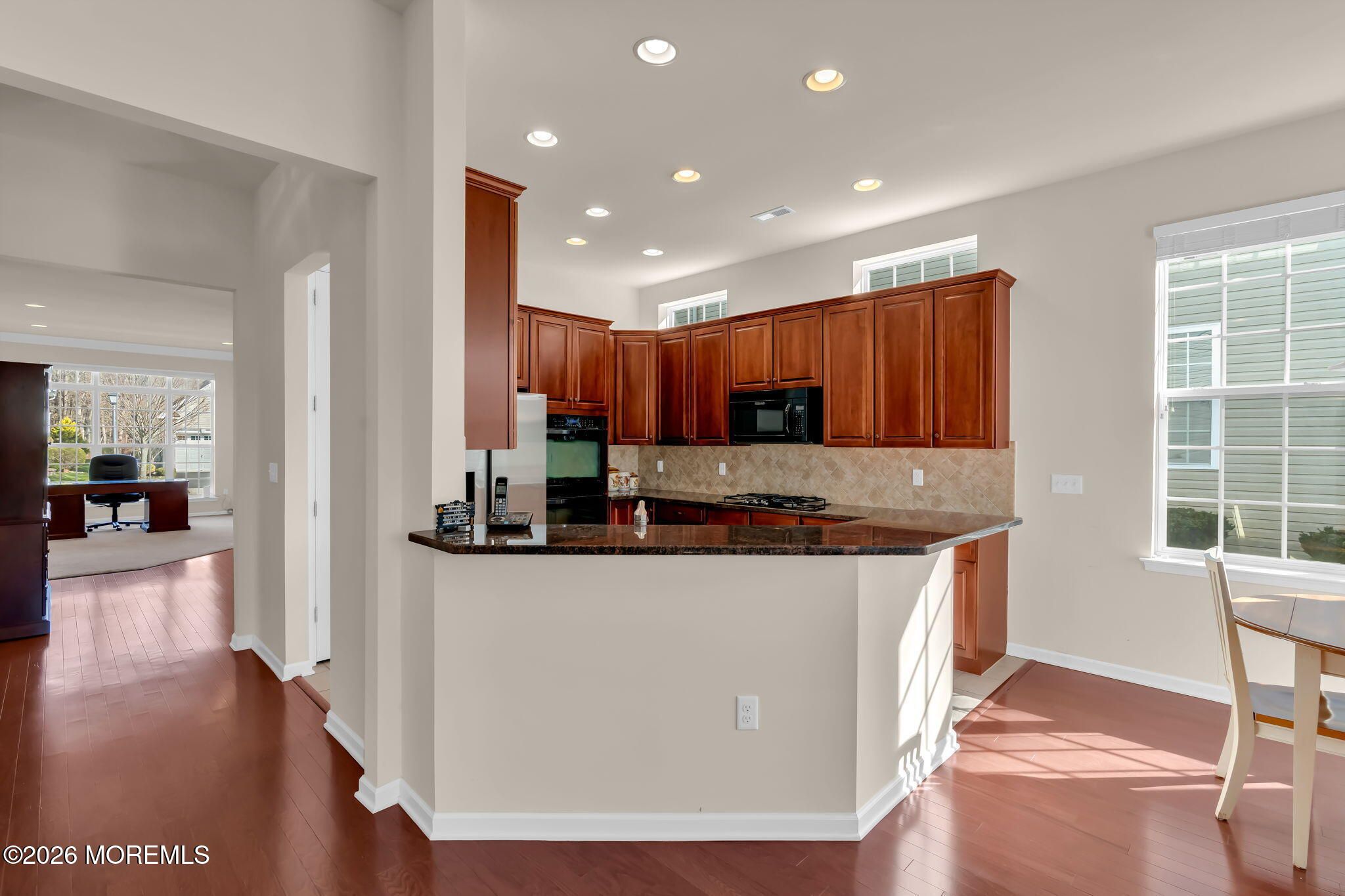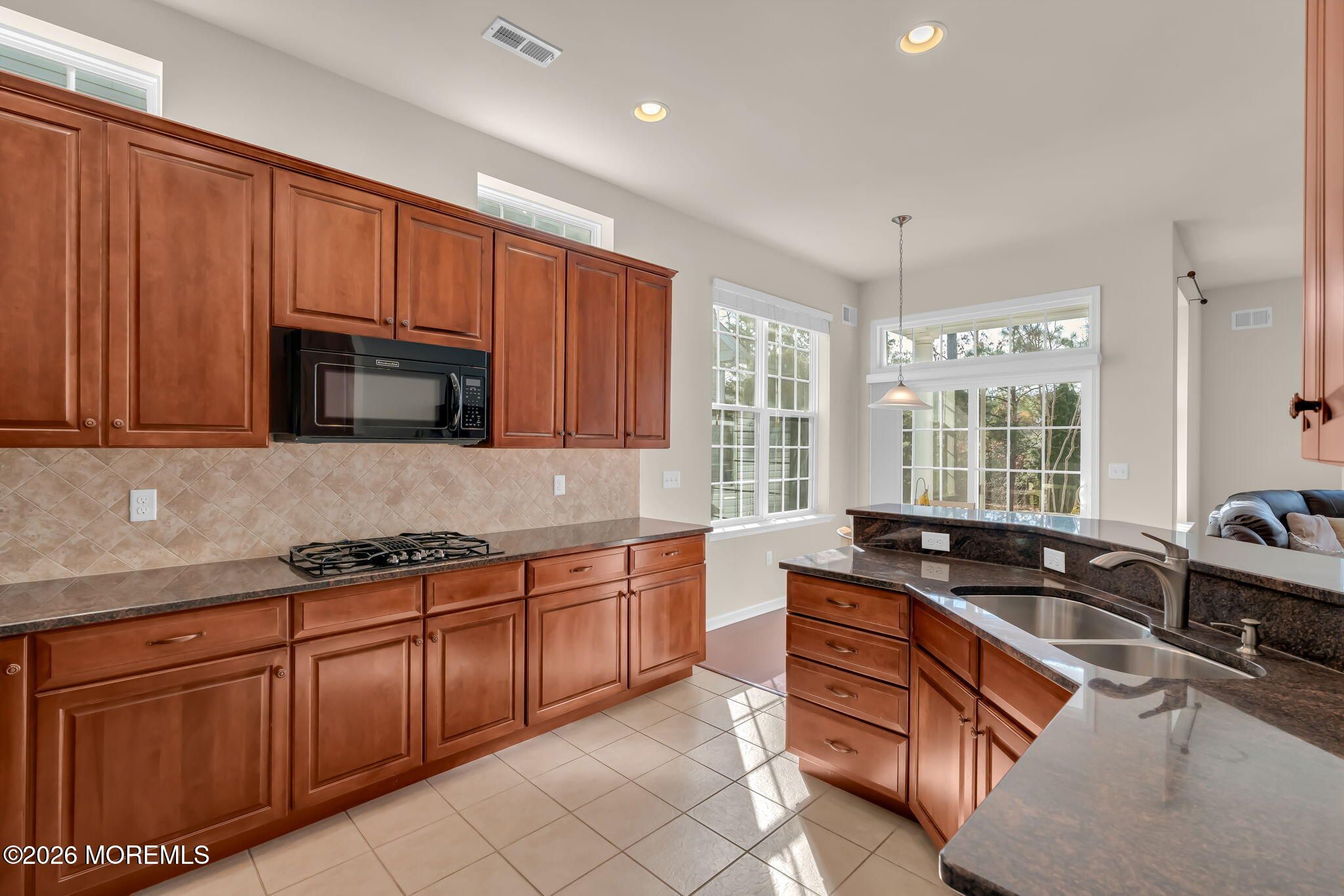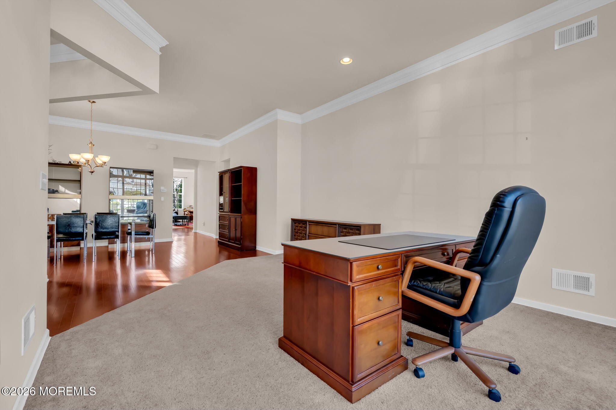 Check out this pristine Norwich model in the resort-style Sea Breeze 55+ community in Forked River, offering 2 bedrooms, 2 full bathrooms, and a 2-car garage. From the moment you arrive, you'll notice the great curb appeal with stunning landscaping. Step inside to find decorative molding, hardwood flooring, recessed lighting, and custom blinds throughout. The home opens to a spacious dining area with an adjacent bonus space, perfect for a home office. The eat-in kitchen features granite countertops, 42-inch cabinets, a breakfast counter, and a dining area with sliding doors leading to the patio. The cozy living room is spacious with ample natural light. The expanded primary suite offers a tray ceiling, walk-in closet, and a private en suite bathroom with double sinks, a full tile shower, and tile flooring. A laundry room is located off the garage. Outside, there is a paver patio with a paver wall, all backing to a peaceful walking path. Residents of Sea Breeze can enjoy a clubhouse, fitness center, pickleball and tennis courts, pool, lawn maintenance, and more. Don't miss the opportunity to own this turnkey home!