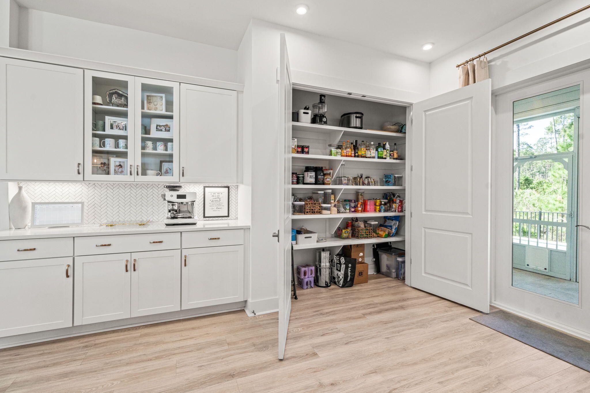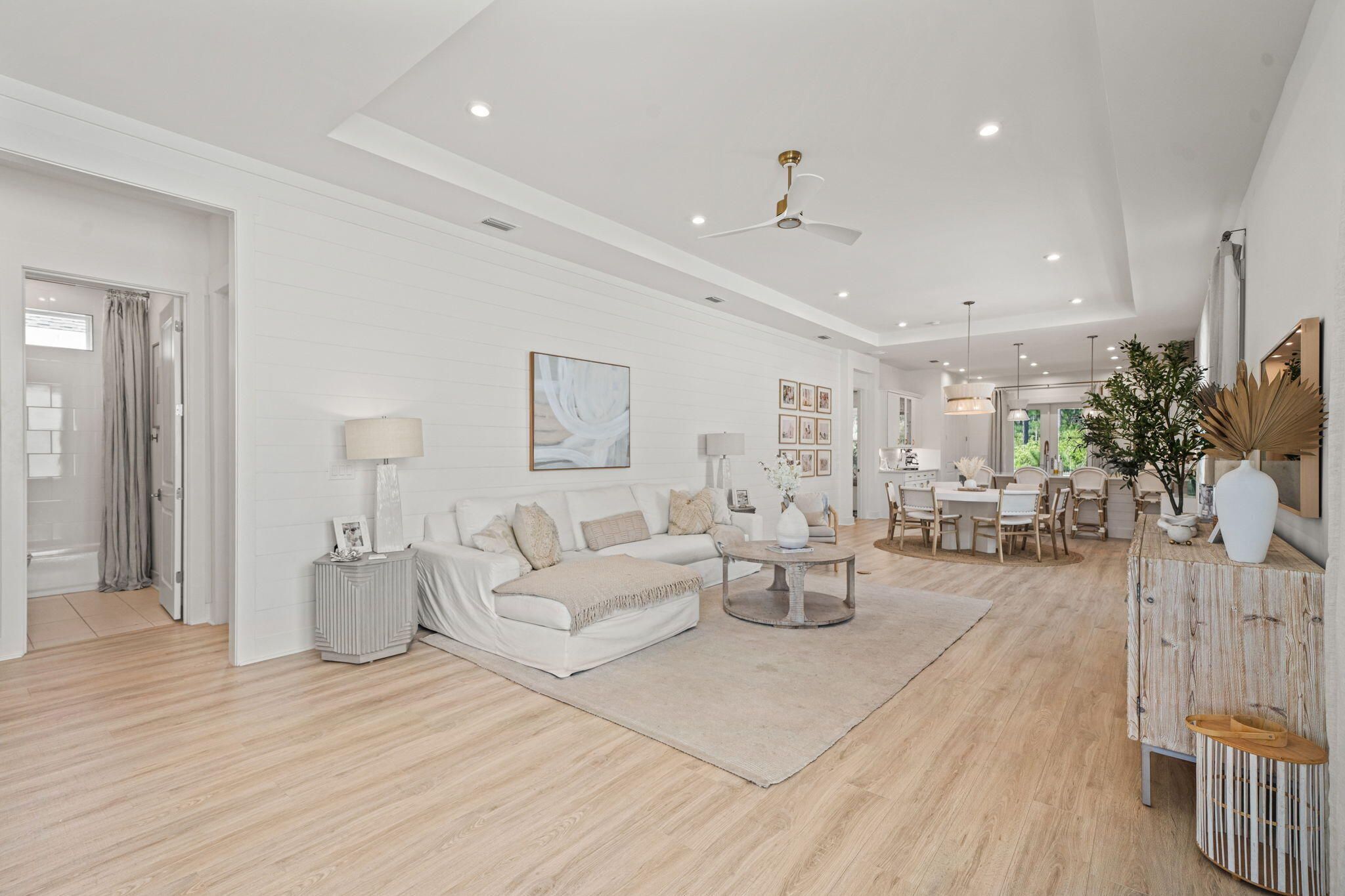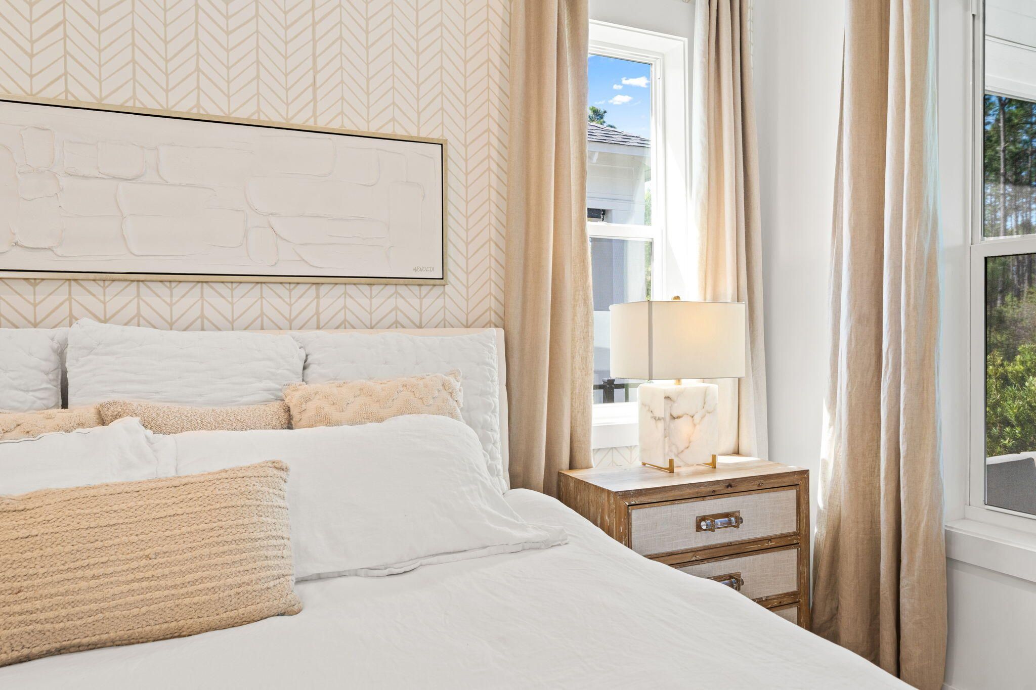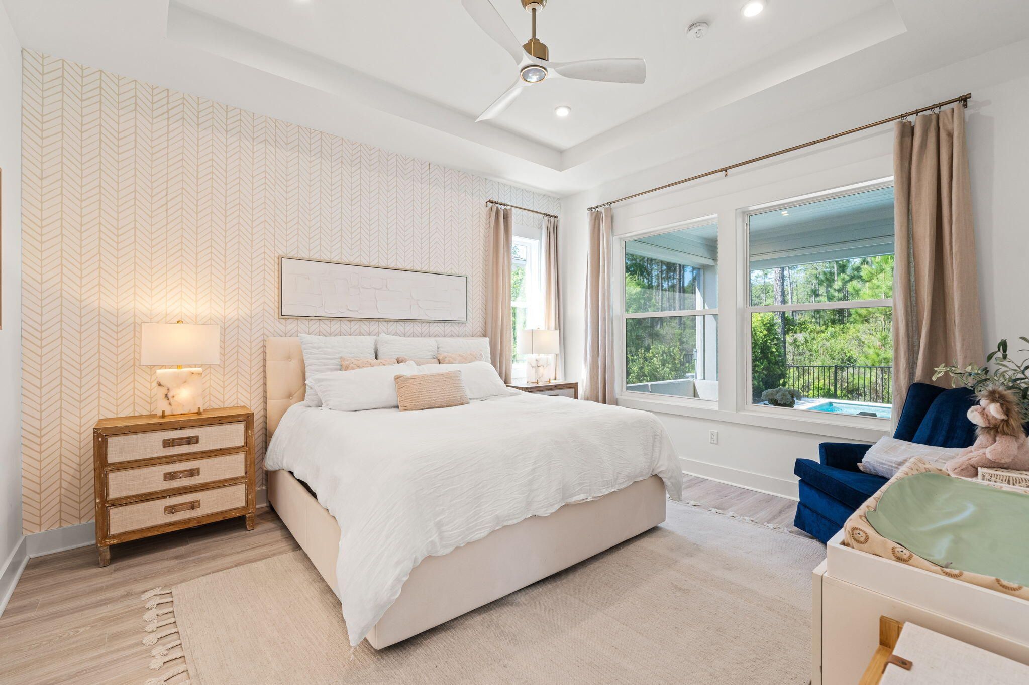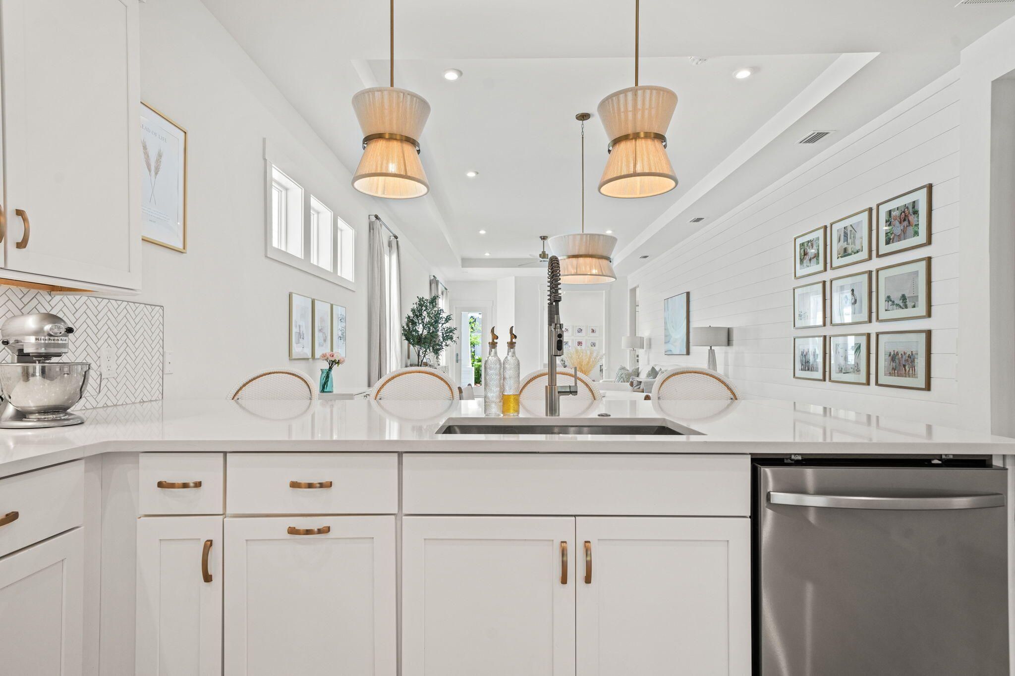 Nestled within the coveted NatureWalk at Watersound Origins, this impeccably designed 2022-built Clearwater floor plan blends coastal sophistication with everyday luxury. An open-concept great room and dining area features soaring tray ceilings, shiplap accent walls, and wide-plank hardwood floors. The chef's kitchen shines with white shaker cabinetry, brushed gold hardware, herringbone tile backsplash, stainless appliances, gas range, and a generous island with breakfast bar. The primary suite overlooks the covered lanai and offers dual vanities, a glass-enclosed shower, and a custom walk-in closet. A private second bedroom wing plus additional flex spaces serve as a home office, playroom, or guest retreat. Step outside to a private pool with travertine decking, outdoor kitchen, and serene pine-tree backdrop. Residents enjoy resort-style amenities including a community pool, clubhouse, fitness center, playground, and golf - all minutes from the sugar-white sands of 30A.