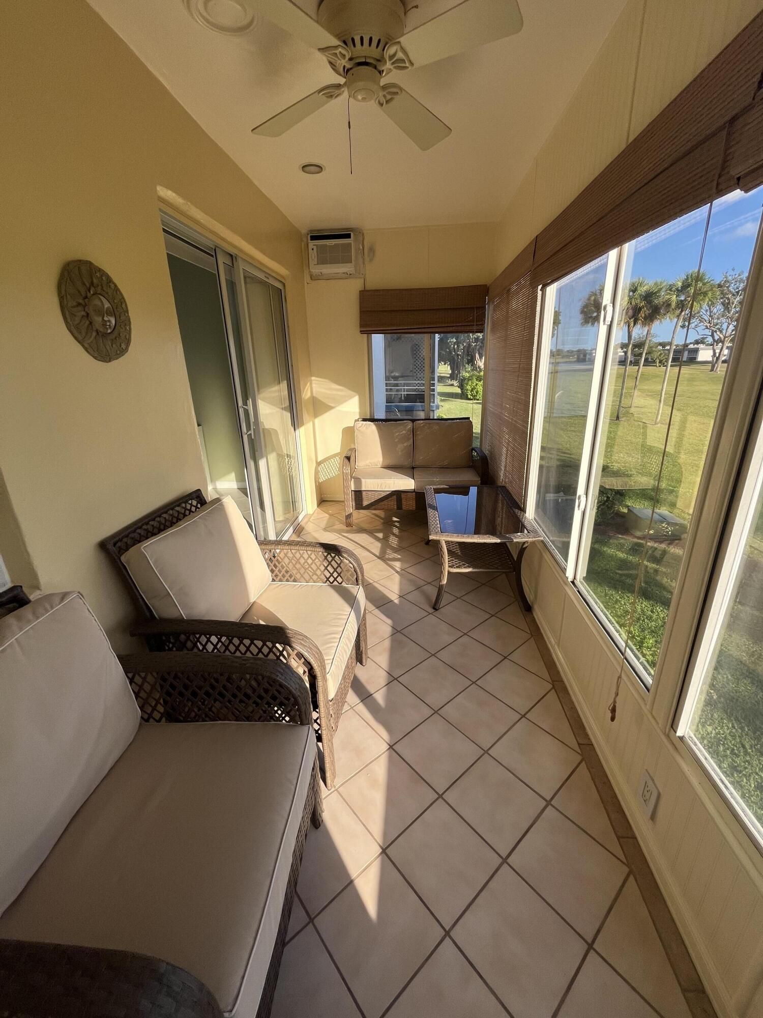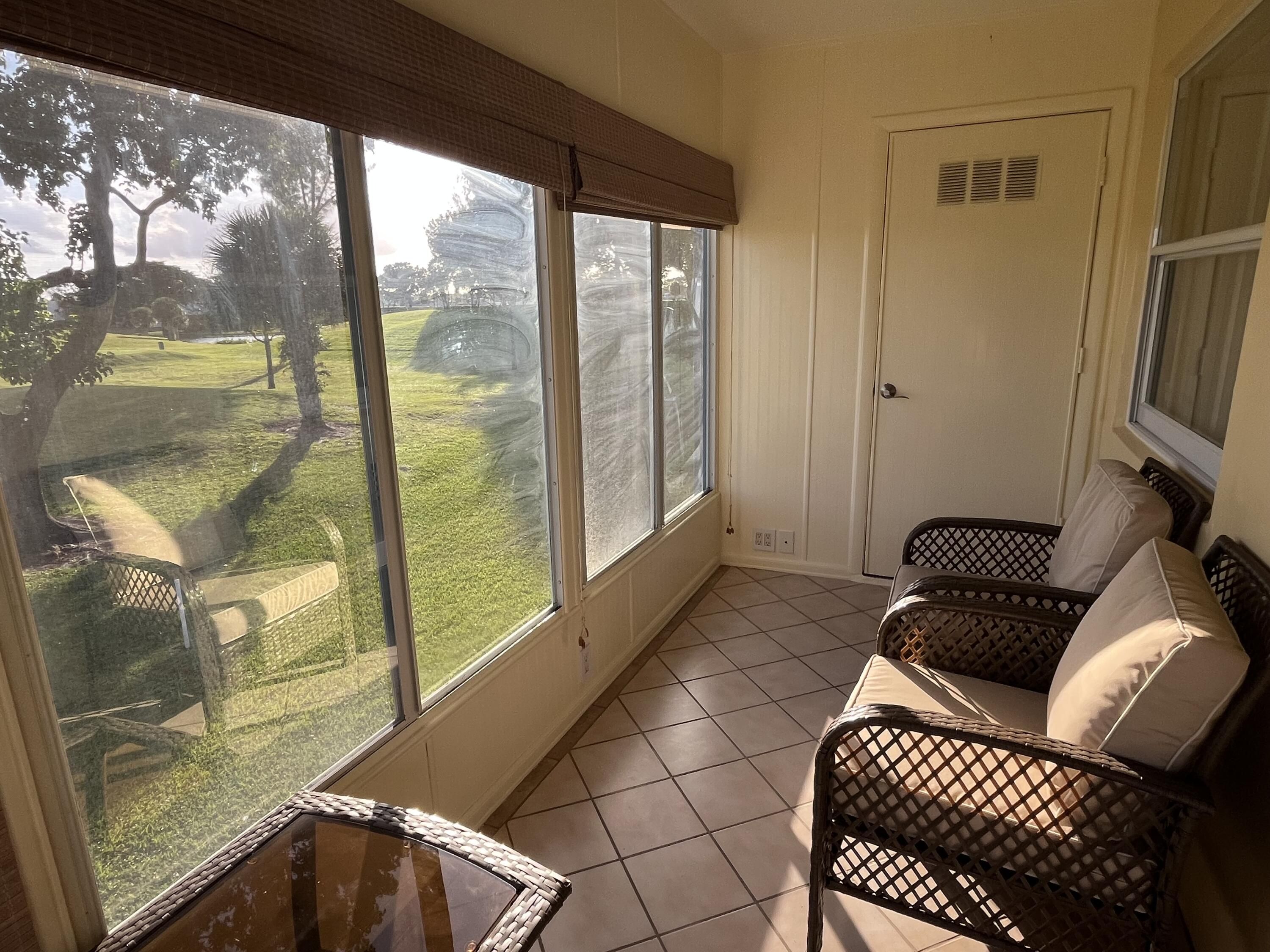 Best view in all of Kings Point. Spectacular golf course and lake views as expansive as your eyes can view! Southern exposure from your enclosed patio with slider windows that open to a seasonal cool breeze screeened in. The tiled patio also has a window a/c unit that runs off of it's own electrical circuit located in the utility closet (where your side by side washer/dryer is found) Neutral colored ceramic tiling adorns the floorng throughout. Both bathroom ceilings have recessed lighting. Primary bathroom with stall shower area updated wall tiling. Unit comes furnished as seen.
