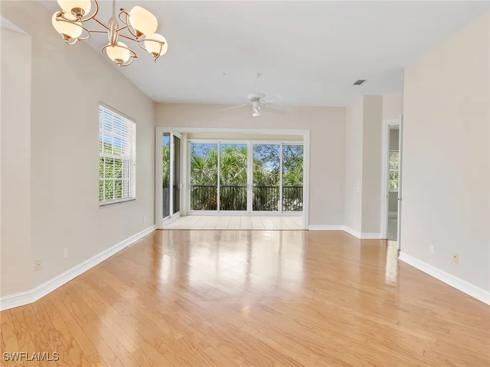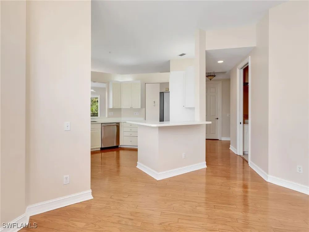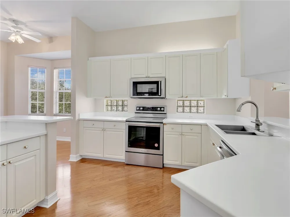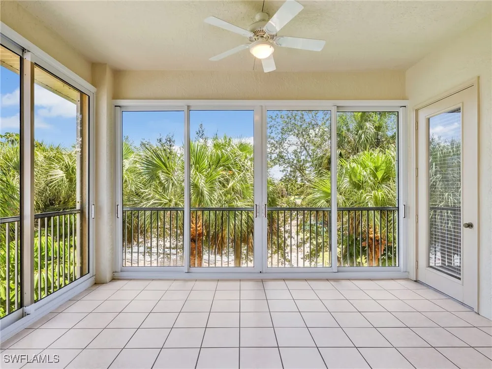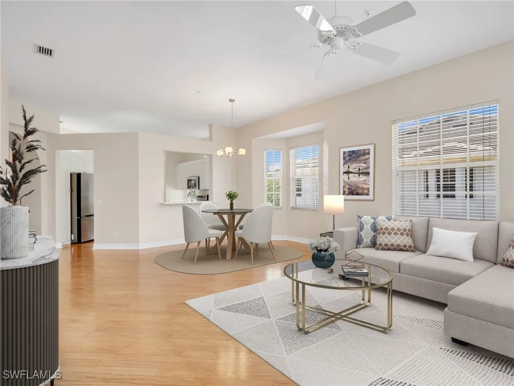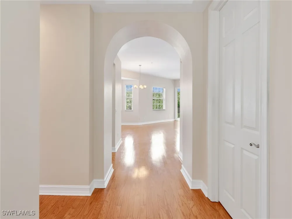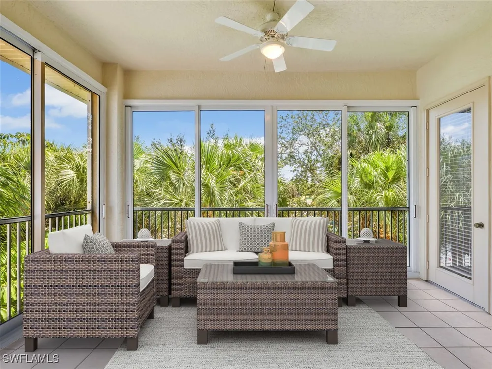 Welcome to this beautifully maintained, spacious 3 bedroom, plus den, 2 and one half bathroom condo located in the heart of North Naples. Nestled in the desirable Breakwater community of Pelican Bay, this second-floor end unit offers a light-filled open floor plan with almost 2,000 square feet of living space and serene, private views of lush tropical landscaping as well as a partial lake view. From the foyer, step into a bright and airy living area with gleaming hardwood floors, high ceilings, and a seamless flow from the dining space to the enclosed lanai. The expansive glass-enclosed lanai with sliding doors allows for year-round enjoyment of the Florida lifestyle while overlooking palm trees, mature greenery and partial lake. The kitchen features white cabinetry, solid-surface countertops, upgraded, newer, stainless steel appliances (refrigerator 2024, microwave, stove, dishwasher 2023), a breakfast bar, and a charming breakfast nook and den with bay windows. The spacious owner’s suite offers large windows, private lanai access, his and her walk-in closets, and a generous en-suite bath with dual vanities, a soaking tub, separate water closet, and a walk-in shower. Two additional, sizable bedrooms provide space for guests, a home office, or hobbies, and share a full guest bath. There is a convenient half bathroom right off the den for guests. Other features include large, in unit laundry with extra cabinets for storage and an oversized 2 car garage with ample storage. The freshly painted condo provides a neutral paint palette ready for your personal touch. The condo has been upgraded with hurricane impact doors and windows and had the outdated plumbing replaced in 2022. Breakwater is located less than 1 mile from the North Tram of Pelican Bay to bring you to the north end beach and restaurant, Marker 36. Here you will find one of the airy, bright, open restaurants, allowing you to relax and take in gorgeous views of nature, beautiful white sand beaches, and, the breathtaking Naples sunset while savoring quick bite or a complete meal with a full bar. Or just relax on the beach under an umbrella, on a lounger provided for the residents. Breakwater also provides a private gate, just steps away, to the nearly finished, brand new Pelican Bay community park. This park will have racquetball, bocce, basketball and clay tennis courts. A playground, walking trail system, pavilion, softball and soccer field are almost complete. Located just minutes from Naples' award-winning beaches, world-class dining, shopping, and golf, this condo is ideal as a year-round residence, vacation home, or investment property. Don't miss your opportunity to own this piece of paradise in one of Naples’ most peaceful communities.
