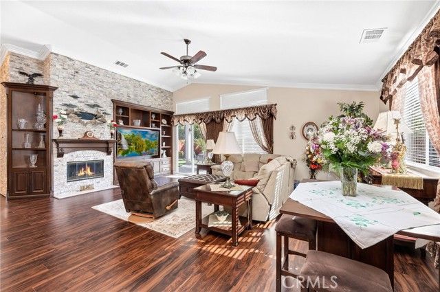 Situated within the 55+ guard-gated community of Four Seasons at Hemet, this highly sought-after and popular floorplan offers the perfect blend of functionality, comfort, and upscale finishes. This home within the tract has the additional savings bonus of NO MELLO-ROOS. With 2 spacious bedrooms plus a versatile den that can easily serve as a third bedroom, hobby room, or home office, this layout is one of the community favorites due to its open flow, generous living areas, and thoughtful separation of space. From the moment you arrive, the upgraded curb appeal sets the tone. The front elevation features custom flagstone accents, a river rock design element, and low-maintenance artificial turf, creating a polished and water-conscious landscape. Inside, the home showcases high ceilings, elegant crown moulding, and wood laminate flooring throughout most of the interior, enhancing both continuity and visual appeal. The expansive living room is centered around a fireplace with custom flagstone surround and a beautifully crafted built-in entertainment wall, offering both architectural interest and practical storage. The kitchen is designed for everyday living and entertaining alike, complete with granite countertops, a center island, stainless steel appliances, and abundant cabinetry. The open-concept design allows seamless interaction between the kitchen, dining, and living areas—one of the reasons this floorplan remains in high demand within the community. Significant system upgrades provide long-term value and peace of mind, including a recently replaced A/C system (May 2024) and furnace (March 2023). The home is equipped with solar under a power purchase agreement, with the seller reporting no current monthly payment to the solar provider. Additionally, a Tesla battery backup system is installed in the garage for added energy efficiency and reliability. The garage itself is upgraded with epoxy flooring and built-in storage cabinets, creating a clean, organized workspace. In the backyard, you’ll find a large Alumawood patio cover, providing shaded outdoor living space ideal for relaxing or hosting gatherings year-round. Residents of Four Seasons enjoy resort-style amenities including a clubhouse, fitness center, pool and spa, tennis courts, pickleball, walking trails, and a full calendar of social activities—all for a reasonable HOA of $214 per month. The community is guard-gated and meticulously maintained, offering both security and an active lifestyle.