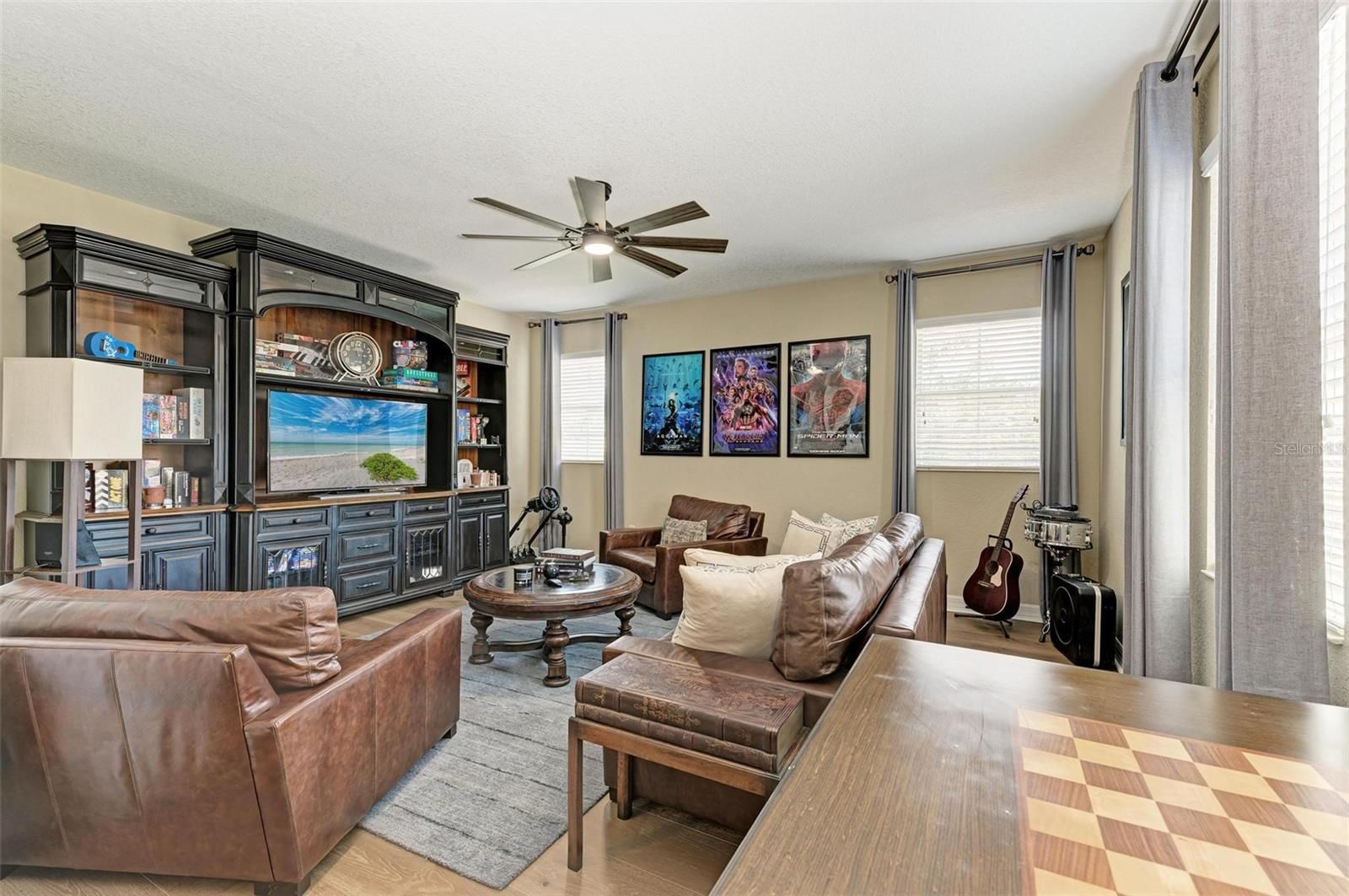- Ceiling Fan(s), Crown Molding, Eat-in Kitchen, High Ceilings, Kitchen/Family Room Combo, Upper Level Primary, Solid-Wood Cabinets, Split Bedrooms, Stone Counters, Vaulted Ceiling(s), Walk-In Closet(s)