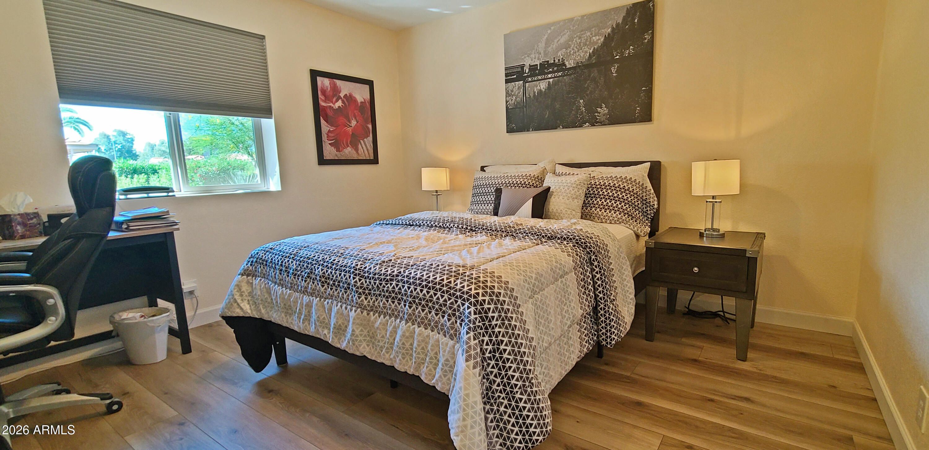 Turn-key living in coveted 55+ Sunland Village East - This move-in-ready home offers golf-course views from the front porch and sits steps from the clubhouse and restaurant. Recent upgrades include double-pane vinyl windows, a newer roof and wood-laminate flooring, a recently done kitchen that lends a modern feel and tastefully refreshed bathrooms. The living area flows to a south-facing patio and is ideal for morning coffee or an evening unwind. The attached garage includes built-in cabinets, an epoxy-coated floor and a spacious storage room that could double as a workshop or golf-cart garage. Low-maintenance landscaping frames both front and rear yards, and a separate Bill of Sale allows existing furniture to be acquired if desired. Enjoy a host of community amenities: An 18-hole golf course, clubhouse, pools, tennis and bocce courts, fitness center, softball field, shuffleboard, library, restaurant and more. A rare opportunity for relaxing resort-style living in Sunland Village East.
