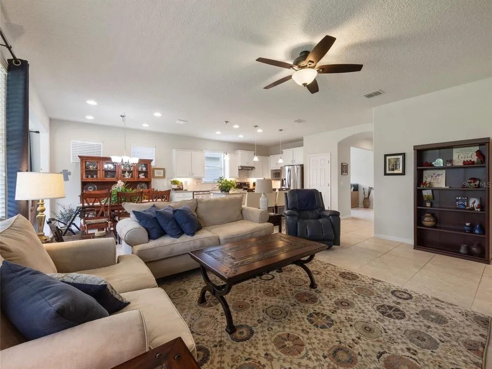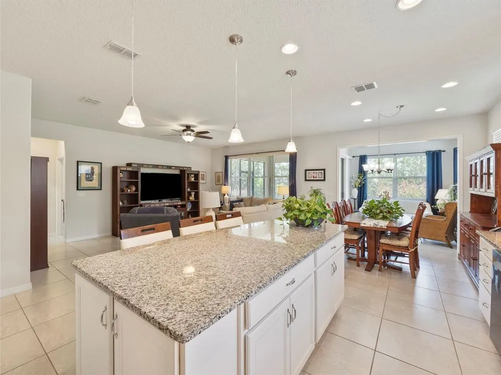- Ceiling Fan(s), Eat-in Kitchen, High Ceilings, In-Wall Pest Control, Kitchen/Family Room Combo, Living/Dining Room, Open Floorplan, Main Level Primary, Split Bedrooms, Stone Counters, Thermostat, Walk-In Closet(s), Window Treatments