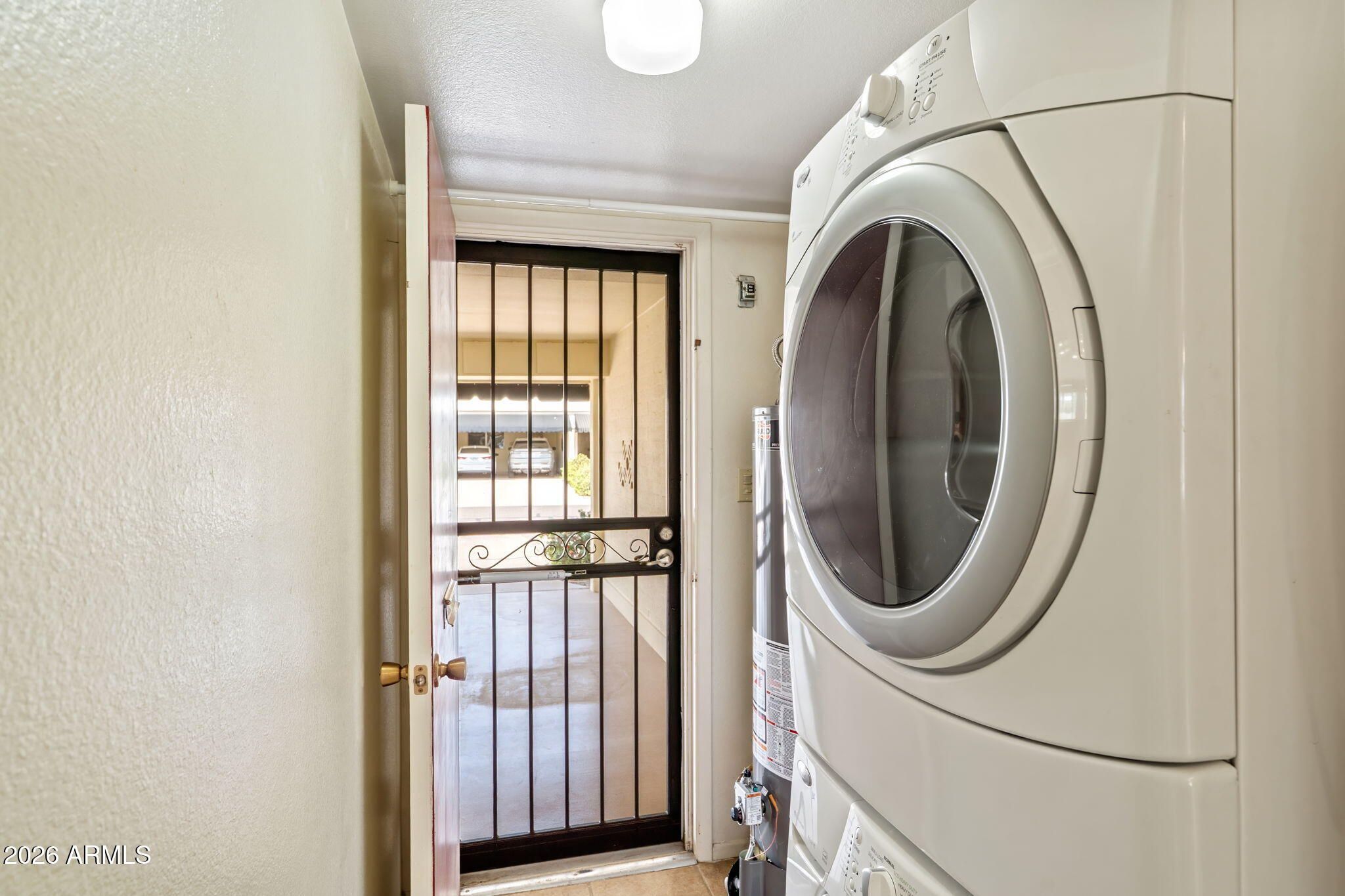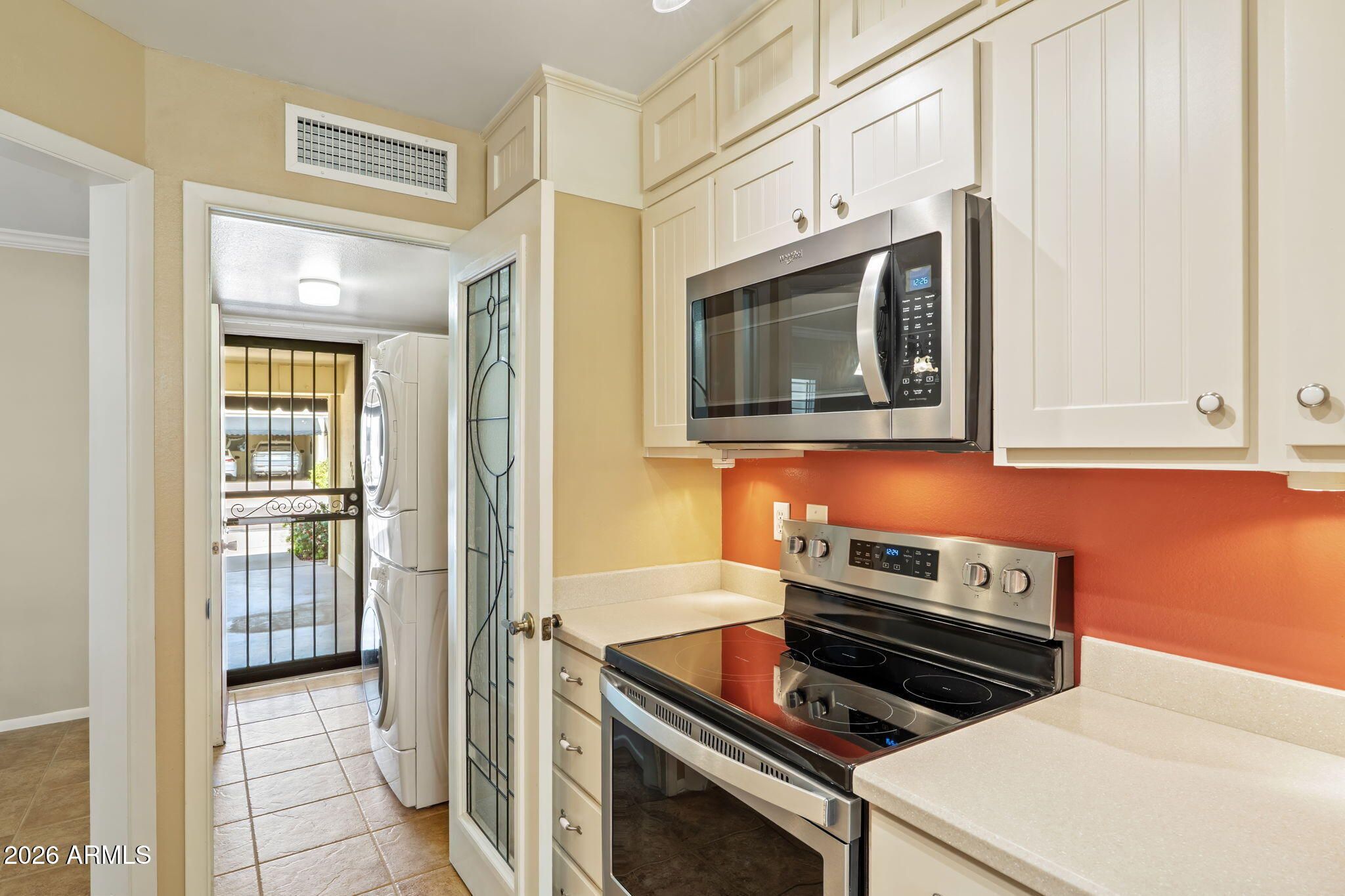 - Stacked Washer/Dryer, Dryer, Washer, Refrigerator, Built-in Microwave, Dishwasher, Disposal, Electric Range, Electric Cooktop