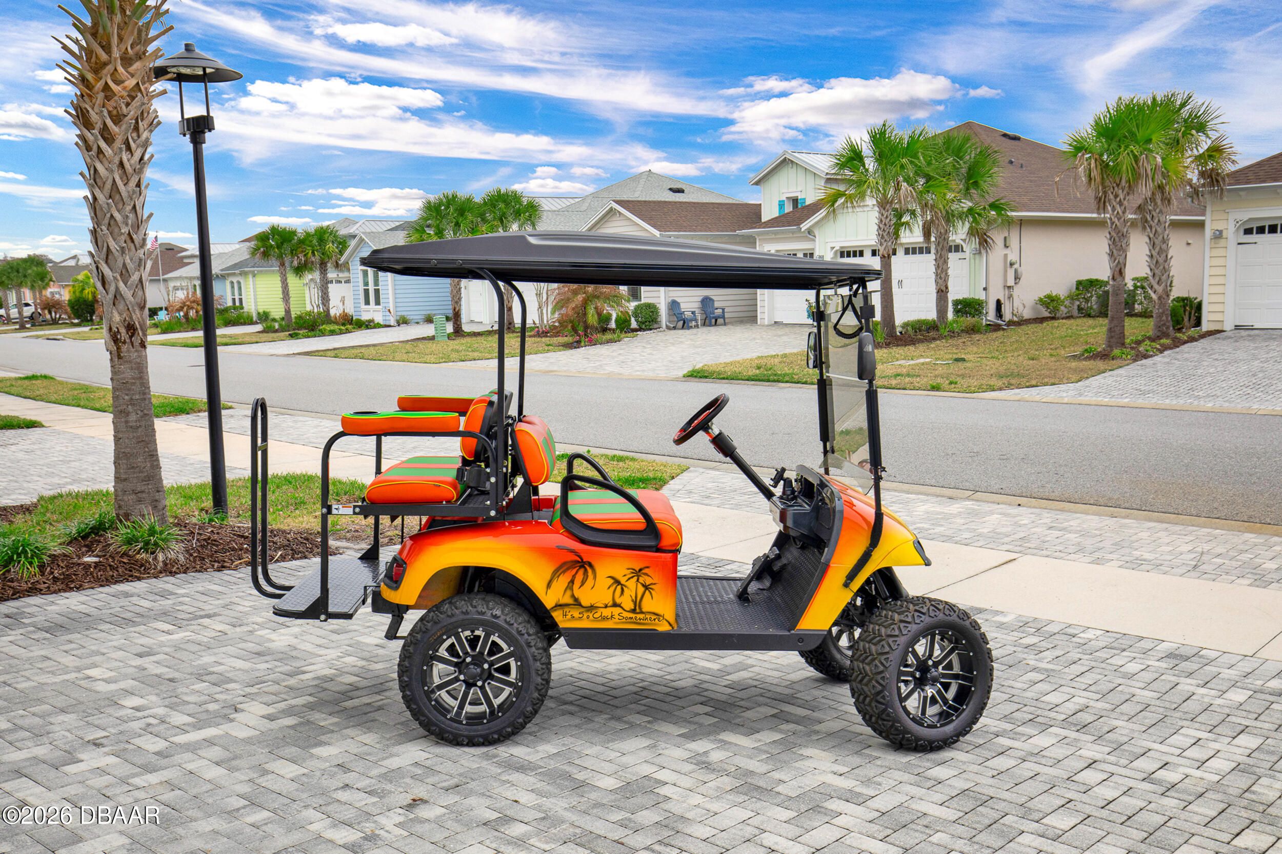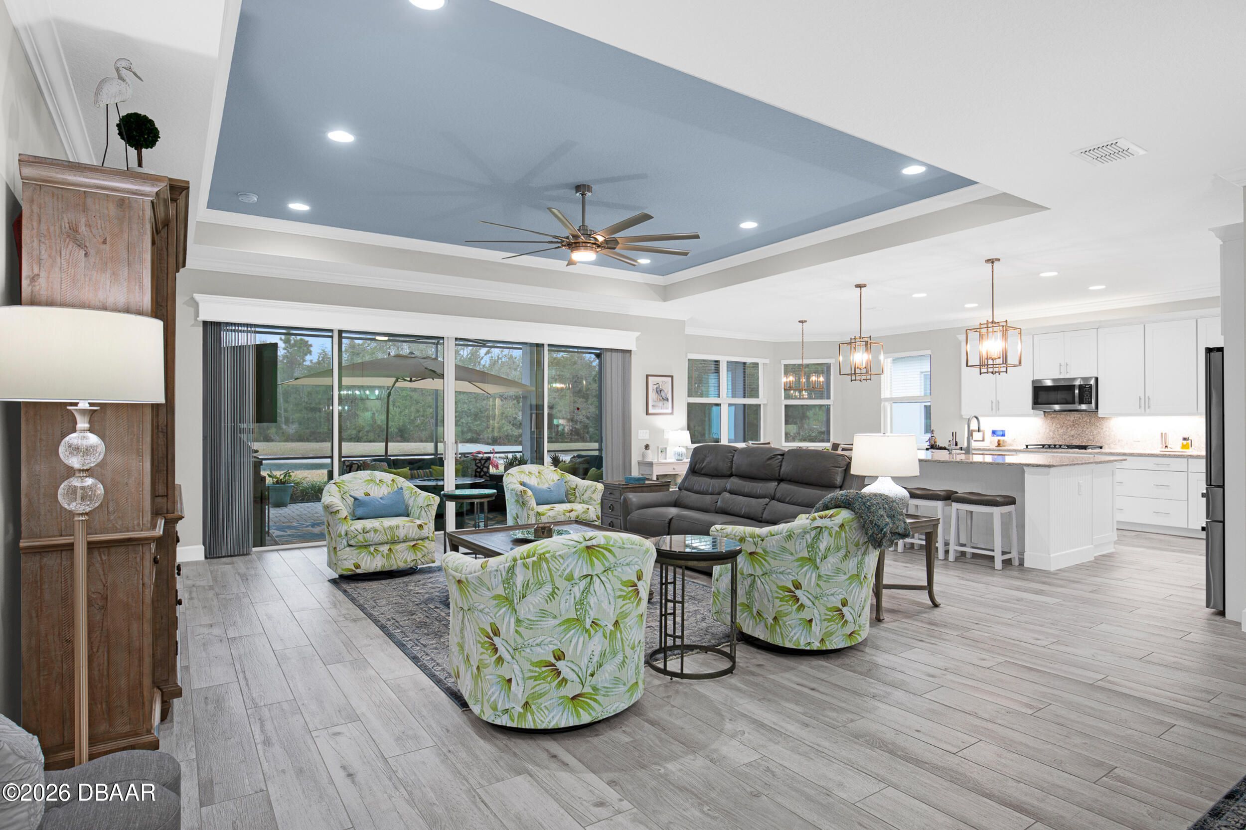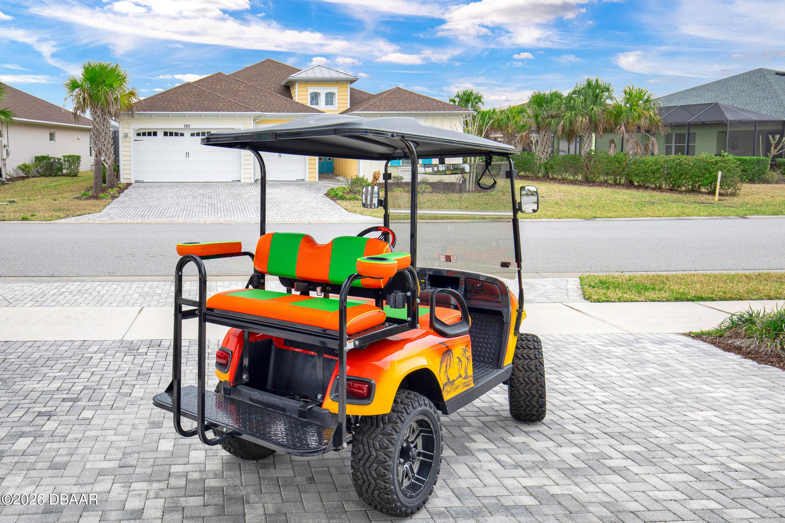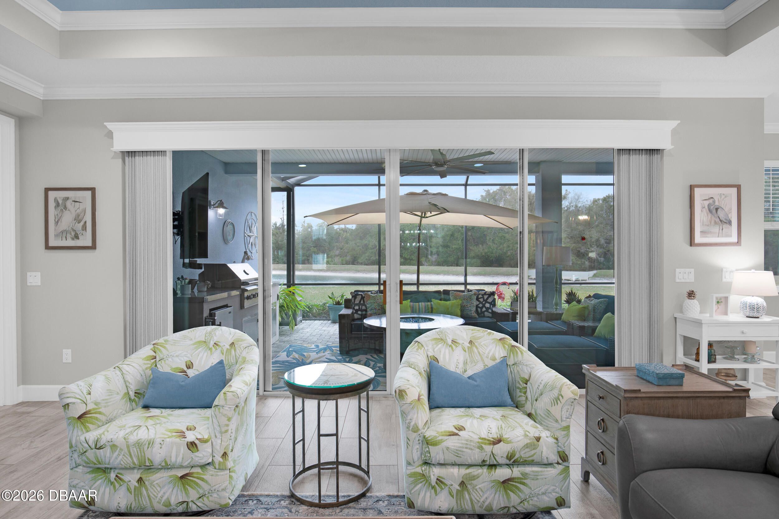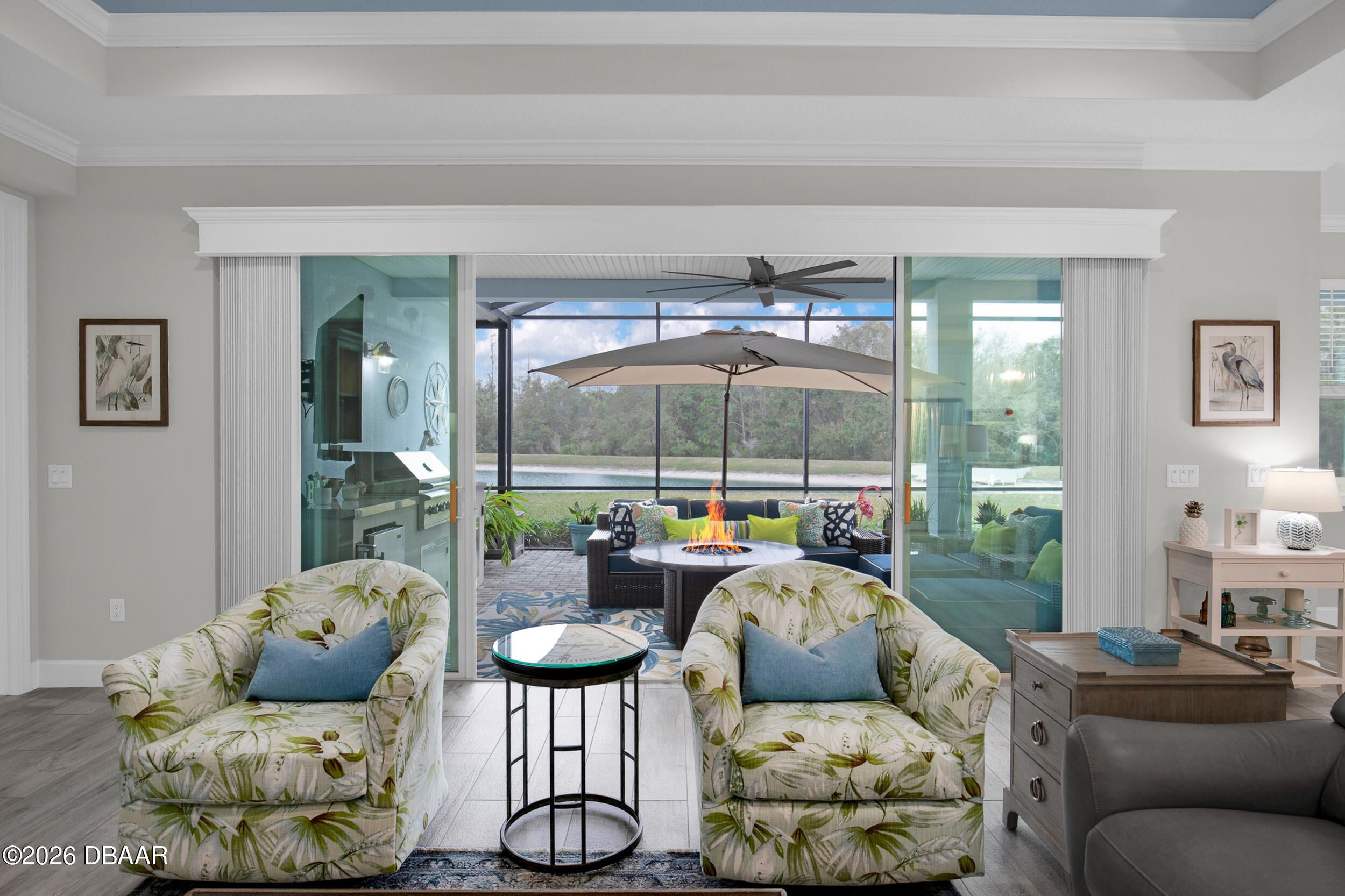 Welcome to the beautifully upgraded St. Bart model in Margaritaville, where every day feels like a getaway. This 3-bed, 3-bath home with a den blends refined finishes with relaxed coastal living. The gourmet kitchen features quartz countertops & backsplash, gas cooktop, double wall ovens & extensive cabinetry, lighting. Plank tile flooring & crown molding flow throughout, adding a polished touch to every room. The extended screened lanai becomes an outdoor retreat, complete with a full summer kitchen, beverage refrigerator & peaceful pond views- perfect for entertaining or unwinding. Thoughtful upgrades throughout elevate comfort & style including 8 ft doors, custom closets, spa like primary bath. Garage includes storage racks, extra fridge, surge protector & portable generator. GOLF CART INCLUDED. Residents enjoy a true resort lifestyle with the paradise pool, sport pool, pickleball, fitness center, on-site dining & convenient shuttle service to the private beach club & more.