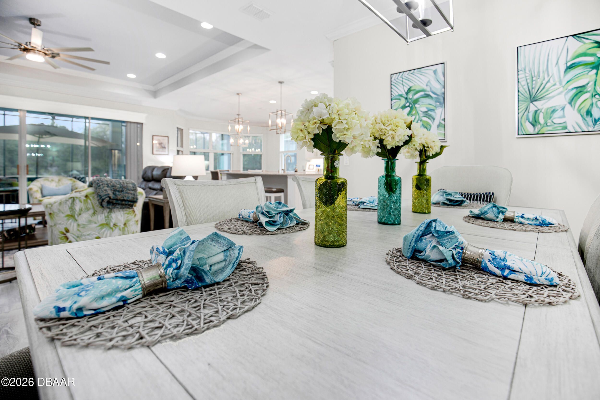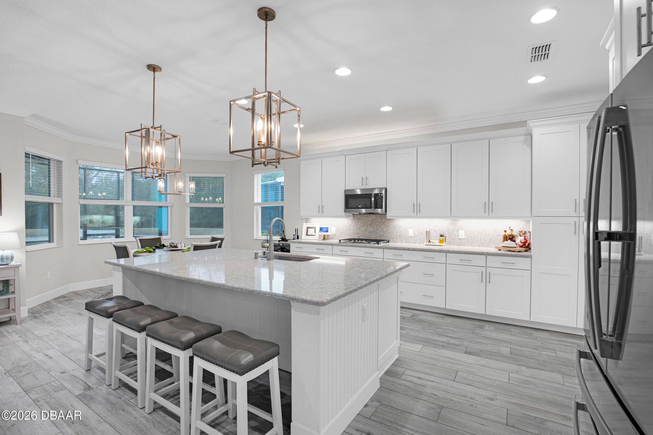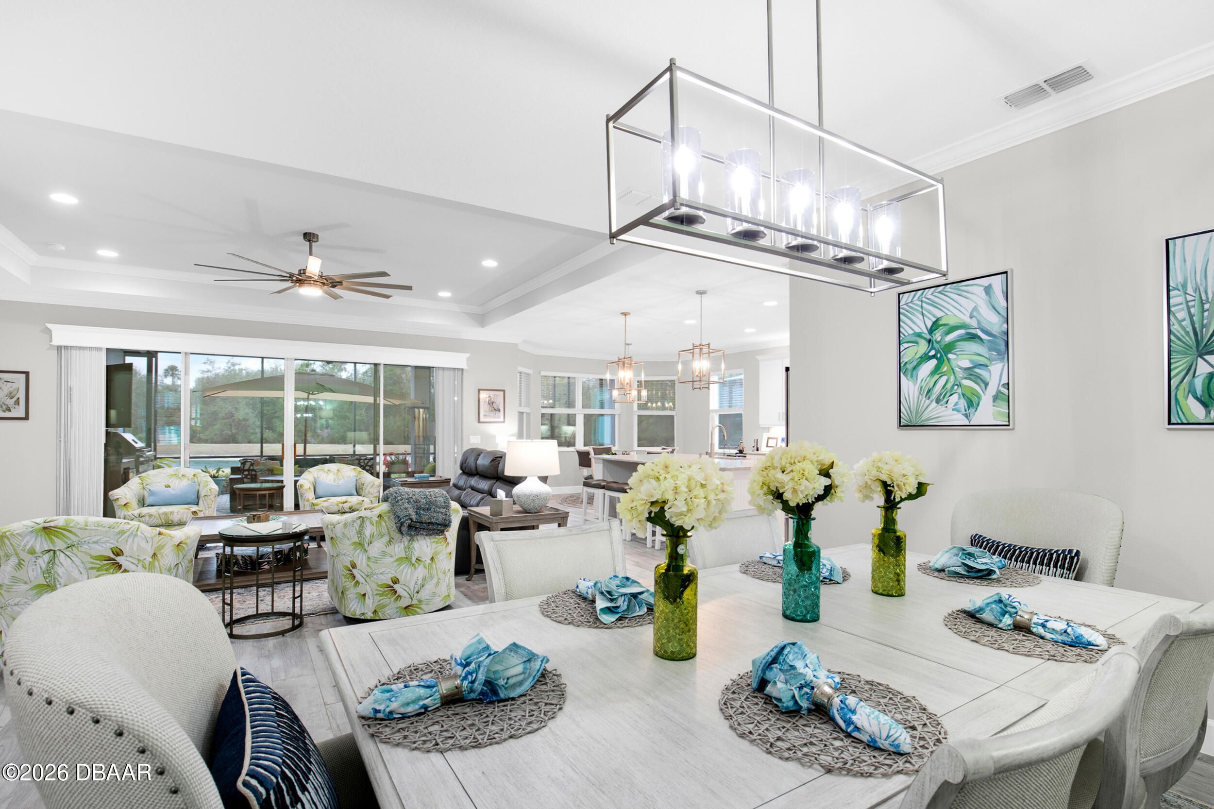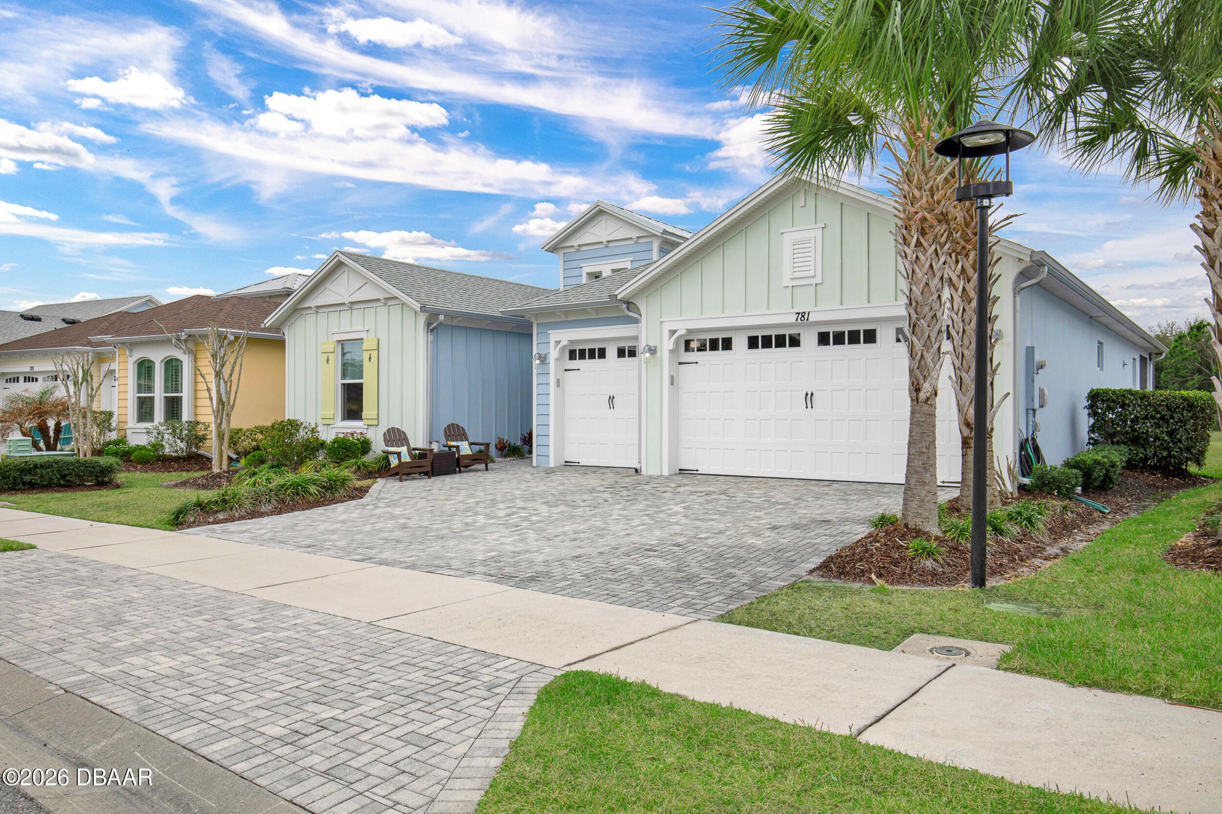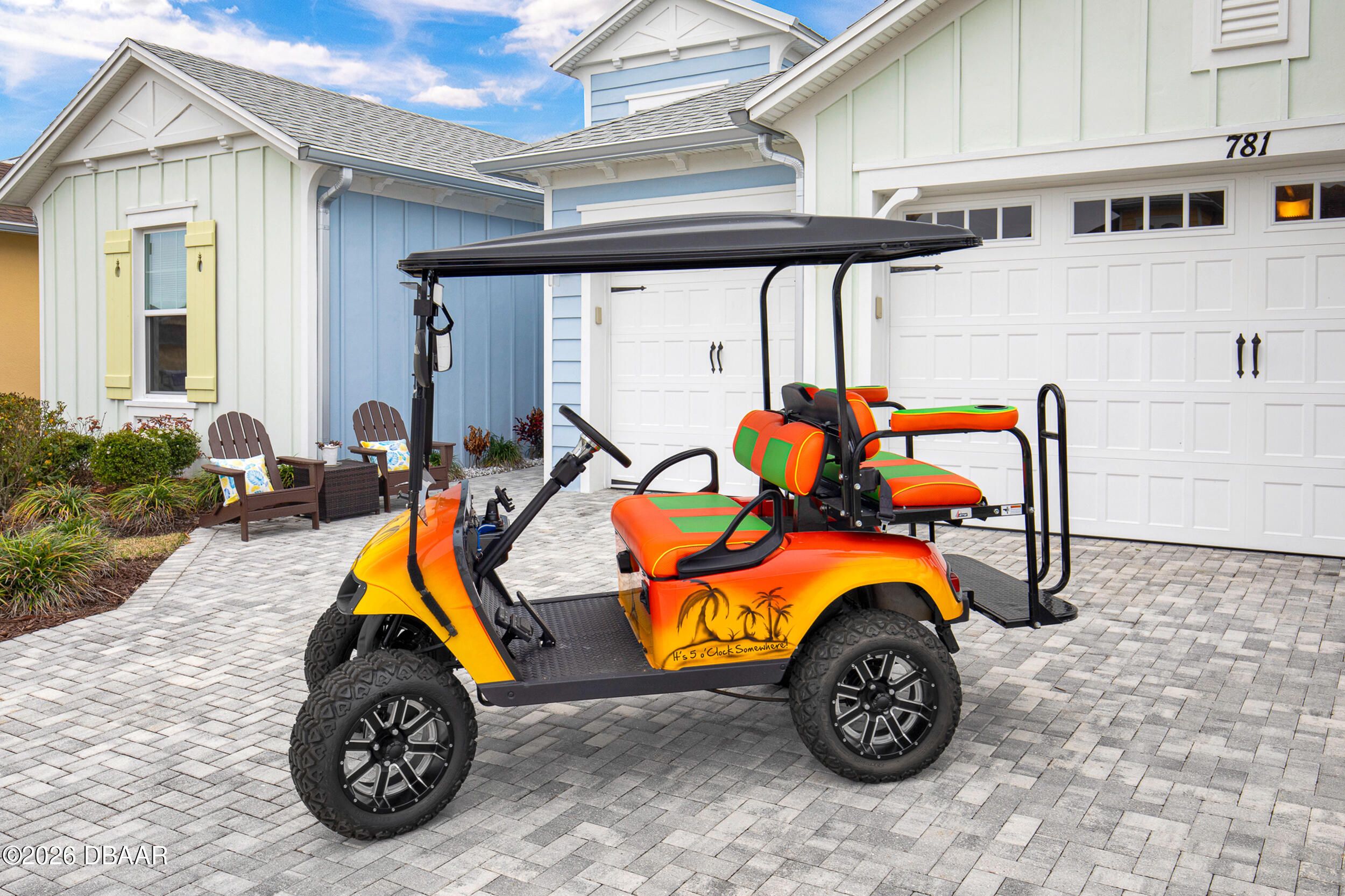 Welcome to the beautifully upgraded St. Bart model in Margaritaville, where every day feels like a getaway. This 3-bed, 3-bath home with a den blends refined finishes with relaxed coastal living. The gourmet kitchen features quartz countertops & backsplash, gas cooktop, double wall ovens & extensive cabinetry, lighting. Plank tile flooring & crown molding flow throughout, adding a polished touch to every room. The extended screened lanai becomes an outdoor retreat, complete with a full summer kitchen, beverage refrigerator & peaceful pond views- perfect for entertaining or unwinding. Thoughtful upgrades throughout elevate comfort & style including 8 ft doors, custom closets, spa like primary bath. Garage includes storage racks, extra fridge, surge protector & portable generator. GOLF CART INCLUDED. Residents enjoy a true resort lifestyle with the paradise pool, sport pool, pickleball, fitness center, on-site dining & convenient shuttle service to the private beach club & more.