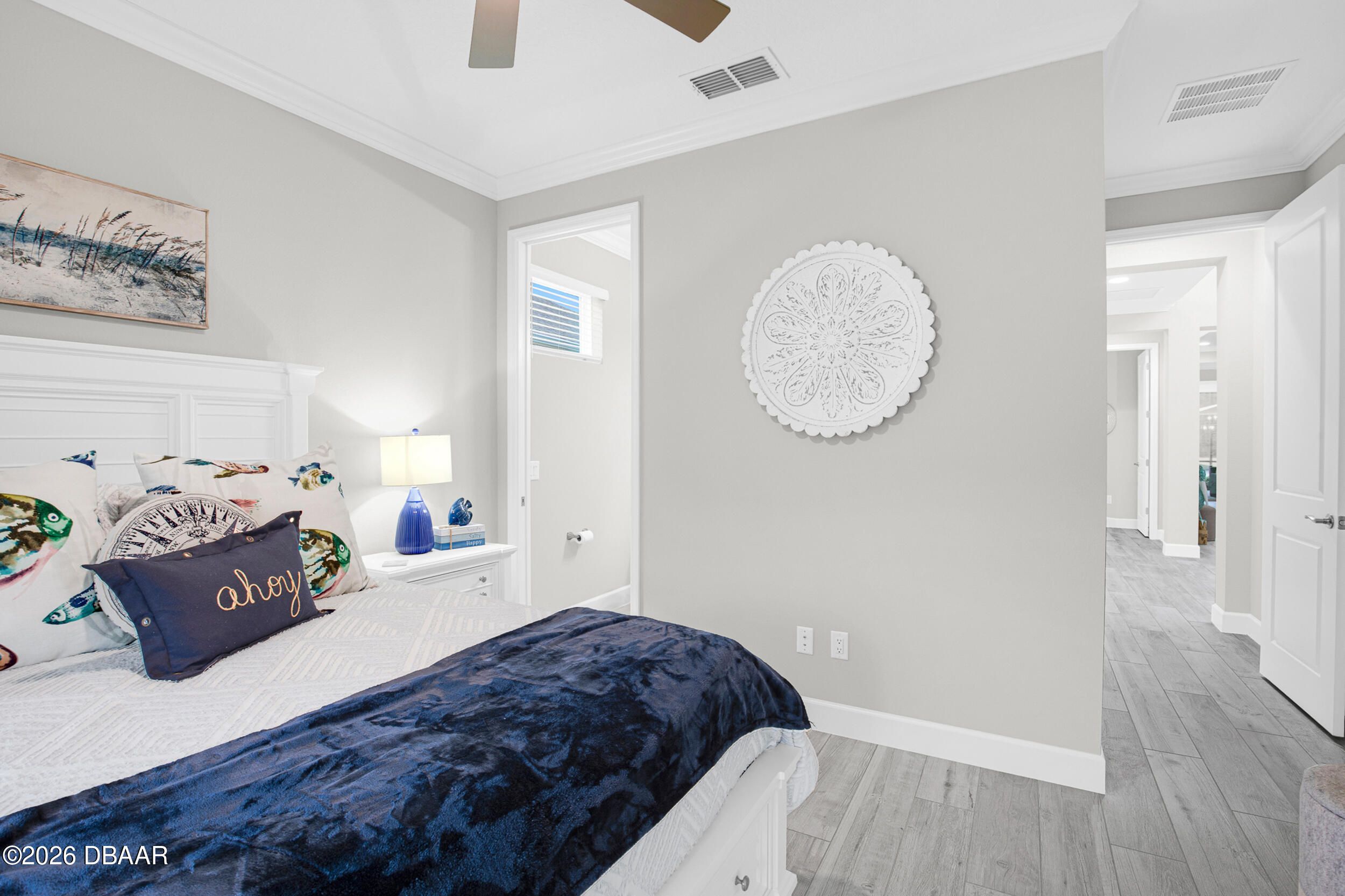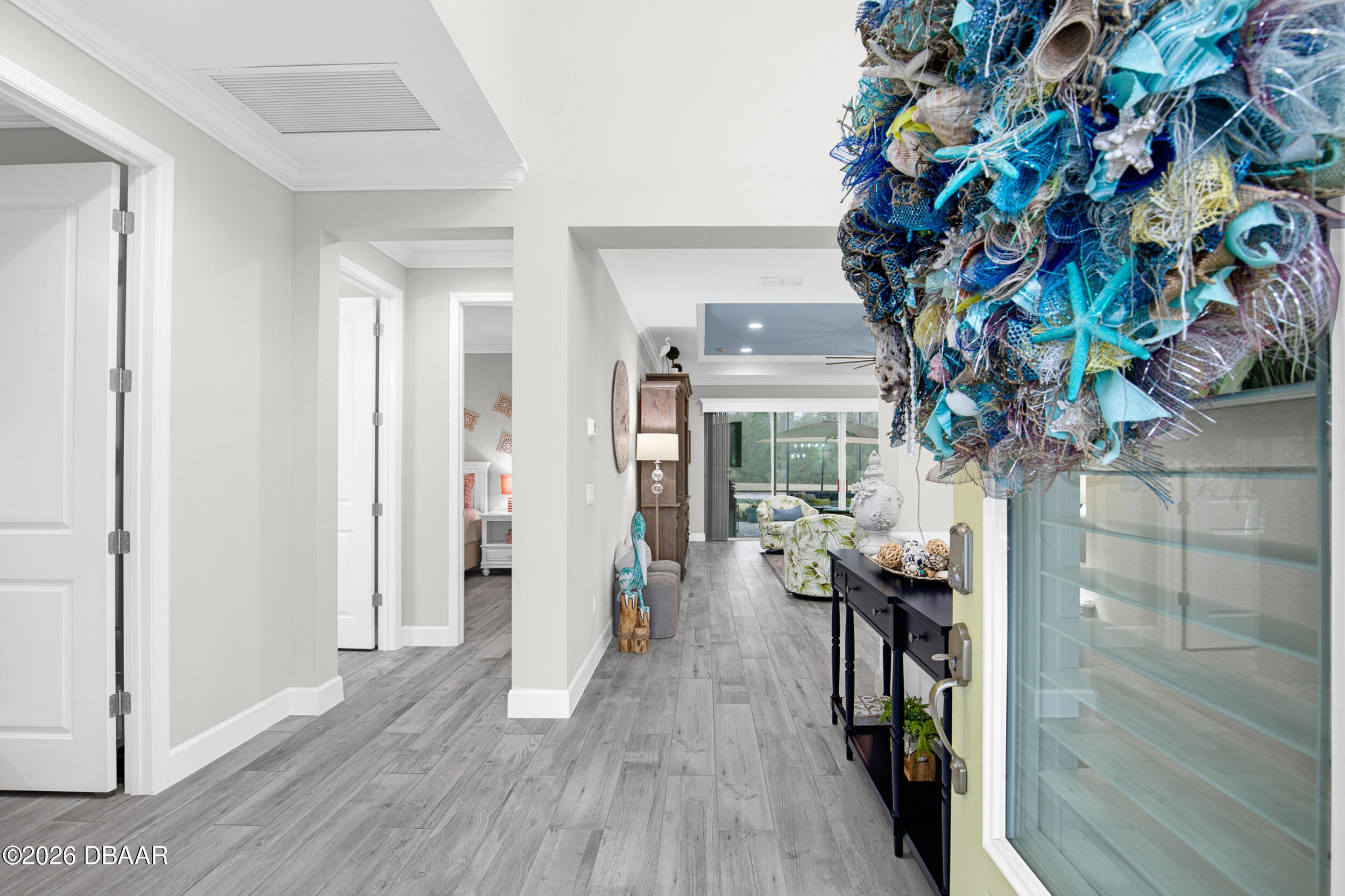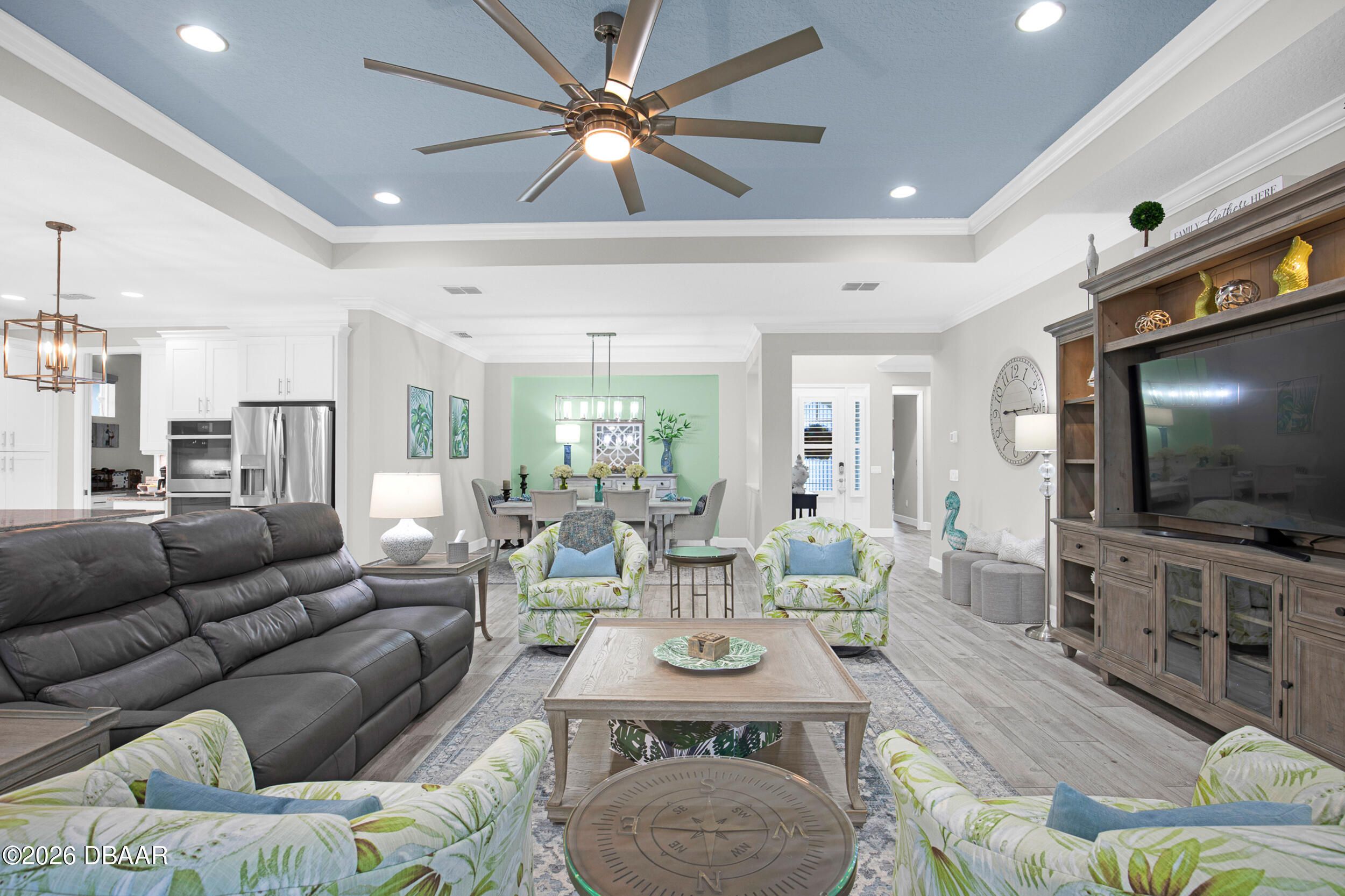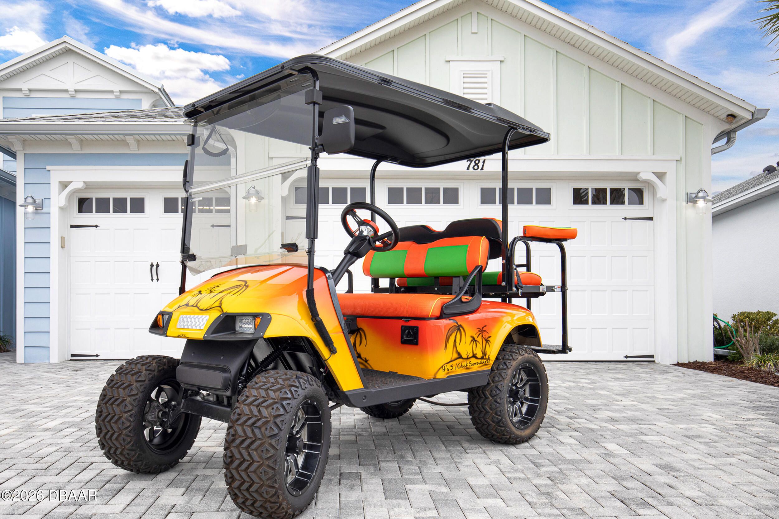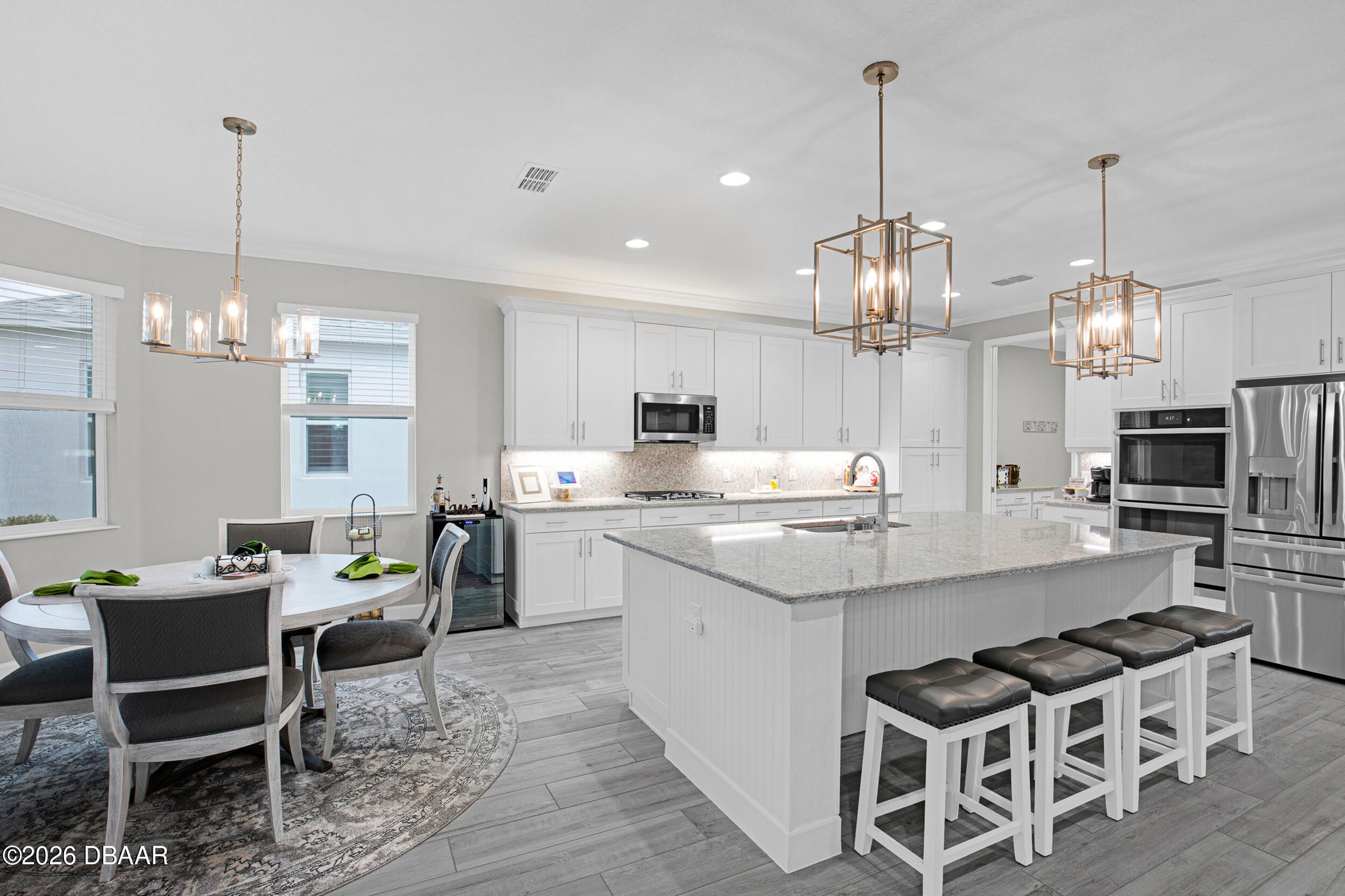 Welcome to the beautifully upgraded St. Bart model in Margaritaville, where every day feels like a getaway. This 3-bed, 3-bath home with a den blends refined finishes with relaxed coastal living. The gourmet kitchen features quartz countertops & backsplash, gas cooktop, double wall ovens & extensive cabinetry, lighting. Plank tile flooring & crown molding flow throughout, adding a polished touch to every room. The extended screened lanai becomes an outdoor retreat, complete with a full summer kitchen, beverage refrigerator & peaceful pond views- perfect for entertaining or unwinding. Thoughtful upgrades throughout elevate comfort & style including 8 ft doors, custom closets, spa like primary bath. Garage includes storage racks, extra fridge, surge protector & portable generator. GOLF CART INCLUDED. Residents enjoy a true resort lifestyle with the paradise pool, sport pool, pickleball, fitness center, on-site dining & convenient shuttle service to the private beach club & more.