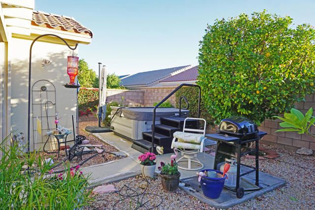 Sun City Palm Desert - Lanai (Extended). Available furnished outside of escrow with some exceptions. Located a short distance to the Lakeview Clubhouse, this 3 bedroom, 2 bath homes has a south facing rear yard w/an alumawood cover & desert landscaping including citrus. The living room has a media nook. The kitchen has oak cabinetry, Quartz counters & bisque appliances. The master suite has a walk-in closet. The master bath has a sitting vanity, stall shower & cultured marble counter. Double doors leads to the 1 of 2 guest bedrooms. The laundry is located inside. The home has a spacious 2 car garage.