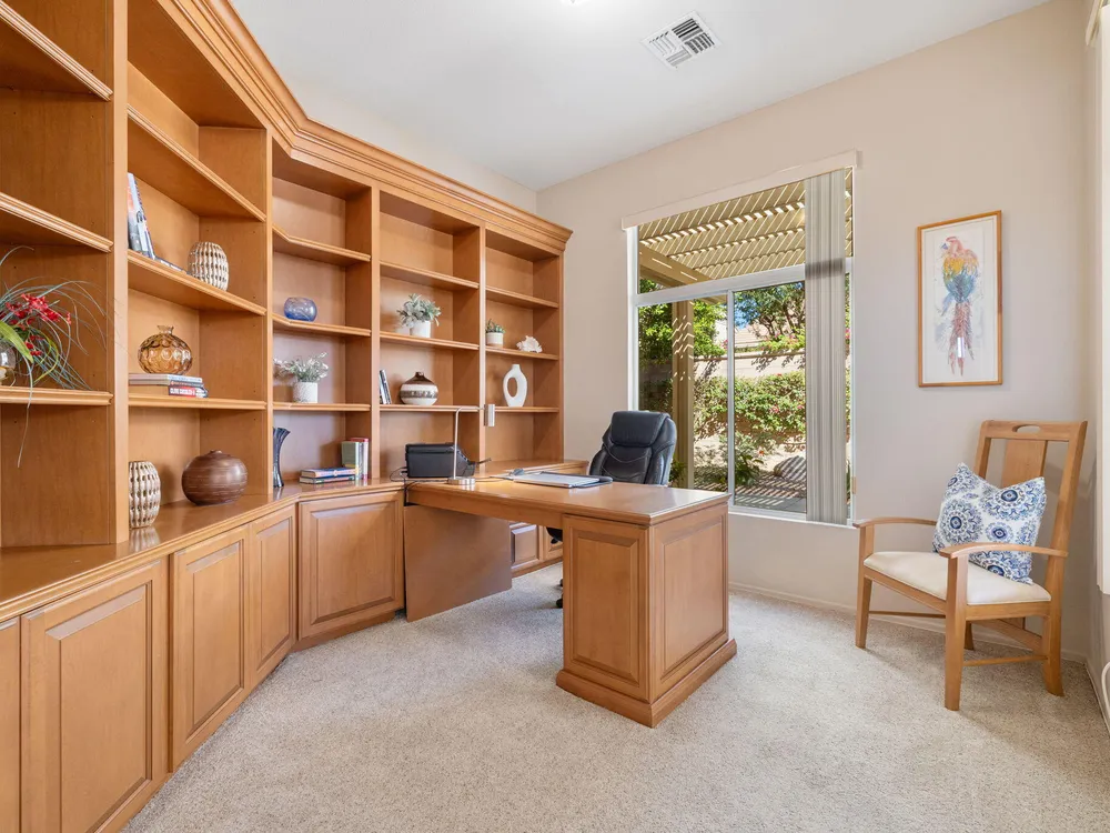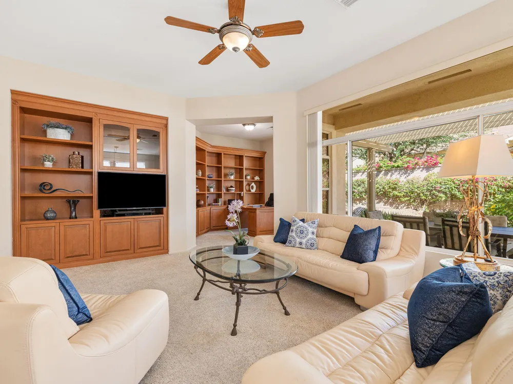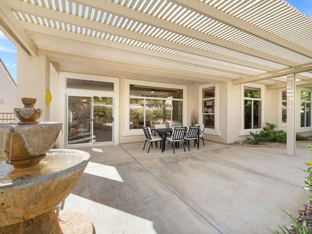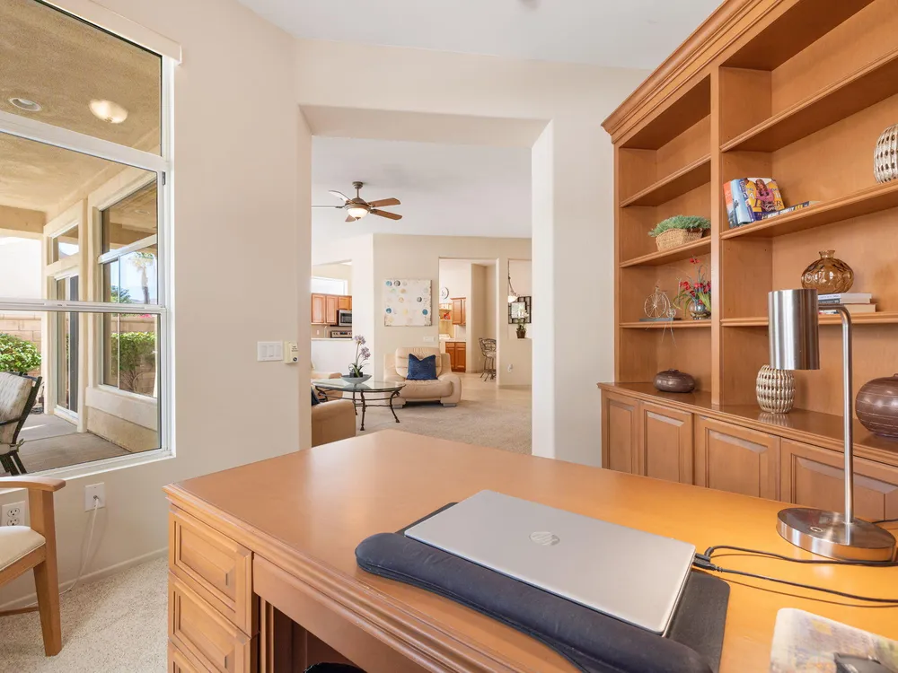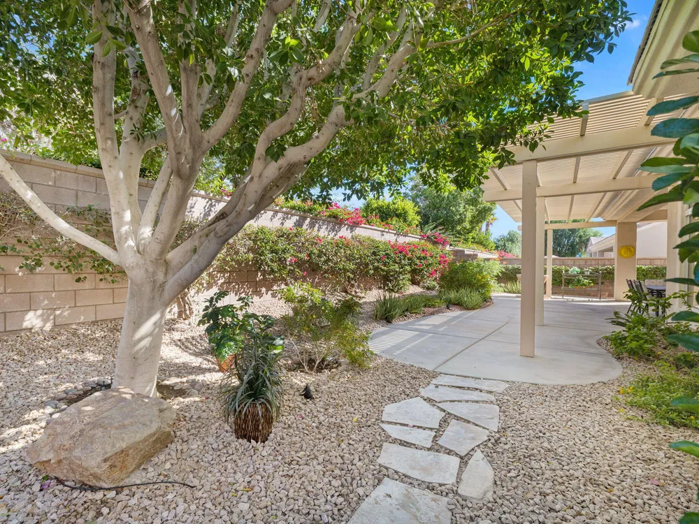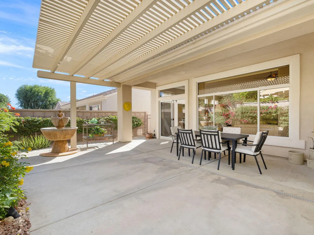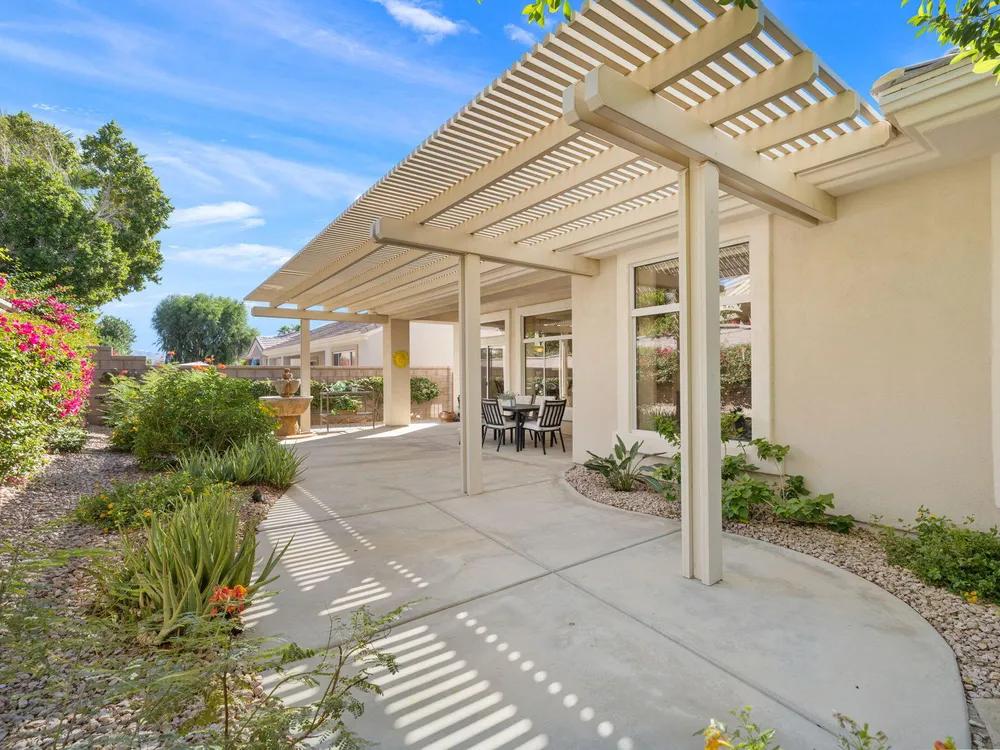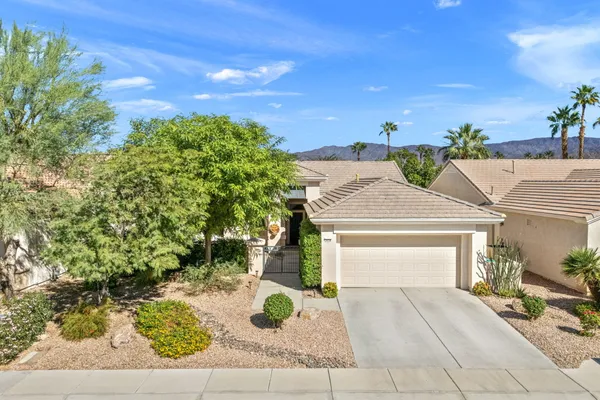 Sun City Palm Desert 55+ community. This Morocco is one of the most popular models, with high ceilings and transom windows, letting in plenty of light. The large entry courtyard is perfect for a sitting area that enjoys southern warmth in the winter. It has 2 bedrooms, 2 bathrooms, a den/office with a built-in office desk, and lots of natural light. Upgraded 12X24 tile was added in the main living areas and carpet in the bedrooms. The living room has a custom entertainment center and huge windows. The kitchen has newer stainless appliances, a kitchenette, and a center island. The laundry room has a utility closet, and the washer and dryer are included. The master bedroom has a bay window with a nice view of the beautiful private north-facing backyard. An extended 'Alumawood' cover makes it feel like another living space outdoors. The master bathroom has a custom walk-in tile shower, a private toilet room, a large walk-in closet, and a dual vanity. The guest bedroom is adjacent to the 2nd full bathroom and is very inviting. It has a 2-car garage and is extended with a golf cart nook. Lenox A/C was replaced in 2014. This is a must-see home, so don't miss it. SUN CITY PALM DESERT IS ALL ABOUT LIFESTYLE!! It has many clubs, activities, amenities, and low HOA dues. Play at 2 championship 18-hole golf courses and practice facilities, pickle ball, tennis, softball, bocci ball, an 18-hole miniature golf course, an honor library, arts and crafts, a ballroom for special entertainment, and 4 saltwater pools kept at 87 degrees with hot tubs. Enjoy 2 great restaurants, a martini/coffee bar, and even a post office. There is a newly renovated classy indoor/outdoor bar with fire tables to enjoy the awesome views and our beautiful desert weather..