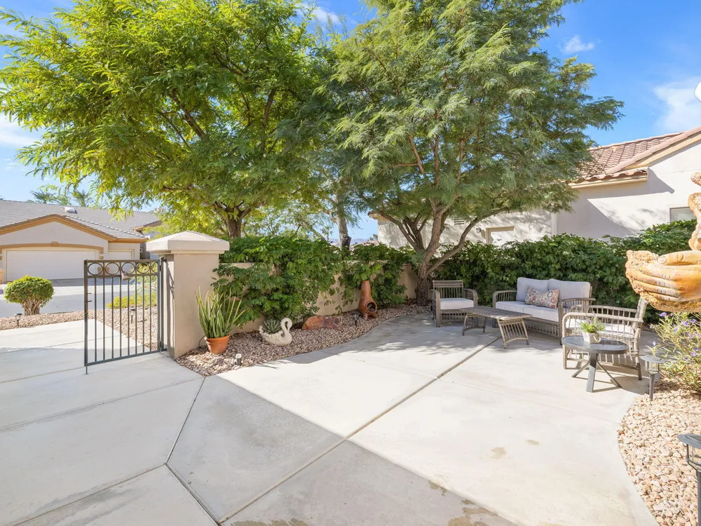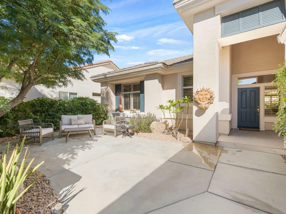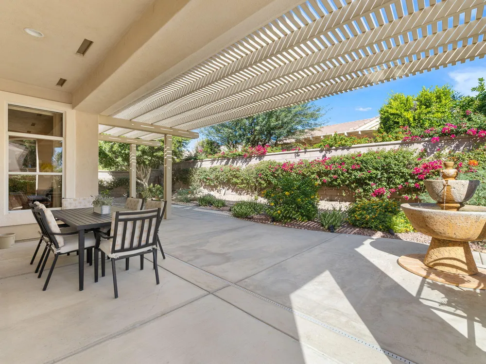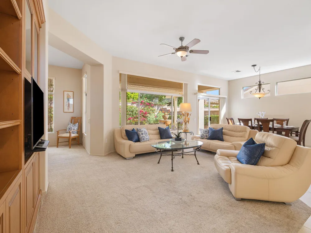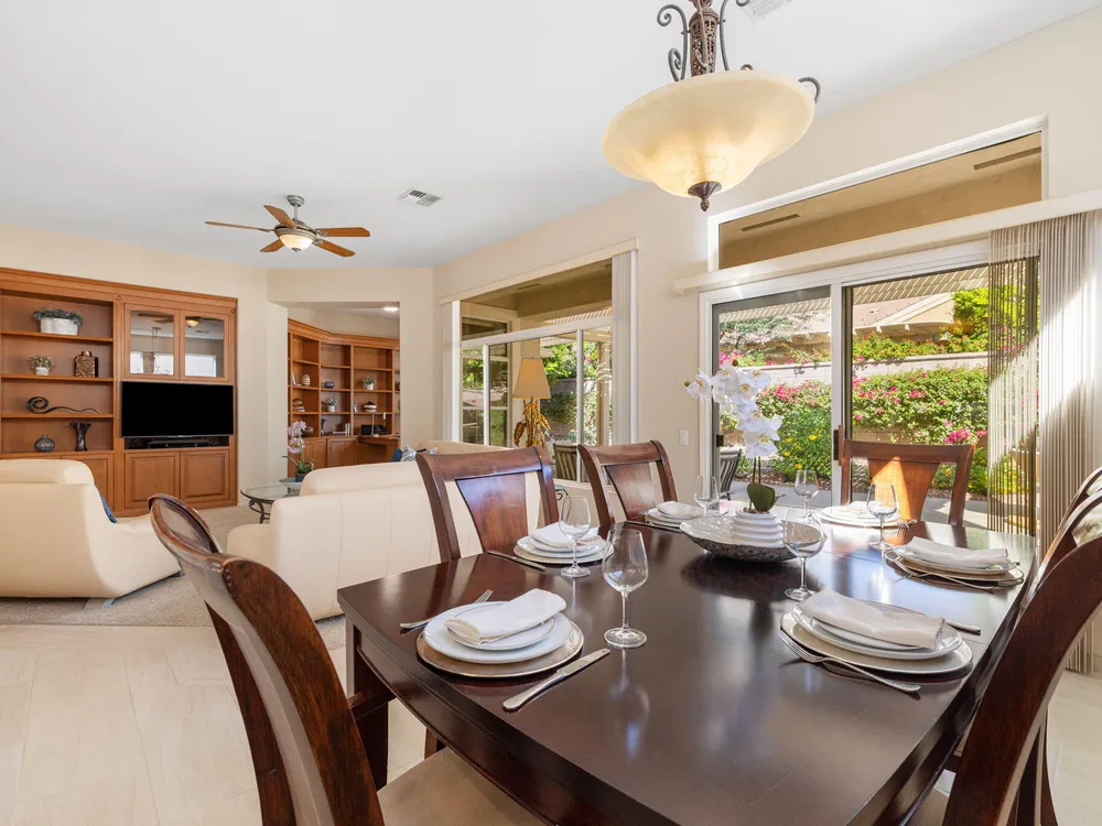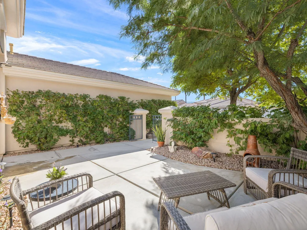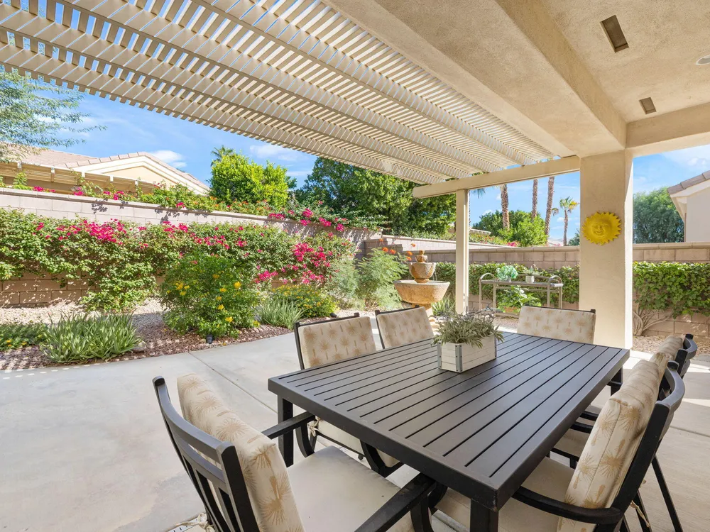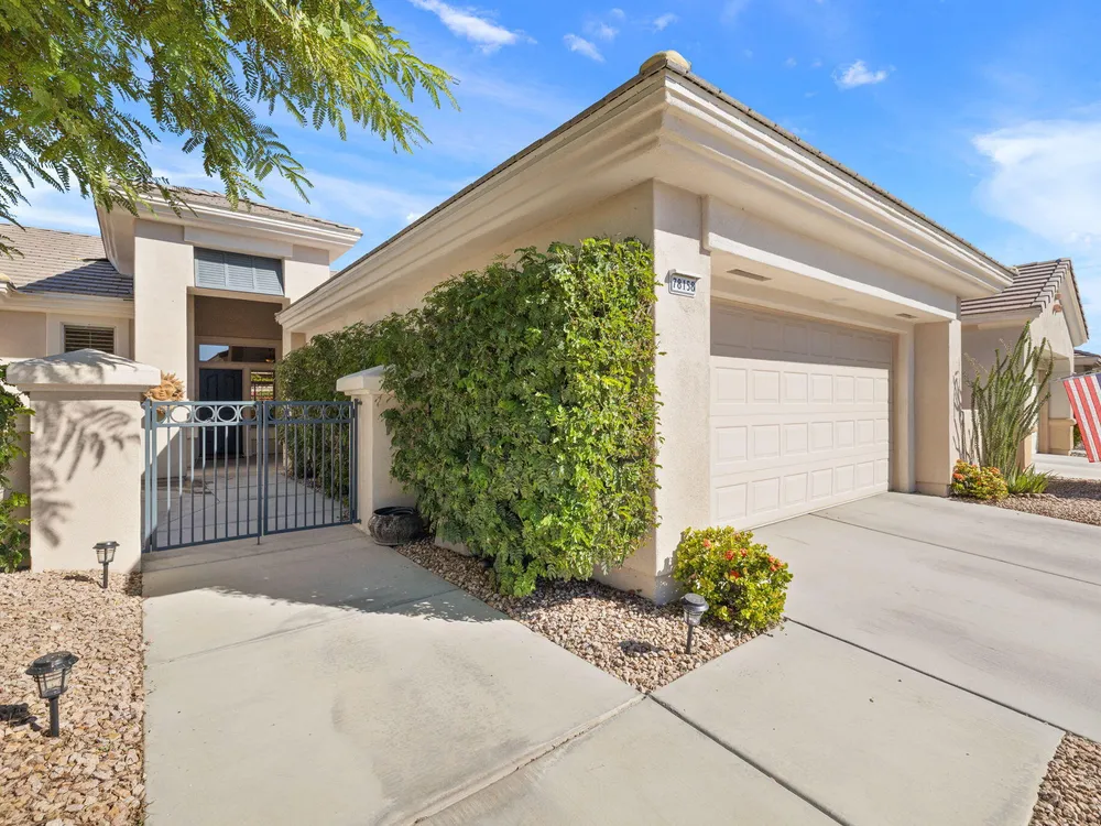 Sun City Palm Desert 55+ community. This Morocco is one of the most popular models, with high ceilings and transom windows, letting in plenty of light. The large entry courtyard is perfect for a sitting area that enjoys southern warmth in the winter. It has 2 bedrooms, 2 bathrooms, a den/office with a built-in office desk, and lots of natural light. Upgraded 12X24 tile was added in the main living areas and carpet in the bedrooms. The living room has a custom entertainment center and huge windows. The kitchen has newer stainless appliances, a kitchenette, and a center island. The laundry room has a utility closet, and the washer and dryer are included. The master bedroom has a bay window with a nice view of the beautiful private north-facing backyard. An extended 'Alumawood' cover makes it feel like another living space outdoors. The master bathroom has a custom walk-in tile shower, a private toilet room, a large walk-in closet, and a dual vanity. The guest bedroom is adjacent to the 2nd full bathroom and is very inviting. It has a 2-car garage and is extended with a golf cart nook. Lenox A/C was replaced in 2014. This is a must-see home, so don't miss it. SUN CITY PALM DESERT IS ALL ABOUT LIFESTYLE!! It has many clubs, activities, amenities, and low HOA dues. Play at 2 championship 18-hole golf courses and practice facilities, pickle ball, tennis, softball, bocci ball, an 18-hole miniature golf course, an honor library, arts and crafts, a ballroom for special entertainment, and 4 saltwater pools kept at 87 degrees with hot tubs. Enjoy 2 great restaurants, a martini/coffee bar, and even a post office. There is a newly renovated classy indoor/outdoor bar with fire tables to enjoy the awesome views and our beautiful desert weather..