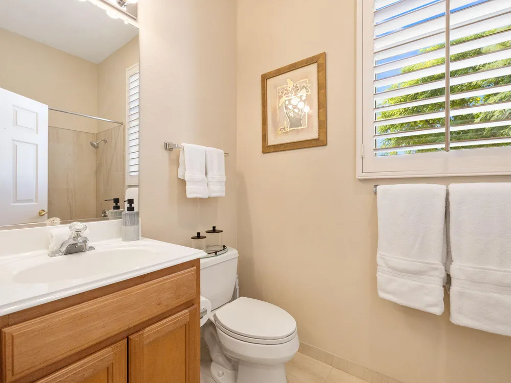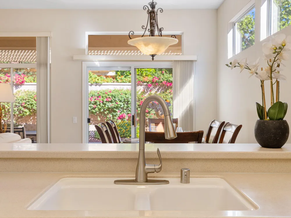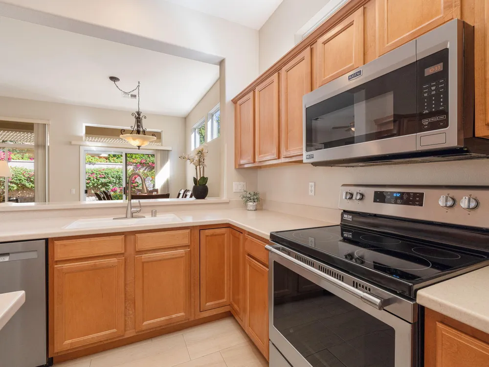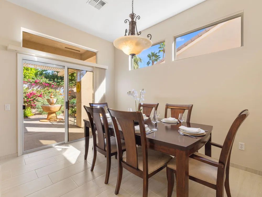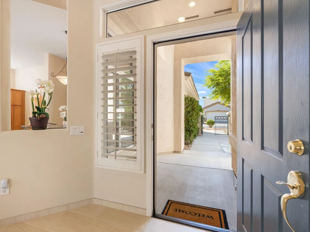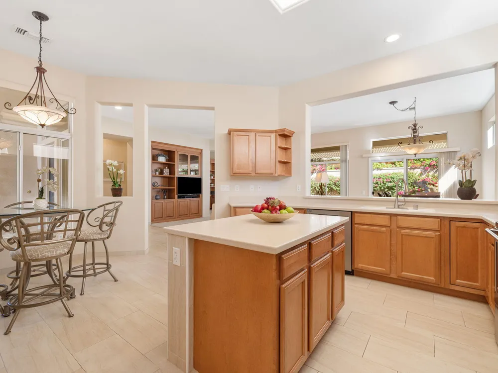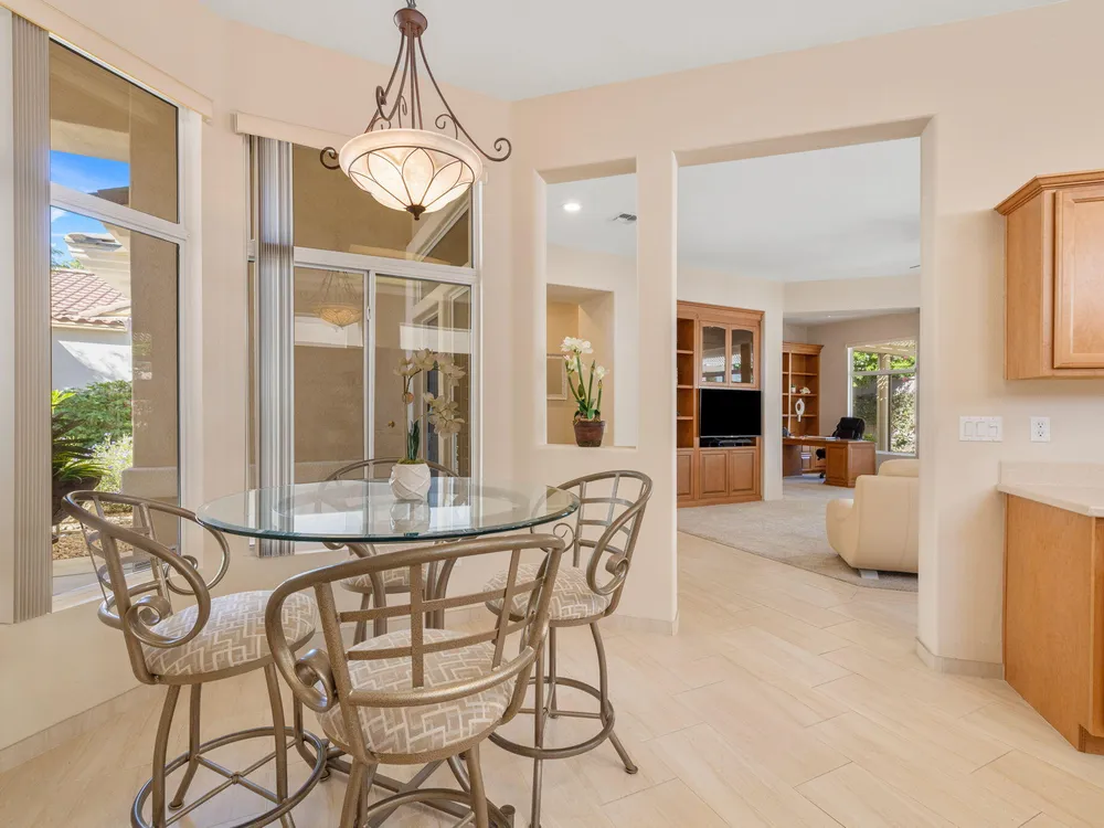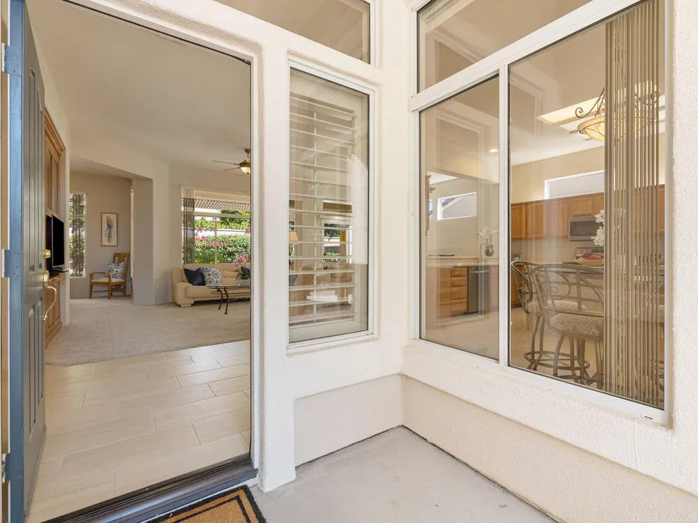 Sun City Palm Desert 55+ community. This Morocco is one of the most popular models, with high ceilings and transom windows, letting in plenty of light. The large entry courtyard is perfect for a sitting area that enjoys southern warmth in the winter. It has 2 bedrooms, 2 bathrooms, a den/office with a built-in office desk, and lots of natural light. Upgraded 12X24 tile was added in the main living areas and carpet in the bedrooms. The living room has a custom entertainment center and huge windows. The kitchen has newer stainless appliances, a kitchenette, and a center island. The laundry room has a utility closet, and the washer and dryer are included. The master bedroom has a bay window with a nice view of the beautiful private north-facing backyard. An extended 'Alumawood' cover makes it feel like another living space outdoors. The master bathroom has a custom walk-in tile shower, a private toilet room, a large walk-in closet, and a dual vanity. The guest bedroom is adjacent to the 2nd full bathroom and is very inviting. It has a 2-car garage and is extended with a golf cart nook. Lenox A/C was replaced in 2014. This is a must-see home, so don't miss it. SUN CITY PALM DESERT IS ALL ABOUT LIFESTYLE!! It has many clubs, activities, amenities, and low HOA dues. Play at 2 championship 18-hole golf courses and practice facilities, pickle ball, tennis, softball, bocci ball, an 18-hole miniature golf course, an honor library, arts and crafts, a ballroom for special entertainment, and 4 saltwater pools kept at 87 degrees with hot tubs. Enjoy 2 great restaurants, a martini/coffee bar, and even a post office. There is a newly renovated classy indoor/outdoor bar with fire tables to enjoy the awesome views and our beautiful desert weather..