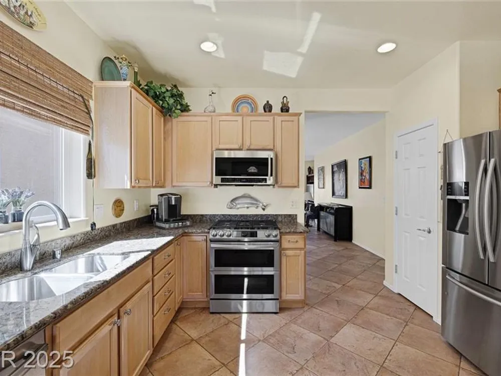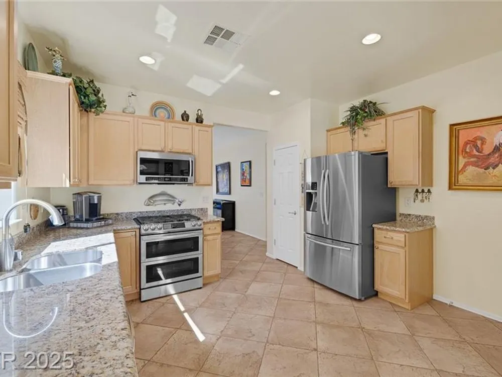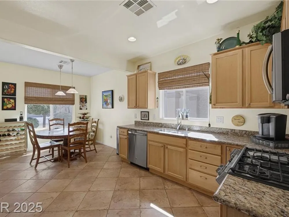 Spectacular home in Sun City Aliante! This impeccably maintained home (only one owner!) features a premium golf course lot that offers panoramic golf & mountain views AND privacy, as it’s situated ideally so that golf cart passerby traffic (and golf balls!) are near nonexistent! The kitchen features new stainless steel appliances, granite countertops & a breakfast nook! The open concept floor plan connects the great room & dining area, and there’s also a separate laundry room with Samsung washer & dryer. ALL appliances are included! Speaking of included, so is the water filtration system, supplying superb high quality drinking water throughout the whole house! Sun City Aliante is next to the Aliante Casino and many other restaurants & amenities! The community offers a variety of options for an active lifestyle such as the golf course with practice facilities, fitness center, pool, tennis & pickle ball courts, trails and more! There are also many social events & clubs to participate in!