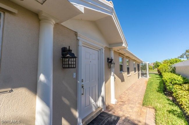 READY FOR NEW OWNERS!! This DiVosta built, poured concrete, two bedrooms with den/two bath attached Capri villa in the gated community of VeronaWalk is move in ready. Being offered furnished (tastefully decorated with newer furniture) makes settling in easy to start enjoying resort style living in south west Florida in time for the upcoming winter season. The home features an open concept with vaulted ceilings in the main living space with crown molding throughout. A split bedroom floorplan separates the bedrooms, each with their own walk-in closet and bath, offering the utmost in privacy when entering overnight guests. Wall colors as well as tile and bedroom carpet are neutral shades. Lighting has been updated with contemporary fixtures and fans. A centrally located kitchen is equipped with stainless appliances. The full laundry room with wash sink accesses your epoxy floor two-car garage. Stepping outdoors from a bank of sliding glass doors is a covered lanai with attached screen enclosure. Here you can enjoy your own pool that has been recently relined and retiled. A new pool pump has been installed. Your sloping lawn leads to a quiet waterway. Everything is ready to go in this delightful space located in East Naples.