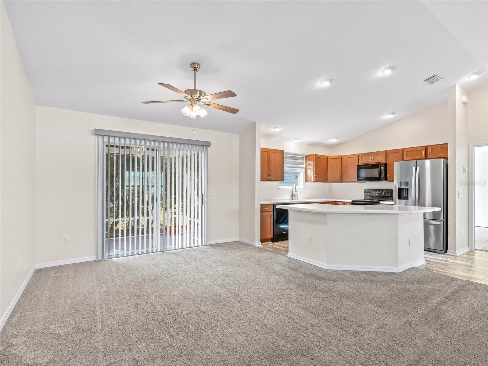 One or more photo(s) has been virtually staged. Welcome home to this beautifully maintained three-bedroom, two-bath residence with inviting curb appeal. The painted, designer driveway and walkway lead to a covered front porch with storm door, framed by lovely, well-kept landscaping. Inside, you’ll find a desirable split-bedroom floor plan and an open-concept layout enhanced by high ceilings. The kitchen offers a breakfast bar, Corian countertops, seamless sink, a pantry with pull-outs, and recessed lighting—perfect for everyday living and casual entertaining. The spacious primary suite features a walk-in closet, dual sinks, and a walk-in shower. Two additional bedrooms, each with closets, are conveniently located near a full guest bath with a tub/shower combination. Additional highlights include an indoor laundry room with stainless utility sink and ample cabinetry above. The full two-car garage is equipped with a mini-split air conditioner and an extra refrigerator—ideal for projects or added comfort. Additional features include wall mounted TV's in the great room and master suite, and a Whole House Water Softener! Relax outdoors in the screened lanai with privacy hedges, plus a concrete patio ready for grilling and entertaining. This lovely home is ready for its new owner! Schedule your private viewing now.