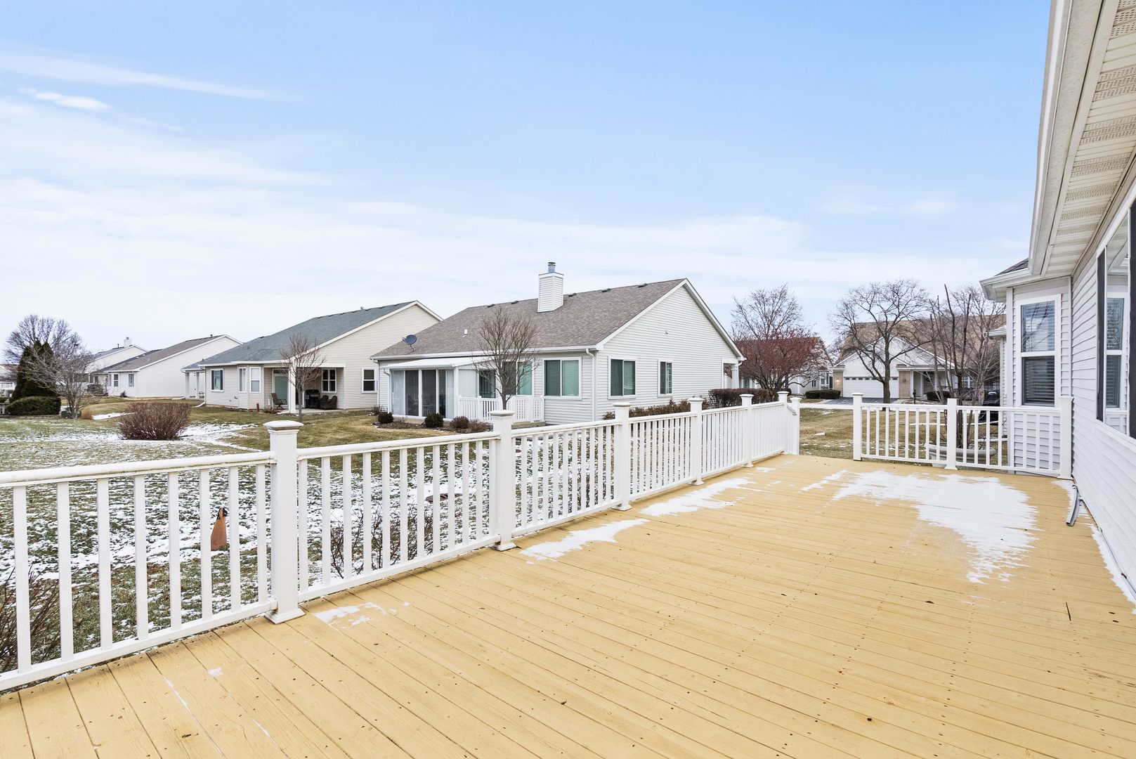 Do not miss this rare opportunity to own a tastefully updated 3-bedroom, 3.5 bathroom home in the highly sought-after Grand Haven Adult Community. Grand Haven is a 55+ community however the association permits a small number of homeowners between the ages of 50 and 54; availability remains at the time of listing. This well-maintained home features a new roof (2020) and a rear deck added in 2018, perfect for enjoying outdoor living. Inside, you'll find impressive high ceilings, including a family room with nearly 18-foot ceilings, creating a bright and open atmosphere. A built-in desk/computer workstation adds functionality for work or hobbies. The main-level primary suite offers convenience and comfort, featuring a walk-in closet and a spacious ensuite bath with a jetted tub, double-bowl vanity, and separate shower. The second floor includes an additional ensuite bedroom with a his-and-hers style closet, ideal for guests. The full basement provides excellent storage and future potential, boasting extra ceiling height and a half bath with rough-in for a shower. The large kitchen is designed for both everyday living and entertaining, complete with a generous breakfast bar and ample cabinet space. Enjoy maintenance-free living-no mowing, no shoveling-along with an exceptional array of community amenities, including a gated entrance, indoor and outdoor swimming pools, fitness center, tennis courts, pickleball courts, bocce court, putting green, community center, and library. A truly special home offering comfort, convenience, and resort-style living.