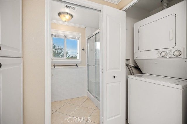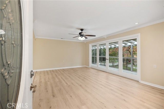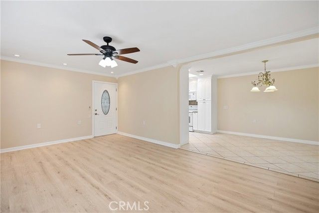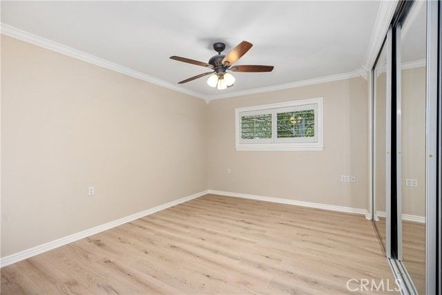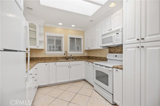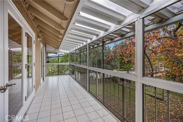 YOU WILL NOT WANT TO MISS THIS BEAUTIFUL, POPULAR "CASA LINDA" MODEL. GREAT CURB APPEAL WITH NO STAIRS. Bright and inviting two-bedroom two-bath with an open, lovely treetop outlook and an expansive enclosed balcony that truly lives like an extra room. The living room features smooth ceilings, crown molding, a ceiling fan, and French doors to the balcony. Freshly painted, with new laminate wood floors in the living room and hall, and tile in the kitchen and dining, along with Central Heat and Air and Newer Dual-Pane Windows throughout. The remodeled kitchen is a delight with granite counters, crisp white cabinetry, recessed lighting, and a large skylight that fills the space with sunshine. Beautifully remodeled with exceptional storage, including extra-deep cabinets and clever hidden spaces that keep everything organized and out of sight. A generous dining area sits just off the kitchen for easy entertaining. Both bedrooms are comfortable retreats with ceiling fans. The primary suite offers mirrored wardrobes and an updated bath with a walk-in shower and seat. The guest bedroom has a sliding glass door leading to the enclosed patio to enjoy. Also, a Murphy bed in the bedroom. The bath features a tub-and-shower combination with a skylight. Conveniences include an inside laundry with a stack washer and dryer, smooth ceilings, crown molding, and abundant storage throughout. Add all this to the incredible amenities of Laguna Woods Village, and you have a winning combination. Residents enjoy the 27-hole championship golf course and the 9-hole executive par three course, tennis, pickleball, paddle tennis, bocce, and lawn bowling, two fitness centers, seven clubhouses, five swimming pools, an equestrian center, community gardens, an art studio, and a world-class woodshop, along with more than two hundred clubs and social groups. There is a free bus service throughout the community and to nearby shopping areas. RV owners will appreciate the convenient and economical RV storage area. All of this is set in a secure, guard-gated community about 6 miles from beautiful Laguna Beach. Country Club living at its best. SEE VIRTUAL TOUR. Carport 570 Space 1