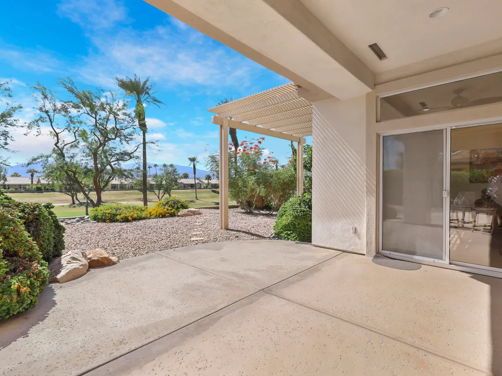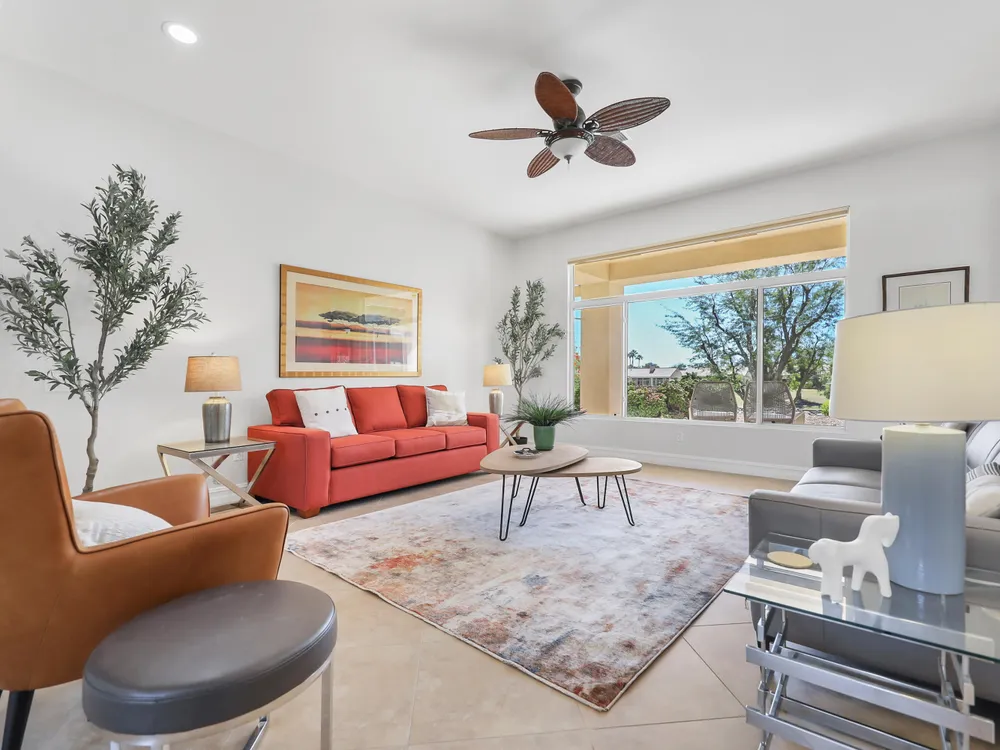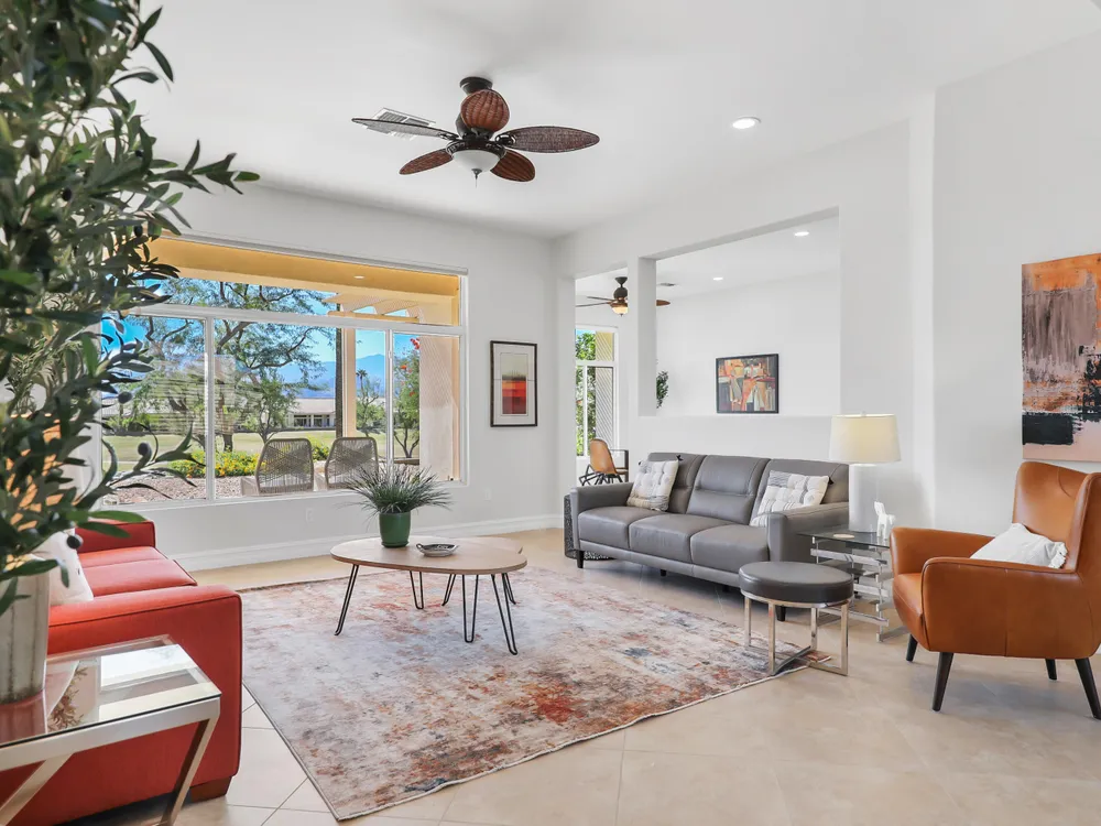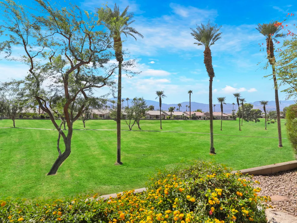 Welcome to sought after Sun City Palm Desert. This home is a Tangier model with stunning south-facing golf course and mountain views! It is back on the market at a significantly reduced price. Located near the Sunset View Clubhouse, this beautifully maintained home features 10-ft ceilings, transom windows, and an open-concept layout filled with natural light. The upgraded kitchen includes granite counters, stainless appliances, and maple cabinetry. The primary suite offers a custom tile shower, dual sinks, and a large walk-in closet with built-ins. Enjoy the den/office, granite-updated bathrooms, and tile flooring throughout most living areas. Outside, relax on the salt-finished patio with an Alumawood cover overlooking the fairway. Upgrades include AC (2016) and water heater (2017). Two-car garage with golf cart nook. Experience resort-style living with golf, tennis, fitness centers, pools, and more in this vibrant 55+ gated community!