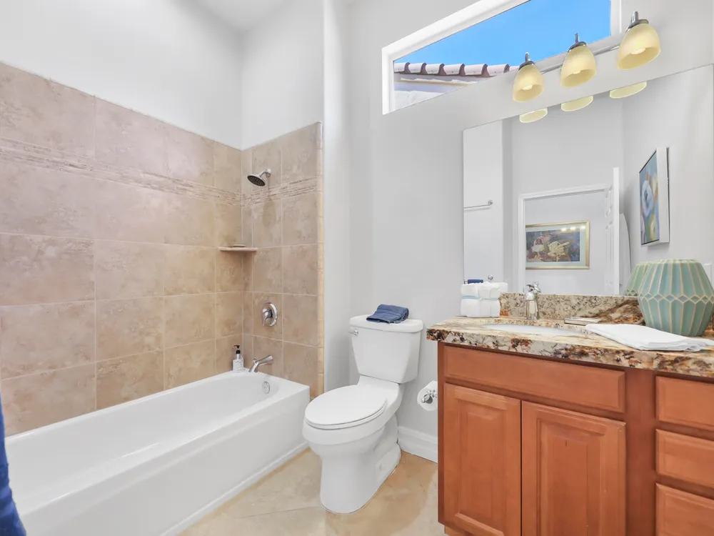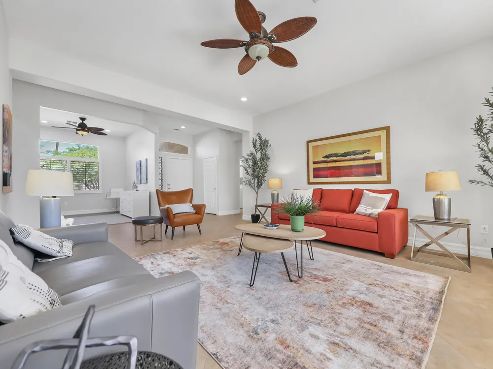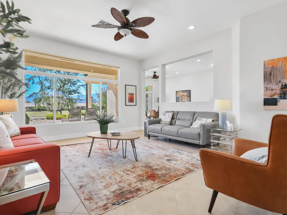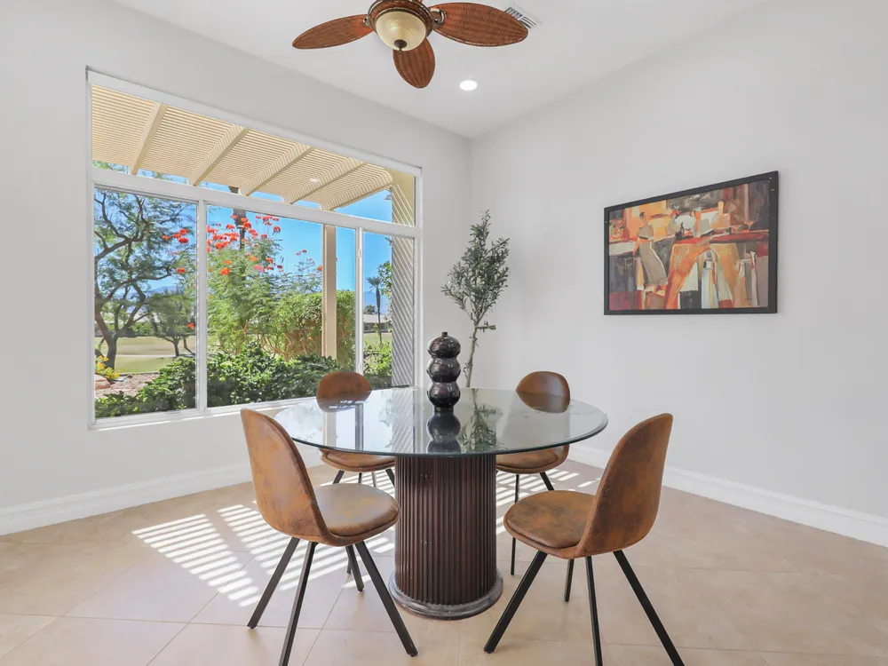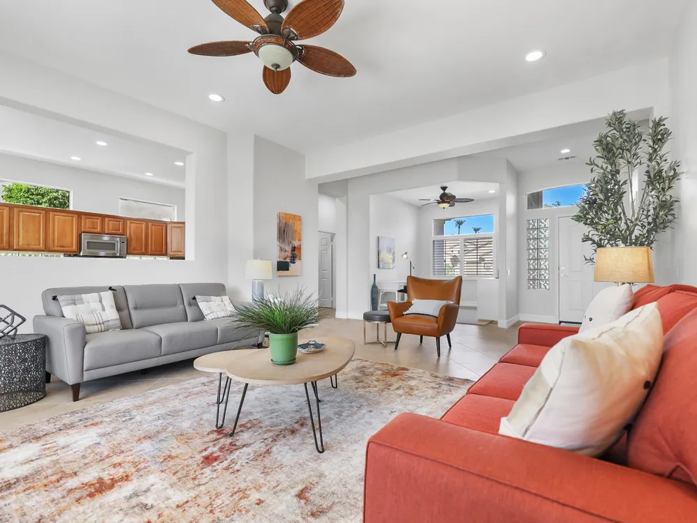 Welcome to sought after Sun City Palm Desert. This home is a Tangier model with stunning south-facing golf course and mountain views! It is back on the market at a significantly reduced price. Located near the Sunset View Clubhouse, this beautifully maintained home features 10-ft ceilings, transom windows, and an open-concept layout filled with natural light. The upgraded kitchen includes granite counters, stainless appliances, and maple cabinetry. The primary suite offers a custom tile shower, dual sinks, and a large walk-in closet with built-ins. Enjoy the den/office, granite-updated bathrooms, and tile flooring throughout most living areas. Outside, relax on the salt-finished patio with an Alumawood cover overlooking the fairway. Upgrades include AC (2016) and water heater (2017). Two-car garage with golf cart nook. Experience resort-style living with golf, tennis, fitness centers, pools, and more in this vibrant 55+ gated community!