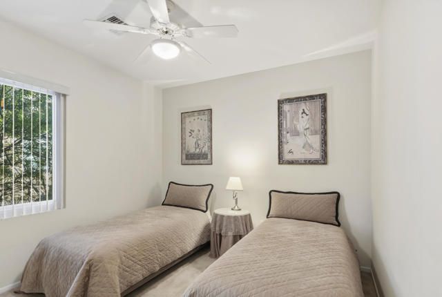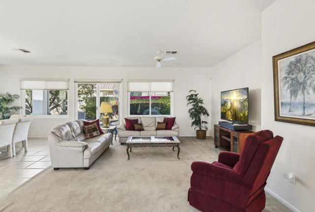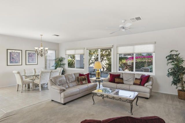 Lovingly cared for St. Croix floor plan located in the highly desirable Sun City Palm Desert, a premier 55+ gated community. This well-maintained 2 bedroom, 2 bathroom home features a den along with a separate office area with custom cabinetry. Approximately 2,102 sq. ft. of comfortable living space includes a bright, open layout ideal for everyday living and entertaining. The kitchen features a center island, gas cooktop, ample cabinetry, and opens to the family room and dining area. The spacious primary suite includes a sitting area, dual vanities, and a walk-in closet. Enjoy the covered patio and low-maintenance desert landscaping, perfect for relaxing and outdoor enjoyment. Additional highlights include a 2-car garage with golf cart bay and storage. Home is offered furnished, including a golf cart. Sun City Palm Desert residents enjoy two championship golf courses, clubhouses, fitness centers, pickleball and tennis courts, walking paths, and an abundance of clubs and activities. All information provided is deemed reliable but is not guaranteed and should be independently verified by the buyer.