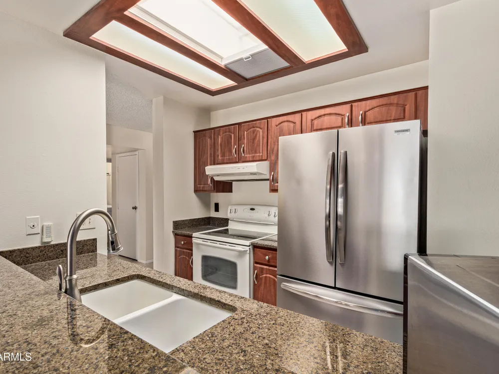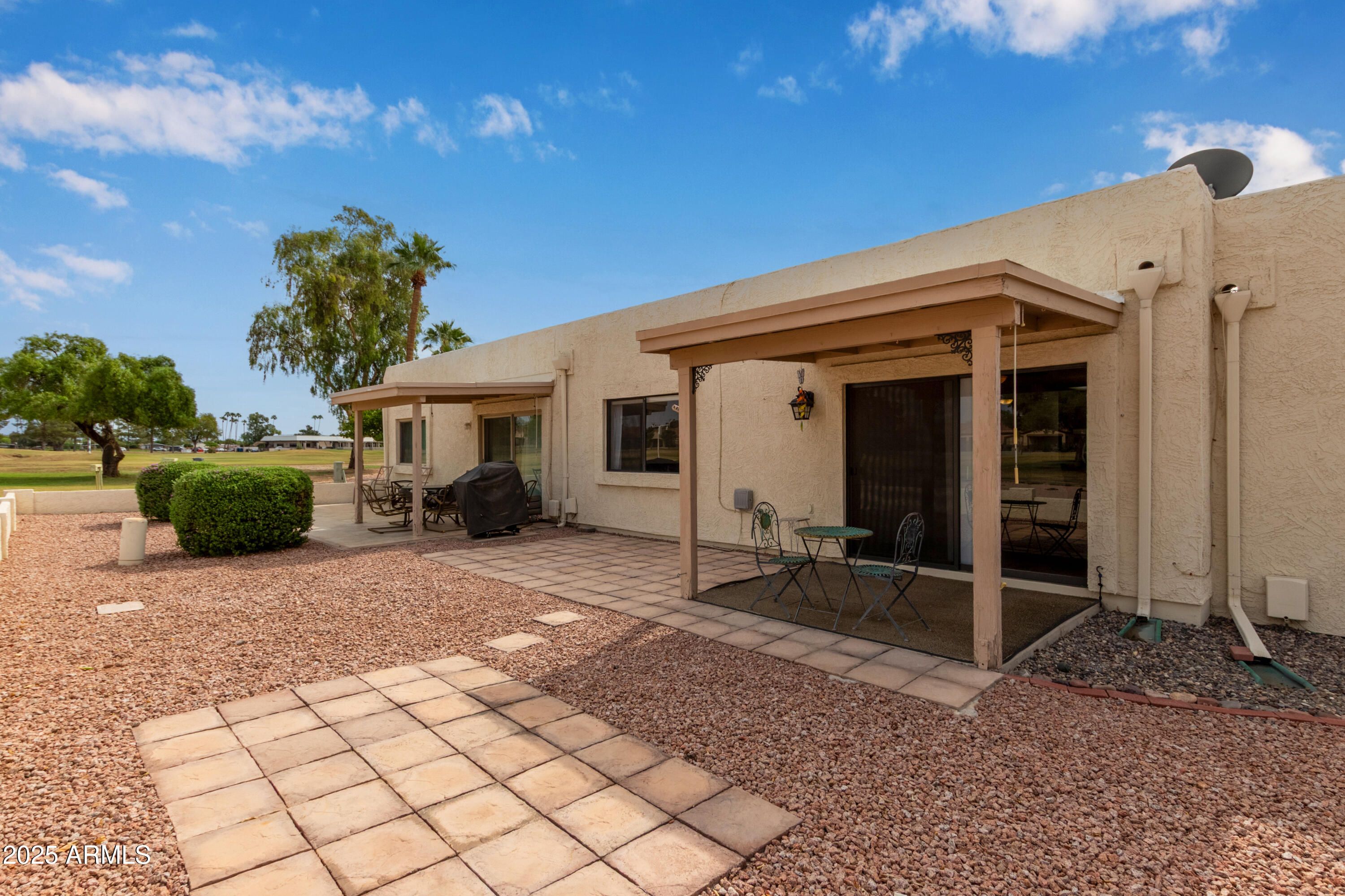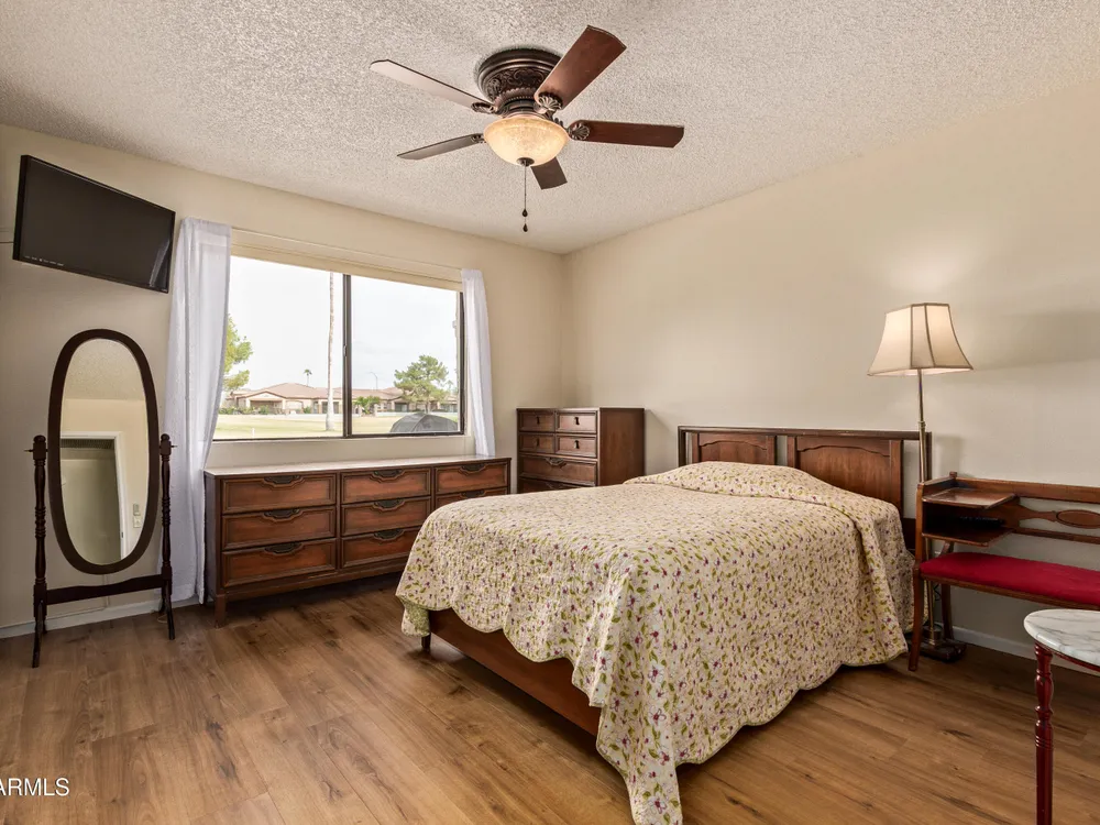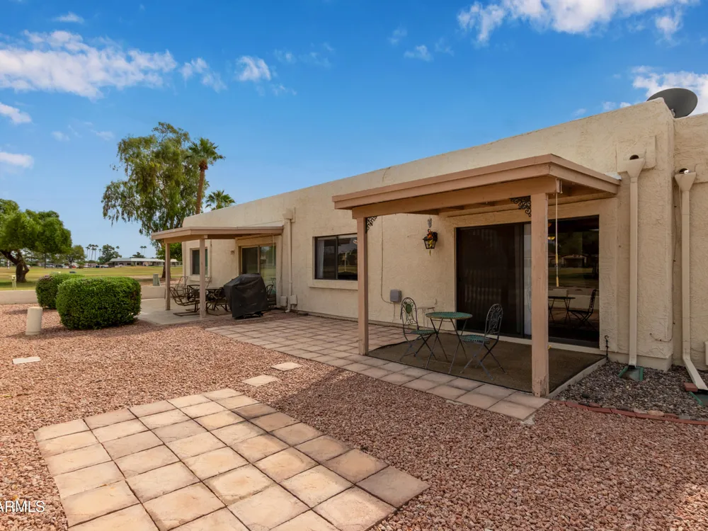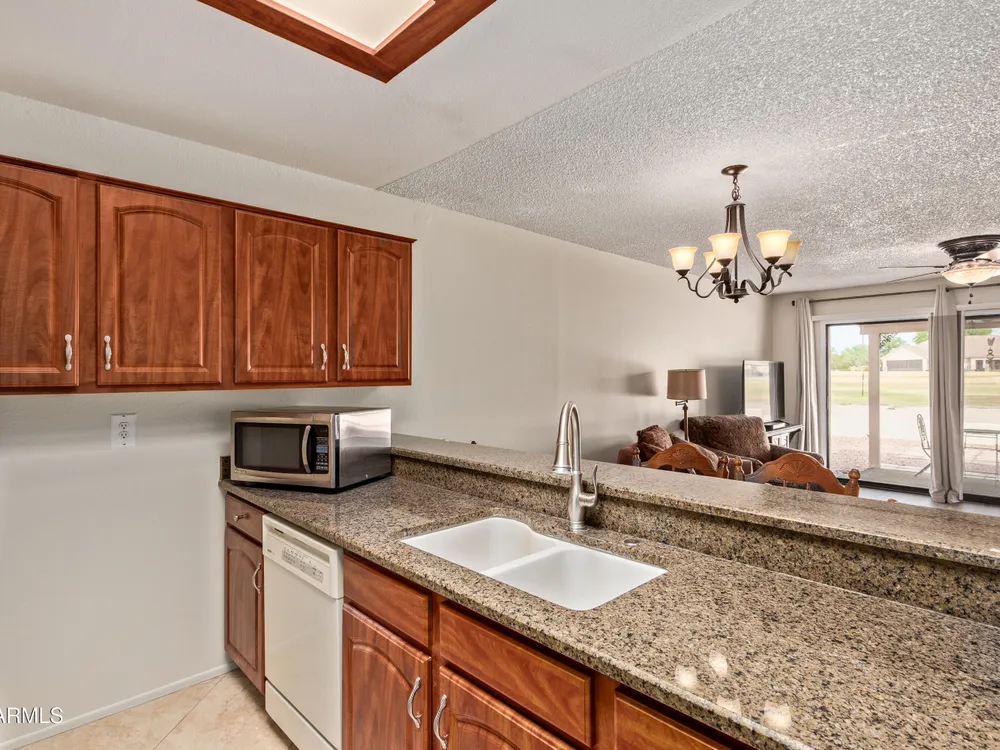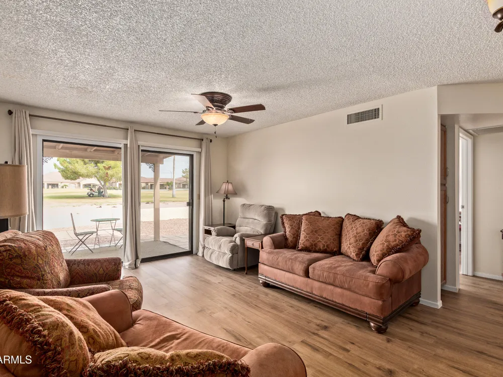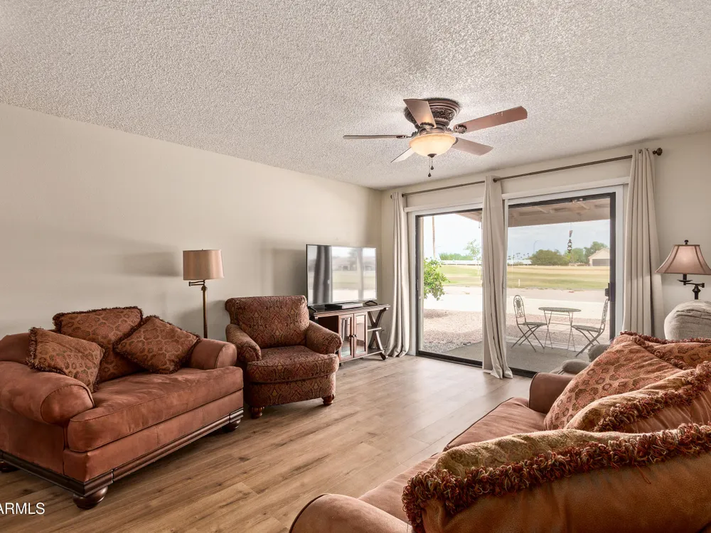 Enjoy the view on your extended patio over-looking the golf course! Move-in ready! Beautiful split 2 bedroom, 1 3/4 bath with a single car garage. New HVAC and Vinyl Plank Flooring in 2022. Fresh paint, granite counter tops in the kitchen, skylight, updated lighting, and ceiling fans. New fridge, washer, and dryer. New blinds. Newer hotwater heater and disposal. Direct access from garage and inside laundry. Active Adult 55+ Gated Community, FOUNTAIN OF THE SUN! Enjoy this Country Club & Golf Community offering lakes, billiards, top of the line golf course, post office, etc. Lots of planned activities, pickleball, yoga, arts & crafts, card room, shuffleboard, etc. Birdie's restaurant opened daily..