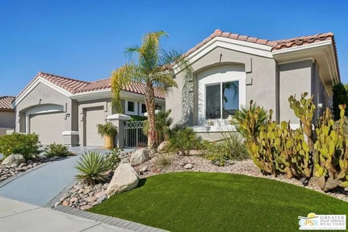 Set on a quiet street near the Sunset View Clubhouse, this upgraded 3 bedroom, 3 bath extended Monaco with extended garage offers over 2,500 sq ft of versatile desert living inside Del Webb Sun City Palm Desert, one of the country's most sought after 55+ communities. The light filled great room opens to a private backyard with lawn, spa, and waterfall, creating a true indoor-outdoor retreat. The open kitchen and family room feature a large center island and casual dining area ideal for entertaining or everyday comfort. The primary suite includes a very spacious walk-in closet, large bathroom closet with plenty of storage, and beautiful spa-style shower. Two additional suites, each with their own private access, offer exceptional flexibility for guests, a home office, or income-producing casitas. Additional highlights include a laundry room, oversized two car garage, plus a dedicated golf cart garage. Residents enjoy access to two championship golf courses, resort-style pools, a modern fitness center, walking trails, clubhouses, dining, and endless social activities, all within a beautifully maintained, guard gated community. This is relaxed, resort-style desert living at its finest. Furnishings available outside of escrow
