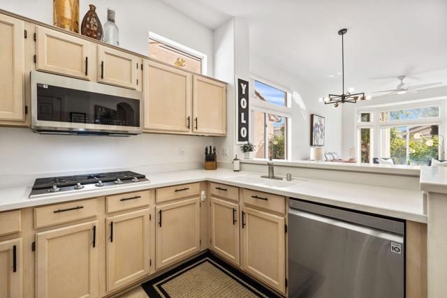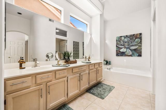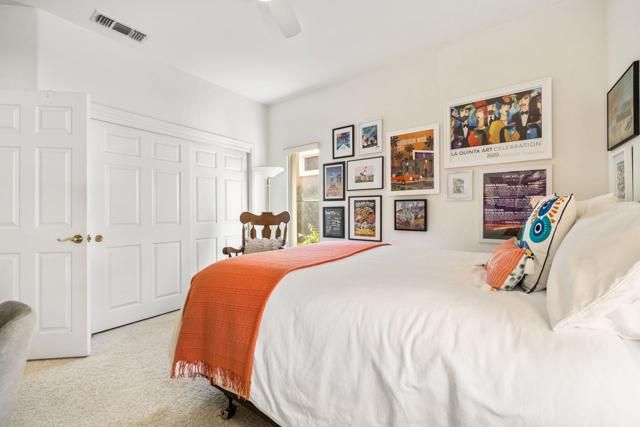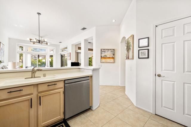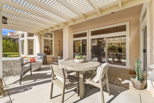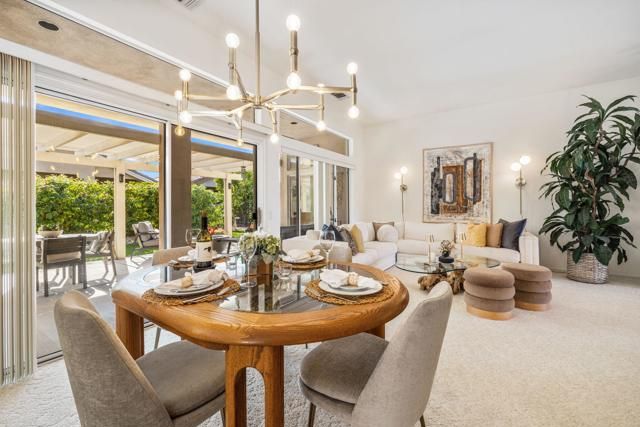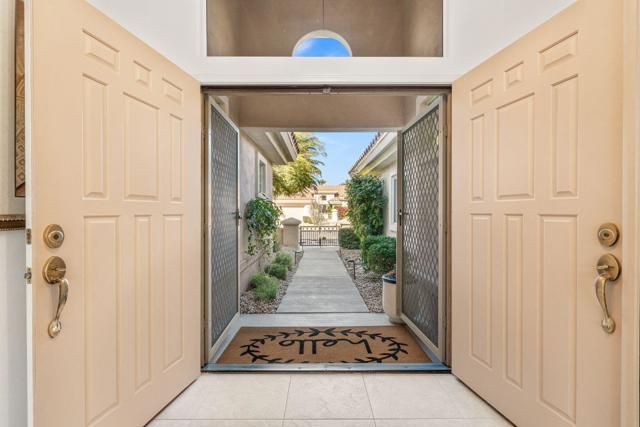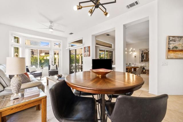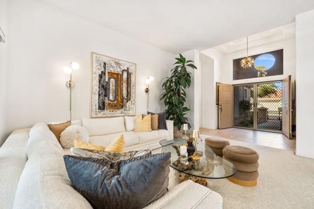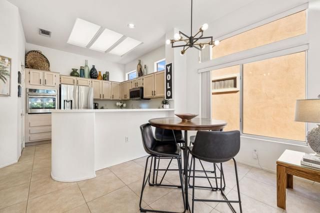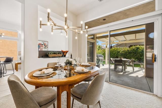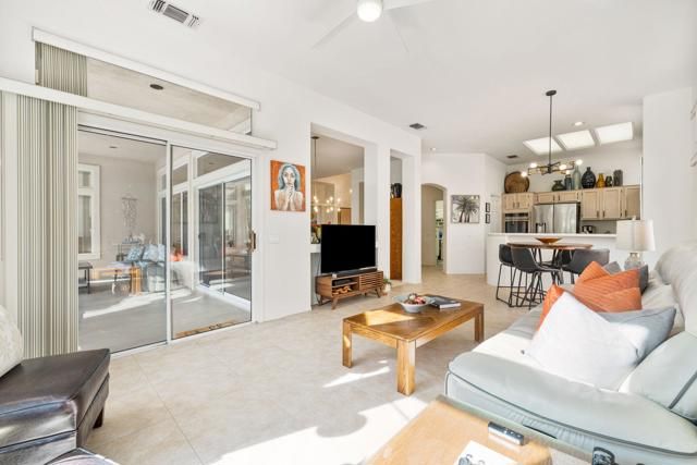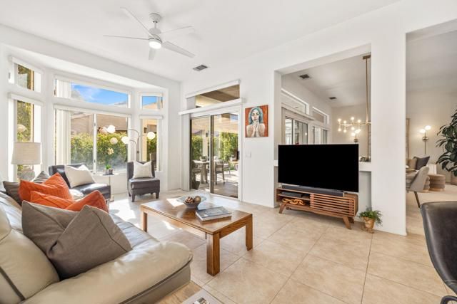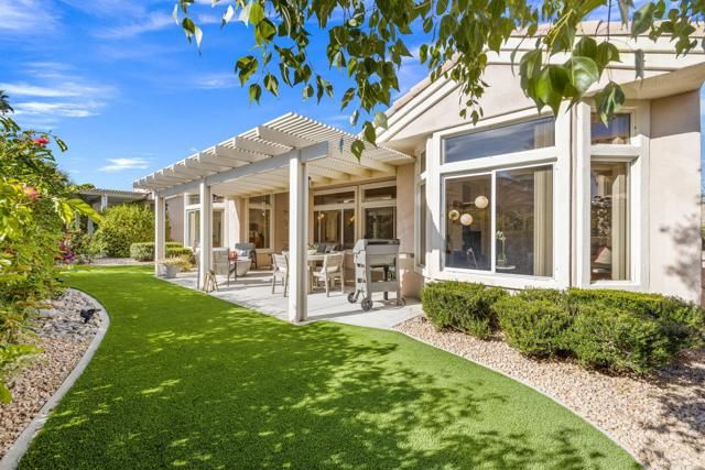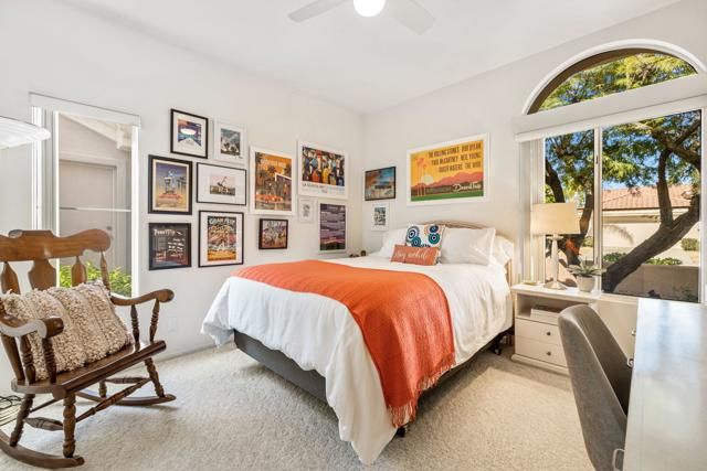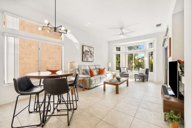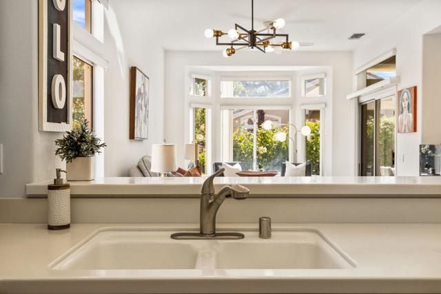 Located in the best 55+ community in the desert, Sun City Palm Desert, this Baccarat model is one of the favorites. It has A NEWER HVAC SYSTEM, high ceilings, transom windows, 2 bedrooms, 2 bathrooms, and an attached 2-car garage. The kitchen is open to the family room and has newer stainless steel appliances, with a fabulous French fridge, a shoulder-height wall oven, an eating bar, a pantry, and cabinet hardware. The family room, living room, and dining rooms all view the beautifully landscaped and luxury-appointed backyard, which will be fully fenced. The spacious, bright master suite has a bay window that views the south-facing extended patio, with an Alumawood cover, beautiful turf, and delicious lemon, orange, and lime trees. The bathroom has a double vanity, a soaking tub, a walk-in shower, and a walk-in closet. The inviting guest bedroom is on the opposite end of the home, and has a lovely built-in desk unit, an arched window design, and is adjacent to the 2nd full bath. The laundry room includes the washer and dryer, upper cabinets, and a convenient desk. The 2-car garage has a golf cart nook, a side door, and a ''level 2'' EV charger. Turnkey furnishings, and golf cart are available outside of escrow. SUN CITY PALM DESERT IS ALL ABOUT LIFESTYLE!! It has many clubs, activities, amenities, and low HOA dues. Play at 2 championship 18-hole golf courses and practice facilities, pickle ball, tennis, softball, bocce ball, an 18-hole miniature golf course, an honor library, arts and crafts, a ballroom for special entertainment, and 4 saltwater pools kept at 87 degrees with hot tubs. Enjoy 2 great restaurants, a martini/coffee bar, and even a post office. There is a newly renovated, classy indoor/outdoor bar with fire tables to enjoy the awesome views and our beautiful desert weather.