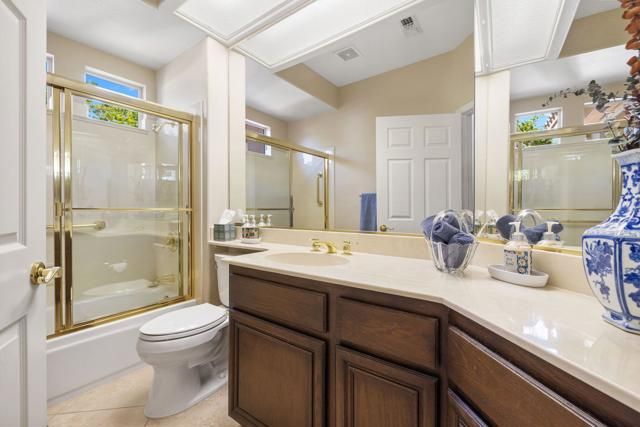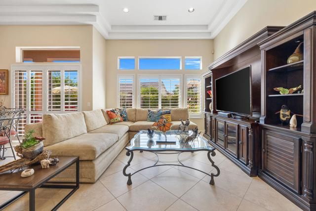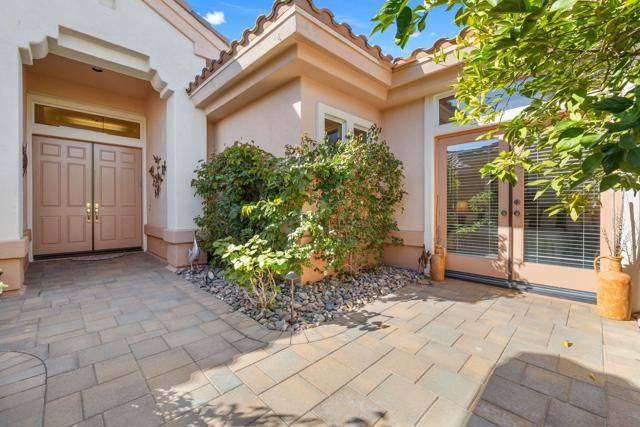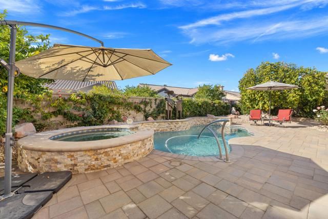 Located in the best 55+ community in the valley, Sun City Palm Desert, This Emerald model is one of the most popular. It has 3 bedrooms, and 3 bathrooms. There is a newer saltwater, pebble tech POOL AND SPA with beautiful pavers all the way around the home. As you enter the gated courtyard, there is a double door accessing the ''attached casita (2nd suite), a lovely fountain, and the beautiful leaded glass, double entry doors. As you enter, you'll notice the gorgeous soaring triple tray ceilings, which are very rare, in only a few models. The living room and dining room both view the sparkling newer pool and spa. The kitchen opens to the family room and kitchenette, all with views of the stunning backyard and Built-in BBQ. The Guest bedroom/office suite is adjacent to the kitchen. The laundry room has cabinets, and the washer and dryer are included. The master bedroom has a bay window, viewing the lovely south-facing pool and spa and fruit trees. The master bath has a double vanity, walk-in shower, walk-in custom closet, soaking tub, and a private toilet room. Down the hall is the ''attached casita'', or 2nd Master suite. It is extended with French doors out to the courtyard, and has a full bathroom. The suite can lock-off from the home, or serve as a luxurious guest bedroom. The 2-car garage has epoxy coating, a mini-split, and a golf cart garage. Home is not staged. Turnkey furnishings are available outside of escrow. SUN CITY PALM DESERT IS ALL ABOUT LIFESTYLE!! It has many clubs, activities, amenities, and low HOA dues. Play at 2 championship 18-hole golf courses and practice facilities, pickleball, tennis, softball, bocci ball, an 18-hole miniature golf course, an honor library, arts and crafts, a ballroom for special entertainment, and 4 saltwater pools kept at 87 degrees with hot tubs. Enjoy 2 great restaurants, a martini/coffee bar, and even a post office. There is a newly renovated, classy indoor/outdoor bar with fire tables to enjoy the awesome views and our beautiful desert weather.