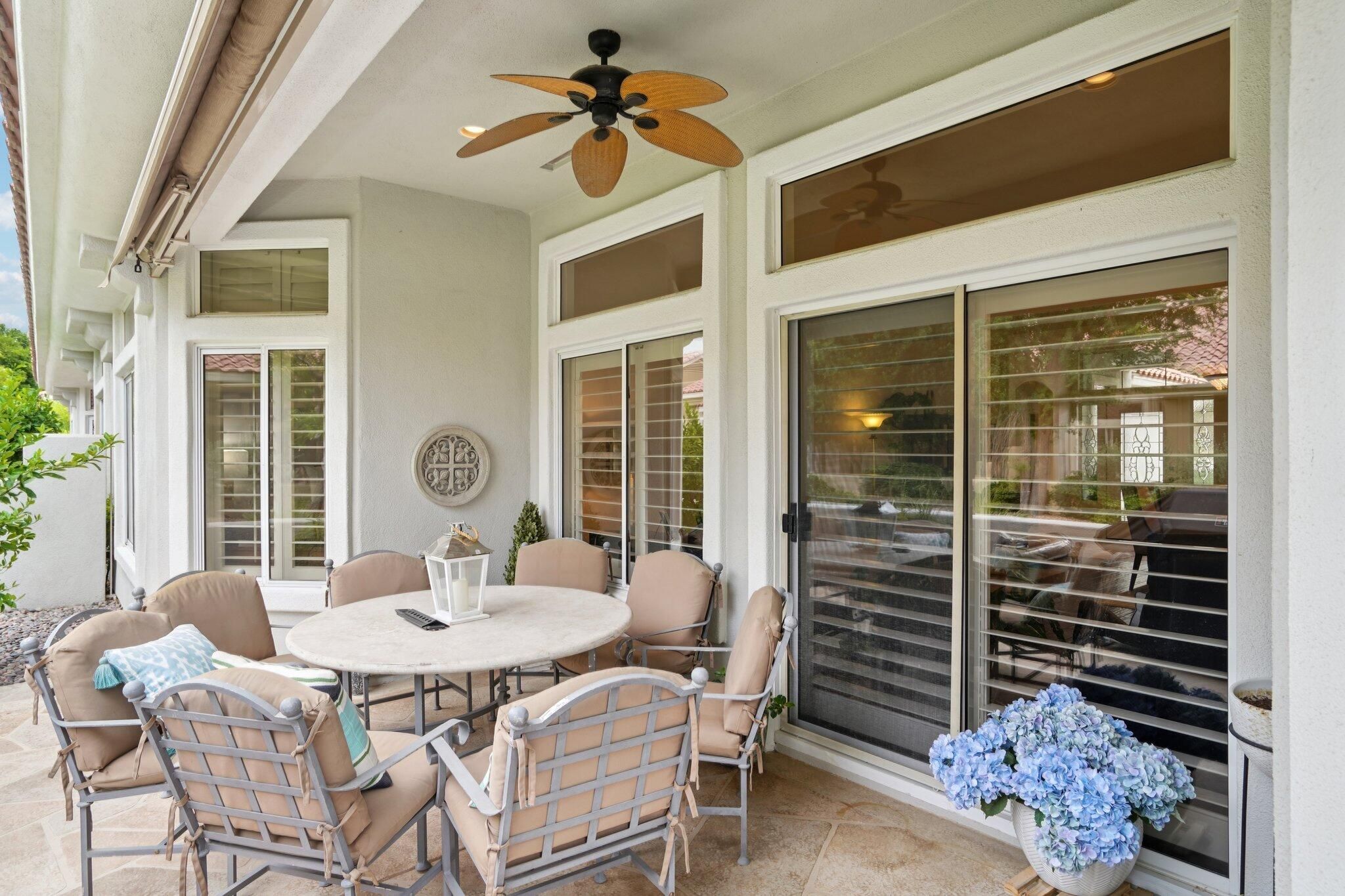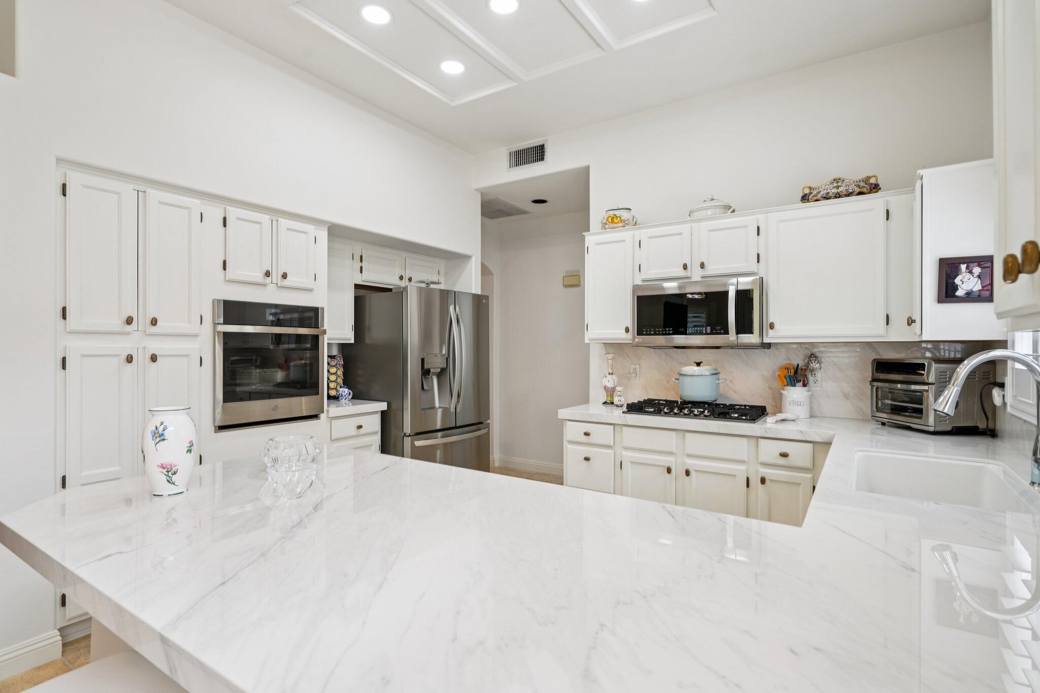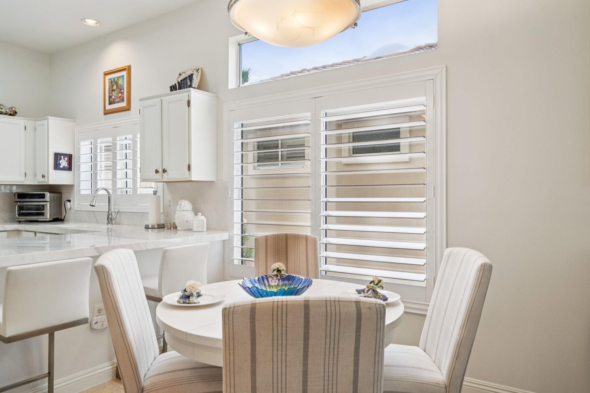 Beautifully refreshed and move-in ready, this elegant residence offers timeless charm with modern upgrades throughout. Located in the heart of Sun City, the home features fresh interior paint and newly installed plantation shutters that enhance both style and privacy. Inside, travertine marble floors add warmth and sophistication, while the updated kitchen boasts sleek porcelain countertops and a brand new gas cooktop replacing the previous electric setup for improved performance. The open floor plan flows seamlessly, ideal for both everyday living and entertaining. Step outside to enjoy a professionally landscaped yard with a stone garden walkway and an electric canvas patio cover for effortless shade and comfort. Every detail has been thoughtfully curated to elevate the living experience. Don't miss this opportunity to own a beautifully updated home in one of the desert's most desirable 55+ communities.