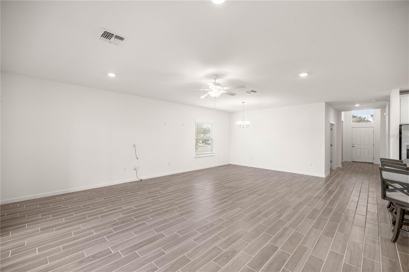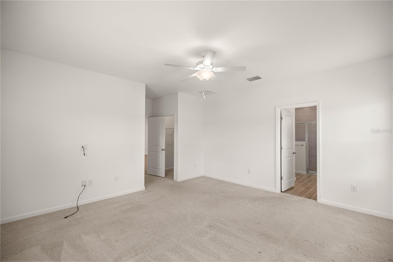 - Built-in Features, Ceiling Fan(s), High Ceilings, Kitchen/Family Room Combo, L-Shaped Dining Room, Open Floorplan, Main Level Primary, Split Bedrooms, Thermostat, Walk-In Closet(s)