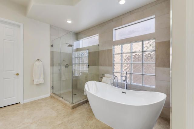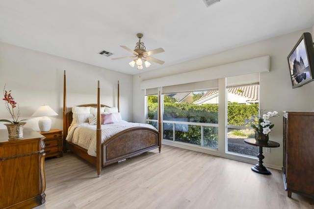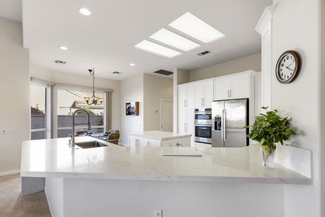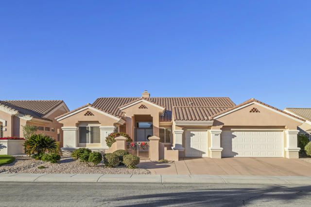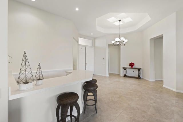 Sun City Palm Desert - THE ONE AND ONLY ST TROPEZ available right now and this one is ABSOLUTE PERFECTION! Newly remodeled from TOP to BOTTOM you will love entering into this SPECTACULAR GREAT ROOM floor plan with 12 foot ceilings! The St Tropez is famous for its HUGE great room design accompanied by a welcoming bar area for your guests to relax! !I It also includes a builtin beverage refrigerator and lovely upgraded sink and hardware, The choices of materials in this TRANSFORMATION are very tasteful with a huge TOUCH. OF CLASS! The beautiful Quartz countertops are a special feature in the kitchen, the bar area, two of the bathrooms and even the LAUNDRY ROOM area! Beautiful flooring throughout with newly installed 20' tile is tastefully installed on the diagonal in the open areas with neutral luxury vinyl in the den and bedrooms. The kitchen is unbelievable with gorgeous white shaker custom cabinetry with beautiful chrome handles, luscious quartz countertops, deep pull out pantry shelves, a deep stainless sink with a quality faucet that is absolutely striking! PLUS ALL NEW STAINLESS APPLIANCES! Walls of glass in the great room overlook the huge extended patio which is very private and includes mature landscaping. The TV wall In the great room can be totally open with plenty of space for your 85' big screen TV! The primary bedroom is very large with access to the rear patio by a shuttered door. The redesigned bath is outstanding with 2' x 1' tiles in 2 tones , and inviting rainhead fixture and extra handheld with a high quality rimless shower enclosure. Adjacent to the shower is a sumptuous deep soaking tub to enjoyi! There is also a huge closet available.In addition there are dual custom sinks along with upgraded hardware surrounded by that beautiful quartz! The secondary bedroom has beautiful high quality vinyl flooring with beautiful shutters on the windows. The bathroom has the same quartz with custom sink and new hardware. The walk in shower is totally remodeled again with 2'x1' tiles.a rainheadShower head and a fabulous shower enclosure. The den is very large adjacent to the great room near the front entry. The laundry room is humongous! Washer dryer, deep sink,Quartz counters and lots of cabinets for storage, The 2 car plus golf cart garage is EXTENDED! ALSO INCLUDES a cabinet with a WATER SOFTENER (OWNED NOT LEASED)The extended patio is HUGE with lots of mature plants as a backdrop to your private area!