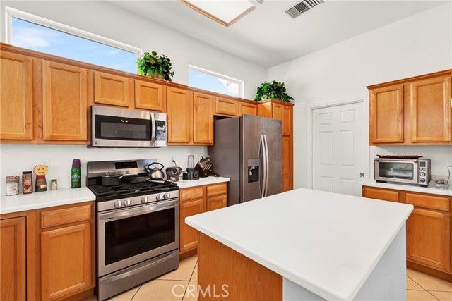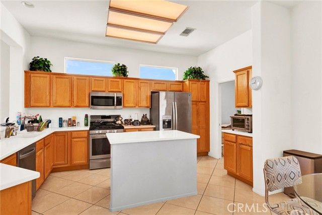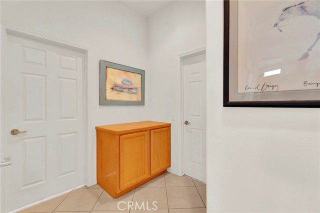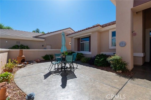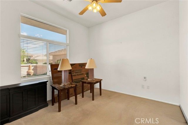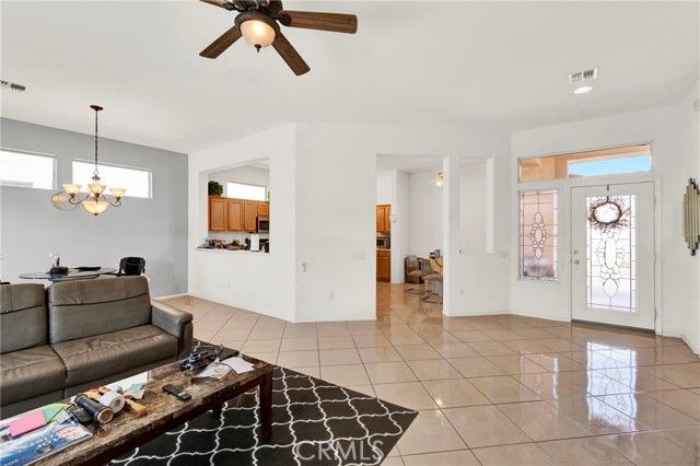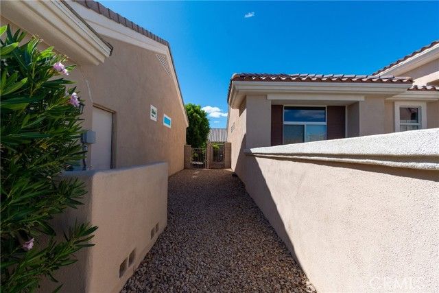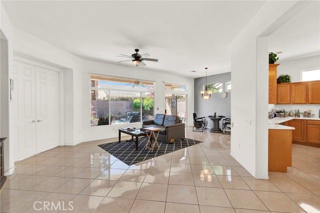 Located in Sun City Palm Desert - Morocco, just around the corner from the Lakeview Clubhouse (fitness center, indoor track, outdoor pool). This popular greatroom floorplan features a south-facing backyard with a large patio and low-maintenance desert landscaping. The home has a gated front courtyard, decorative hardscape, and a leaded-glass front door. Inside are 10-ft ceilings, transom windows, and 18" diagonal tile throughout (except bedrooms and den). The kitchen offers maple cabinets, Corian counters, a chef's island, and stainless appliances. A den/office sits off the greatroom. Double doors lead to the primary suite with a bay window and a large walk-in closet; the primary bath has dual sinks and a glass-enclosed stall shower. The guest bath includes a tub/shower. The 2-car garage has space for a golf cart and an epoxy floor. AC was replaced in 2019.