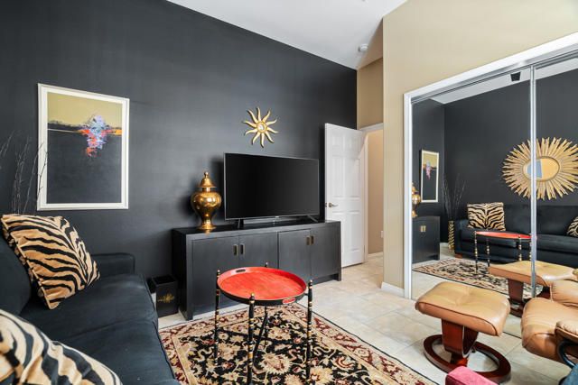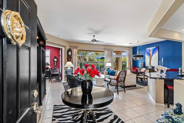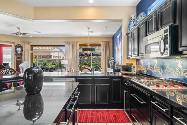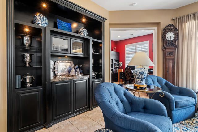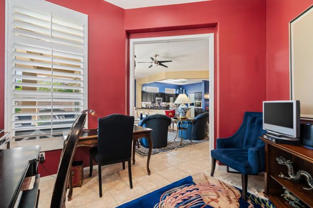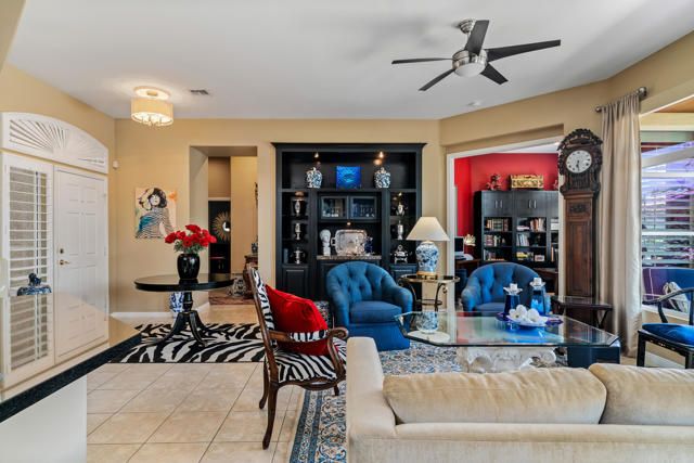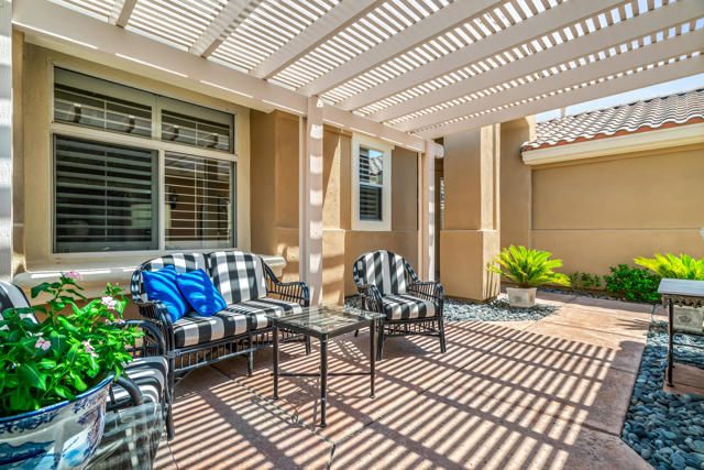 Sun City Palm Desert - Morocco with Casita - Prime Location and a block from the Mountain View Clubhouse. This highly upgraded Morocco model with Casita offers privacy and functionality. The north-facing backyard features low-maintenance landscaping, citrus trees, and an extended patio, perfect for relaxing or entertaining.A gated front courtyard with a shaded seating area adds a welcoming touch. Inside, enjoy 10-ft ceilings, plantation shutters, transom windows, and tile flooring throughout the main areas. The spacious great room includes a built-in entertainment center with granite counter and lighting.Kitchen walls have been removed to create the open concept favoring direct views to the rear yard and patio. It's is a chef's delight with granite counters, prep island, spacious breakfast area, custom backsplash, Wolf range, a wall oven and upgraded stainless steel appliances.The den flows easily from the great room, creating additional flexible living space and is framed for double doors. The primary suite features a double door entry, a bay window, custom walk-in closet with built-ins, a beautifully appointed bathroom with dual sinks and a large walk-in shower.The guest bathroom has a shower over tub and is adjacent to the guest bedroom.The separate casita offers a charming, private guest experience with its own bedroom, bathroom, kitchenette with built-in cabinets and shaded patio area - ideal for visitors or a home office.The laundry room includes a pantry and is located off the kitchen.The two-car garage also has a golf cart nook. The evaporative cooler, garage door motor (super quiet), main 5 ton-18 seer A/C system, water heater, water pressure regulator and several trees have been replaced over the last 3 years.A rain gutter has been installed over patio.Most furnishings can be available for purchase separate from escrow. Don't miss this exceptional opportunity to live in one of Sun City Palm Desert's most sought-after homes.