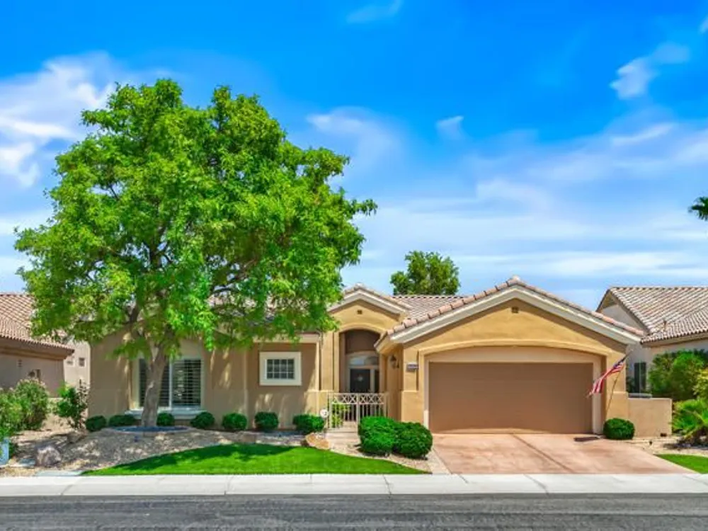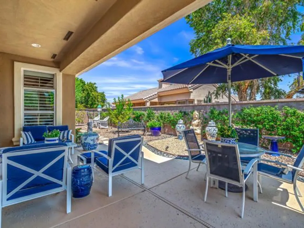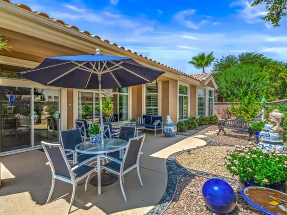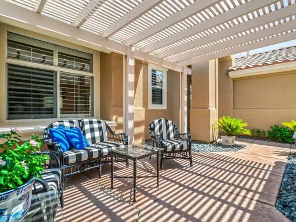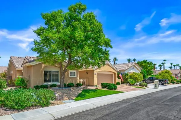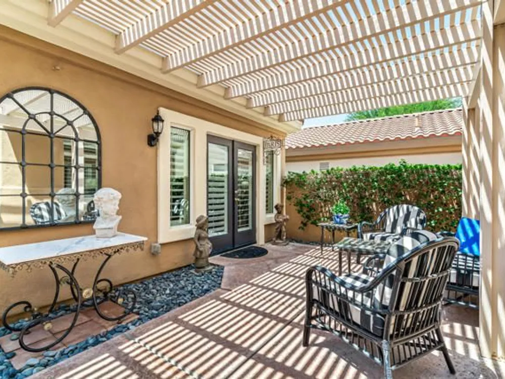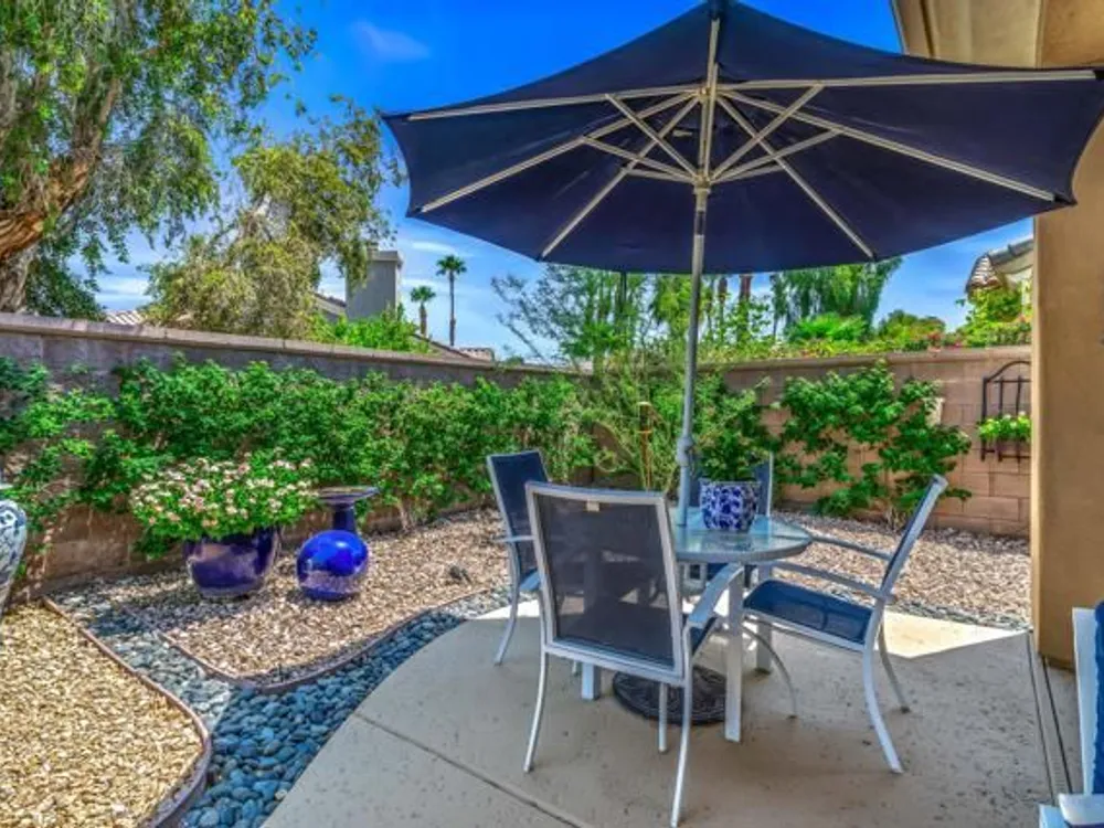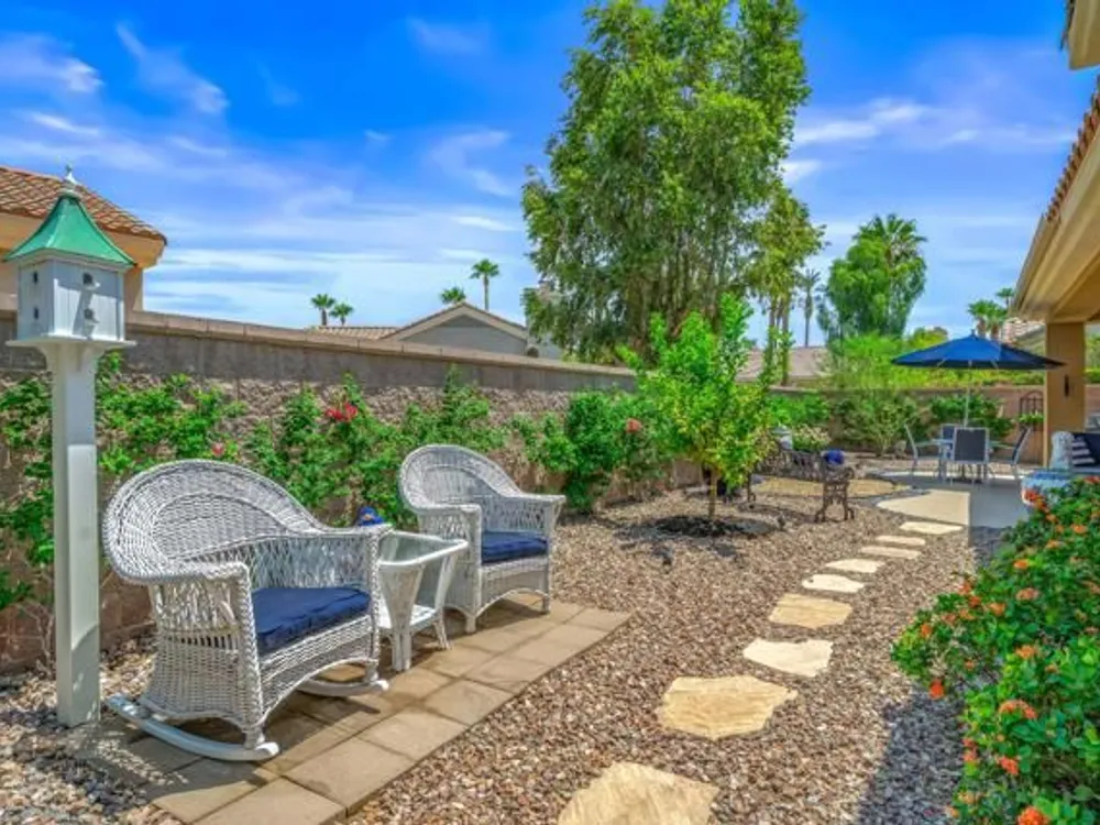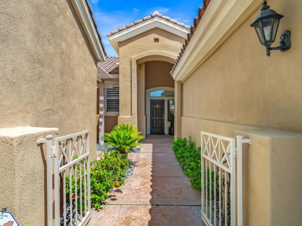 Sun City Palm Desert - Morocco with Casita - Prime Location and a block from the Mountain View Clubhouse. This highly upgraded Morocco model with Casita offers privacy and functionality. The north-facing backyard features low-maintenance landscaping, citrus trees, and an extended patio, perfect for relaxing or entertaining.A gated front courtyard with a shaded seating area adds a welcoming touch. Inside, enjoy 10-ft ceilings, plantation shutters, transom windows, and tile flooring throughout the main areas. The spacious great room includes a built-in entertainment center with granite counter and lighting.The kitchen is a chef's delight with granite counters, custom backsplash, stainless steel appliances, a chef's island and breakfast area.The den flows easily from the great room, creating additional flexible living space and is framed for double doors. The primary suite features a bay window, custom walk-in closet with built-ins and a pocket door leading to a beautifully appointed bathroom with dual sinks and a large walk-in shower.The guest bathroom has a shower over tub and is adjacent to the guest bedroom.The separate casita offers a charming, private guest experience with its own bedroom, bathroom, kitchenette and shaded patio area - ideal for visitors or a home office.The laundry room is located off the kitchen.The two-car garage also has a golf cart nook and swamp cooler.The main A/C system has been replaced with a 5 ton 18 seer. Rain gutter has been installed over patio. Don't miss this exceptional opportunity to live in one of Sun City Palm Desert's most sought-after homes.