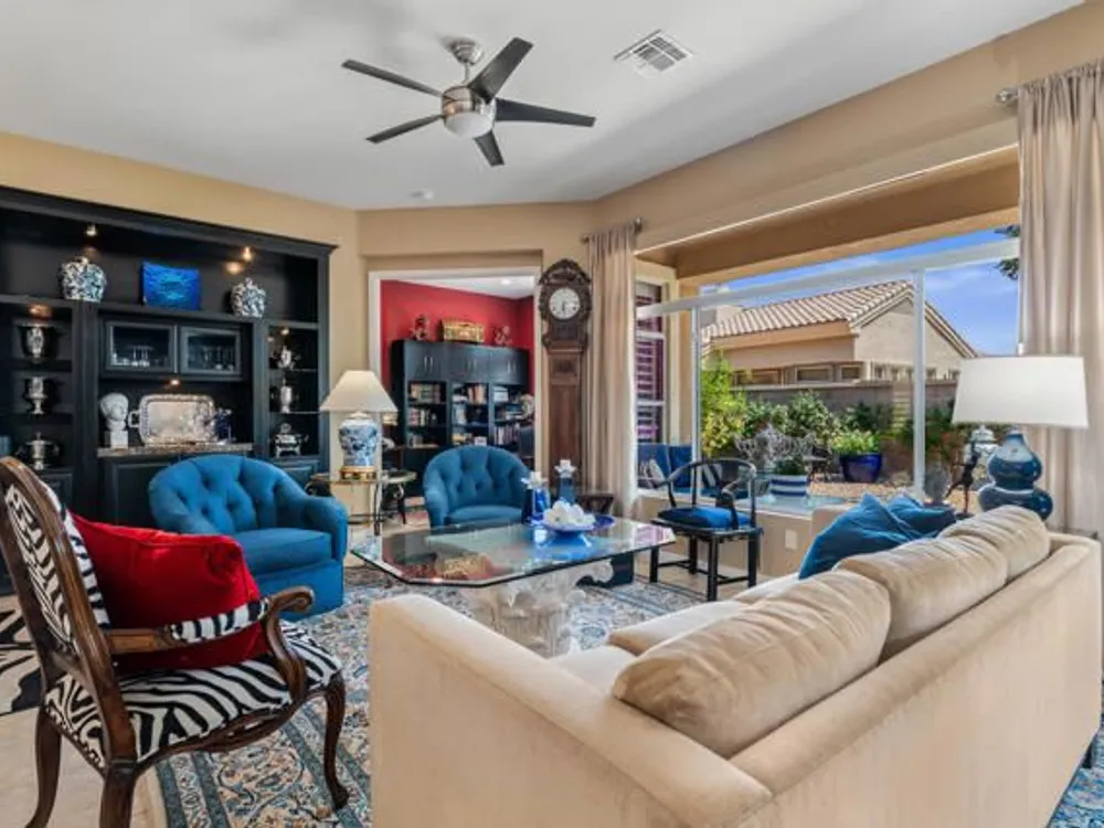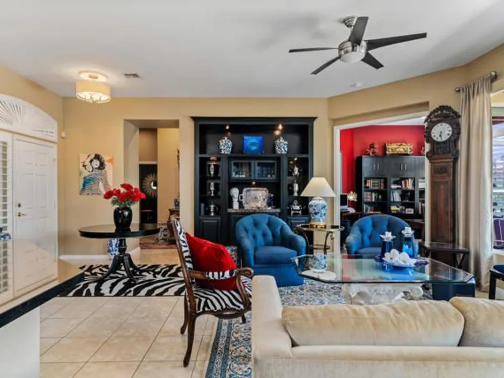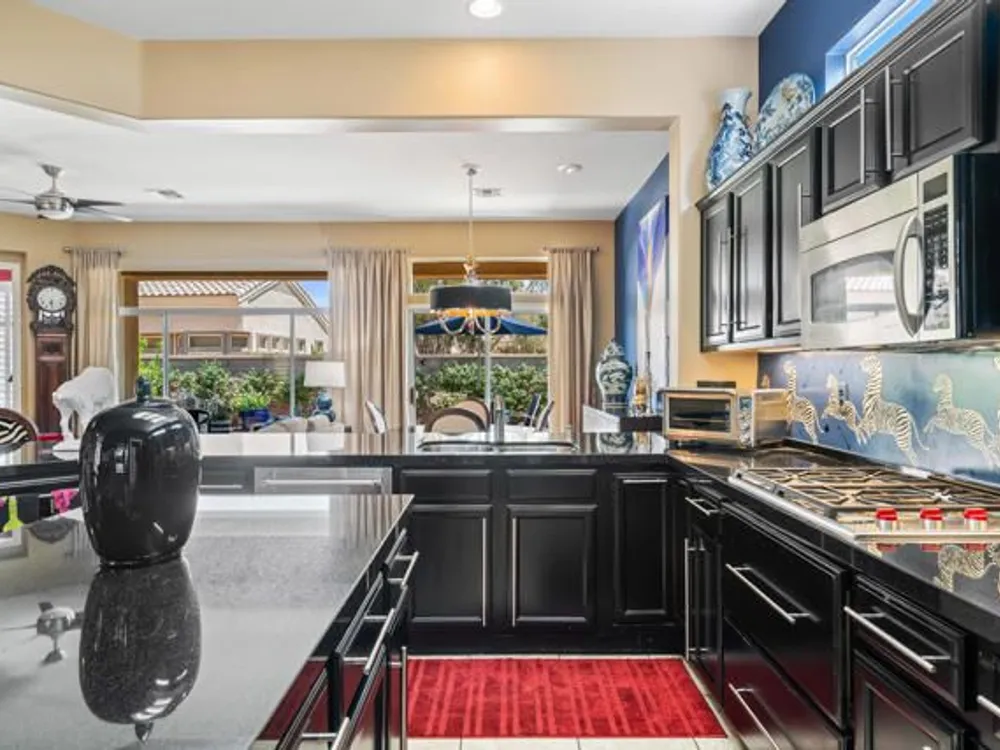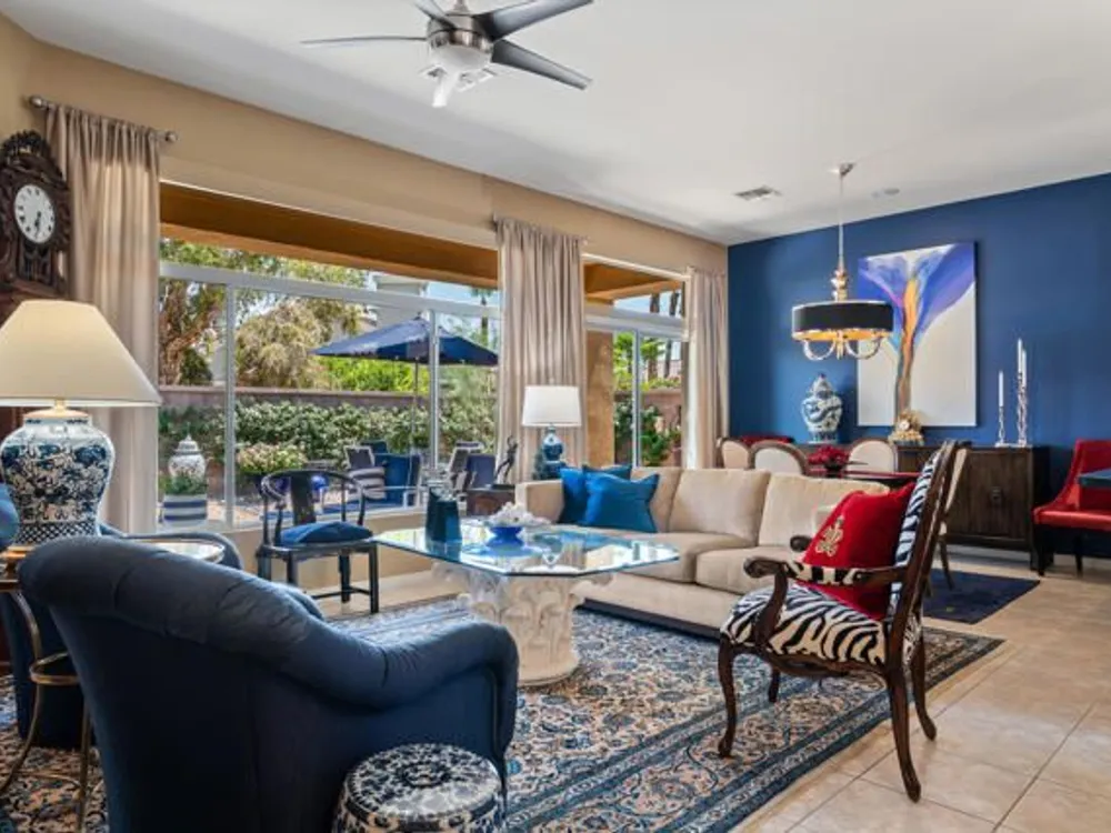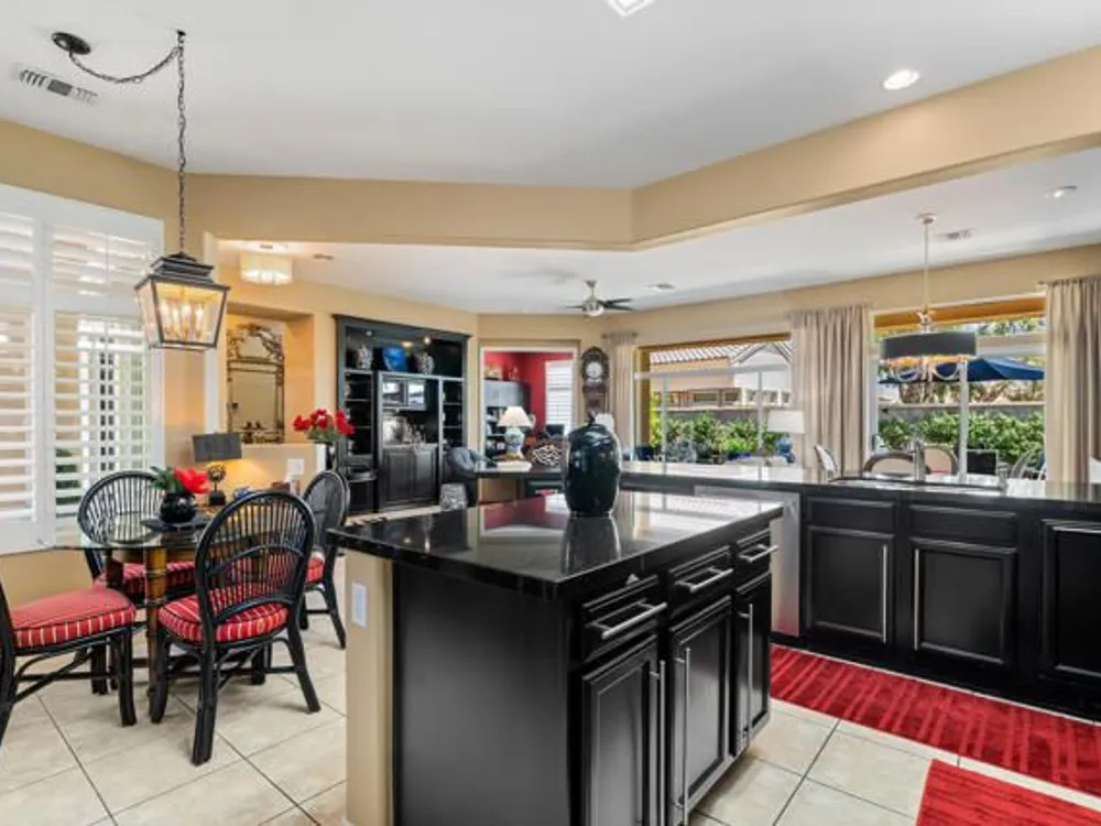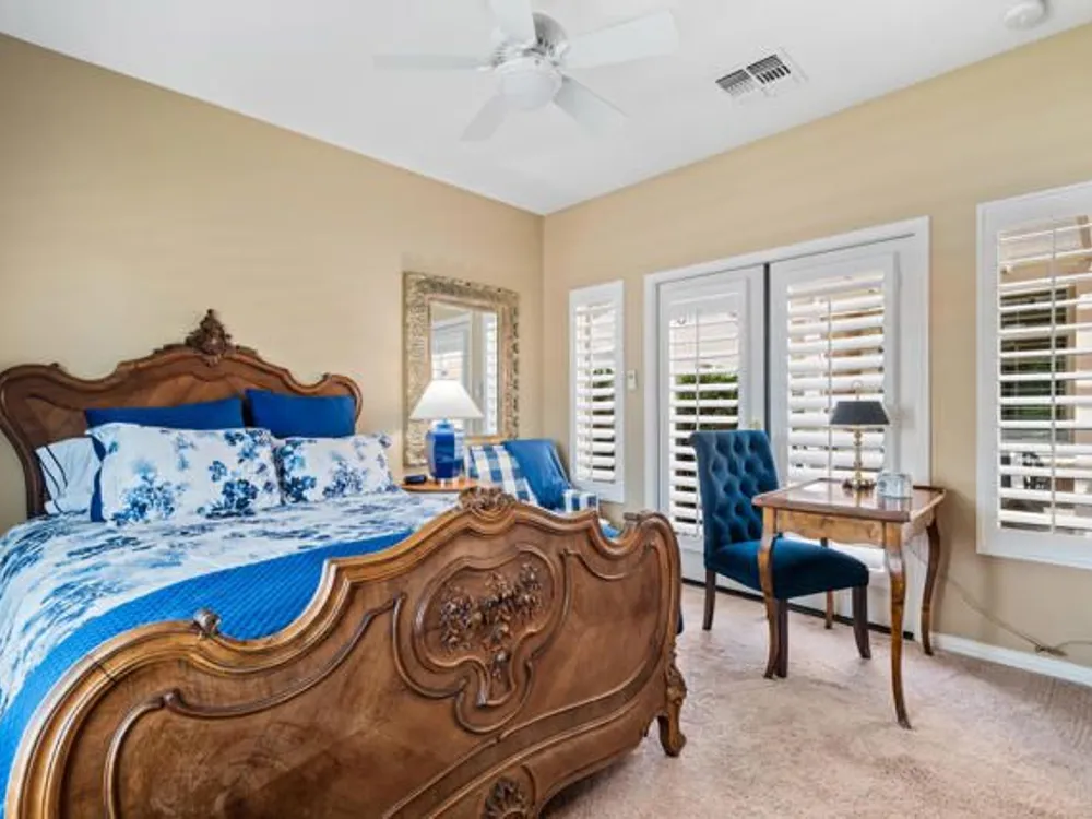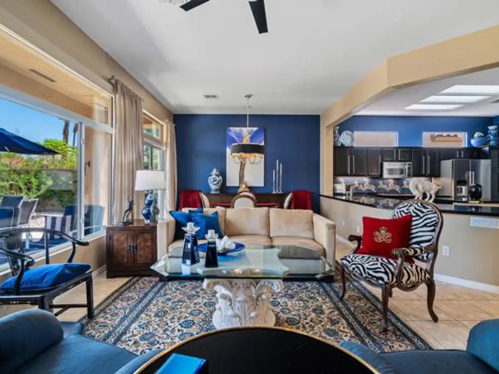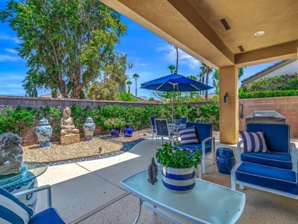 Sun City Palm Desert - Morocco with Casita - Prime Location and a block from the Mountain View Clubhouse. This highly upgraded Morocco model with Casita offers privacy and functionality. The north-facing backyard features low-maintenance landscaping, citrus trees, and an extended patio, perfect for relaxing or entertaining.A gated front courtyard with a shaded seating area adds a welcoming touch. Inside, enjoy 10-ft ceilings, plantation shutters, transom windows, and tile flooring throughout the main areas. The spacious great room includes a built-in entertainment center with granite counter and lighting.The kitchen is a chef's delight with granite counters, custom backsplash, stainless steel appliances, a chef's island and breakfast area.The den flows easily from the great room, creating additional flexible living space and is framed for double doors. The primary suite features a bay window, custom walk-in closet with built-ins and a pocket door leading to a beautifully appointed bathroom with dual sinks and a large walk-in shower.The guest bathroom has a shower over tub and is adjacent to the guest bedroom.The separate casita offers a charming, private guest experience with its own bedroom, bathroom, kitchenette and shaded patio area - ideal for visitors or a home office.The laundry room is located off the kitchen.The two-car garage also has a golf cart nook and swamp cooler.The main A/C system has been replaced with a 5 ton 18 seer. Rain gutter has been installed over patio. Don't miss this exceptional opportunity to live in one of Sun City Palm Desert's most sought-after homes.