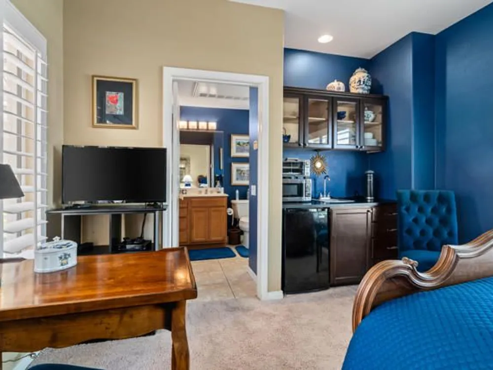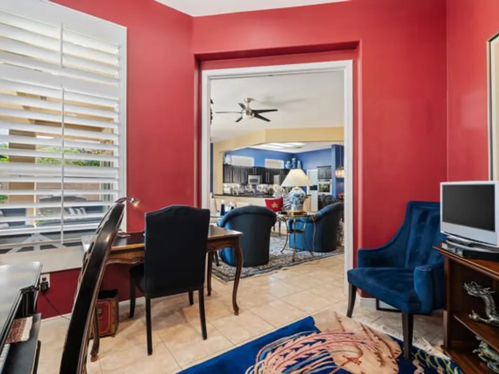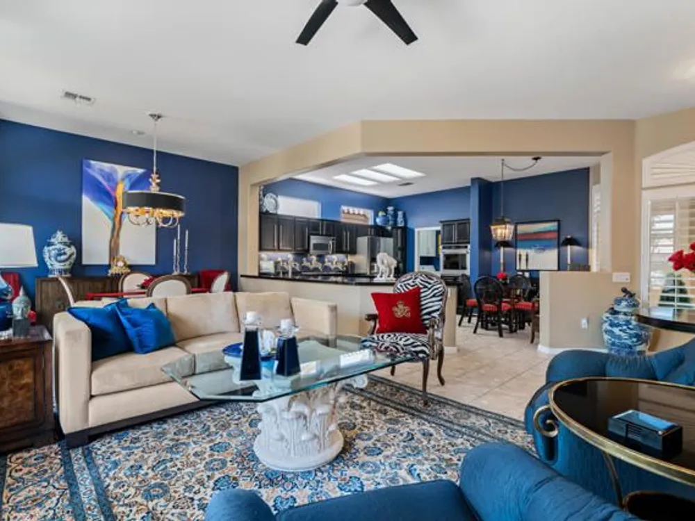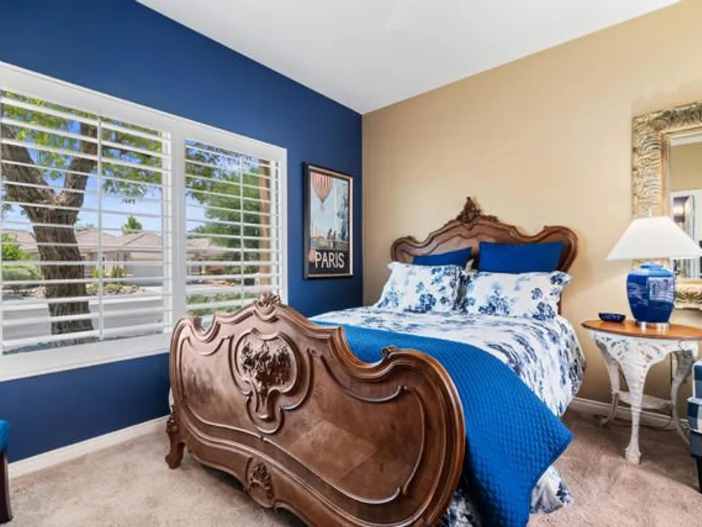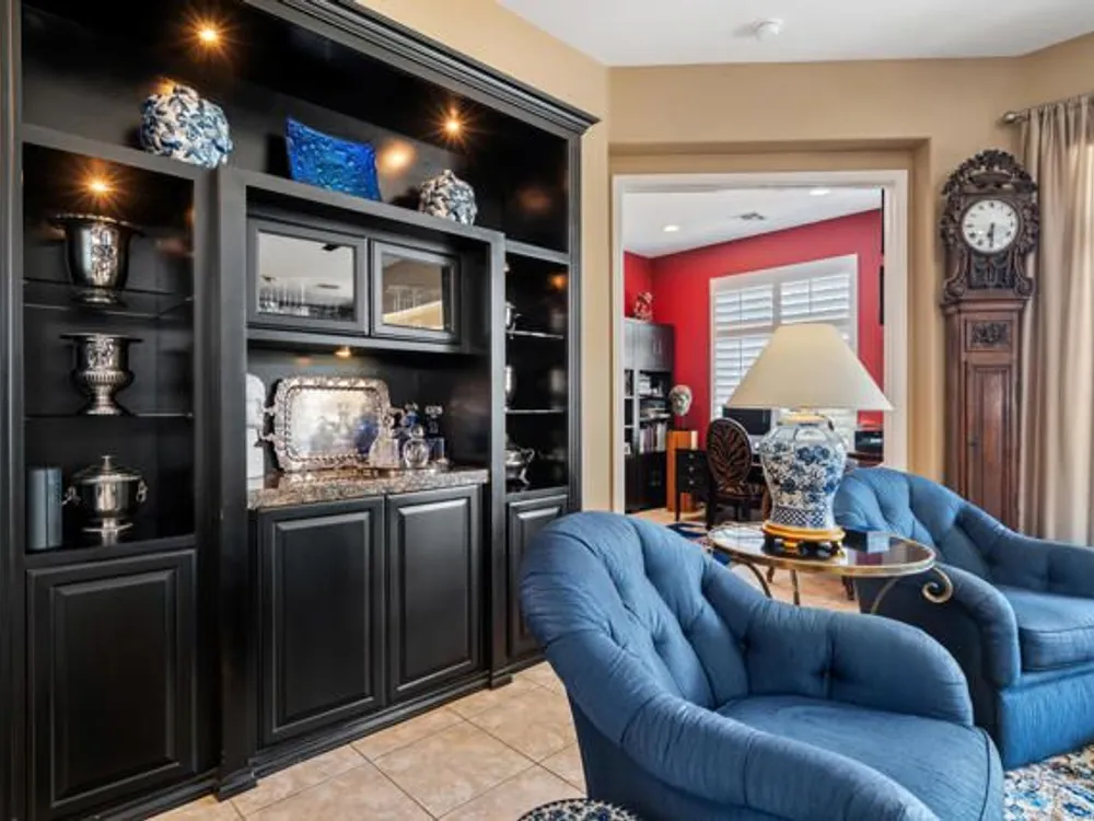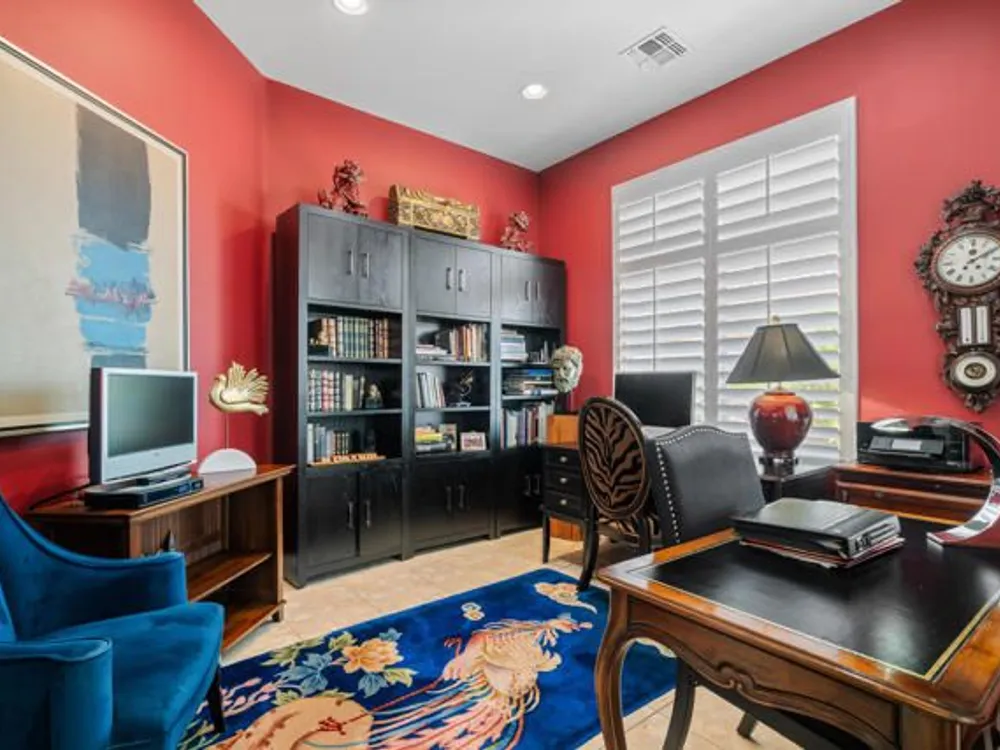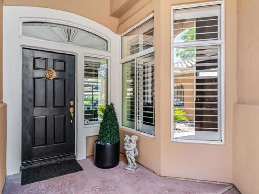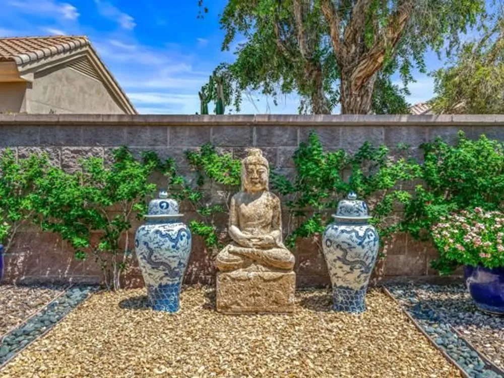 Sun City Palm Desert - Morocco with Casita - Prime Location and a block from the Mountain View Clubhouse. This highly upgraded Morocco model with Casita offers privacy and functionality. The north-facing backyard features low-maintenance landscaping, citrus trees, and an extended patio, perfect for relaxing or entertaining.A gated front courtyard with a shaded seating area adds a welcoming touch. Inside, enjoy 10-ft ceilings, plantation shutters, transom windows, and tile flooring throughout the main areas. The spacious great room includes a built-in entertainment center with granite counter and lighting.The kitchen is a chef's delight with granite counters, custom backsplash, stainless steel appliances, a chef's island and breakfast area.The den flows easily from the great room, creating additional flexible living space and is framed for double doors. The primary suite features a bay window, custom walk-in closet with built-ins and a pocket door leading to a beautifully appointed bathroom with dual sinks and a large walk-in shower.The guest bathroom has a shower over tub and is adjacent to the guest bedroom.The separate casita offers a charming, private guest experience with its own bedroom, bathroom, kitchenette and shaded patio area - ideal for visitors or a home office.The laundry room is located off the kitchen.The two-car garage also has a golf cart nook and swamp cooler.The main A/C system has been replaced with a 5 ton 18 seer. Rain gutter has been installed over patio. Don't miss this exceptional opportunity to live in one of Sun City Palm Desert's most sought-after homes.