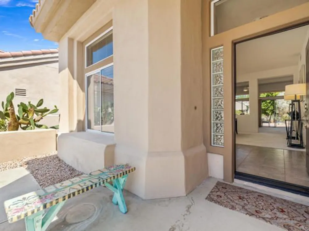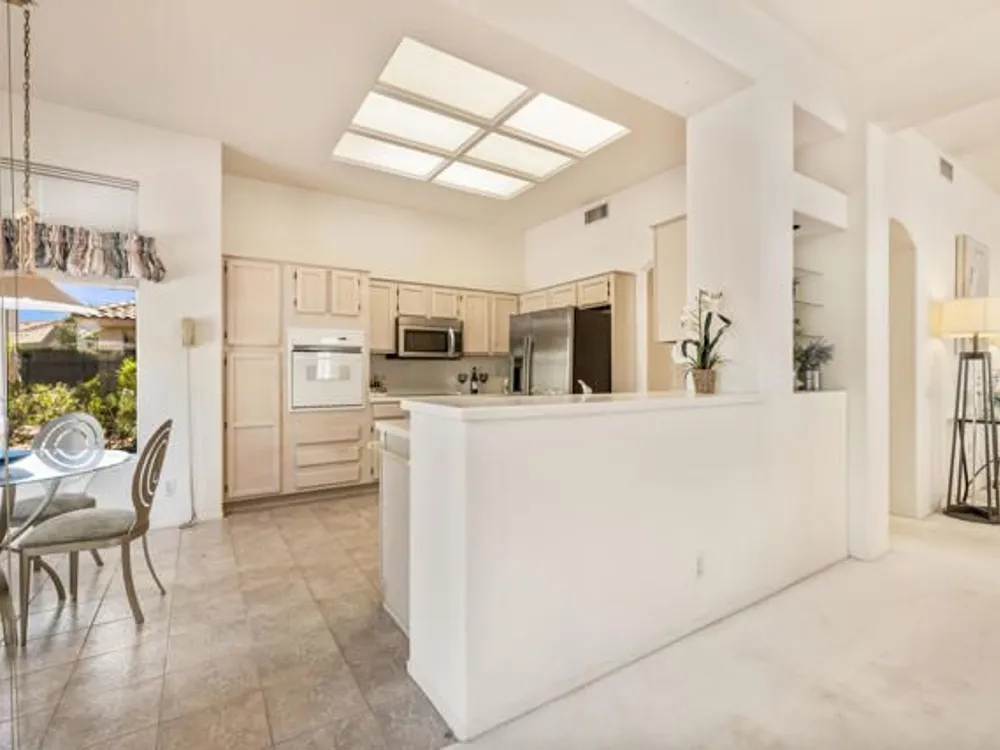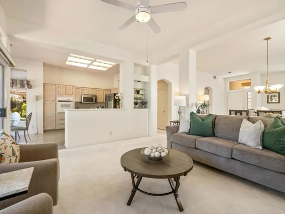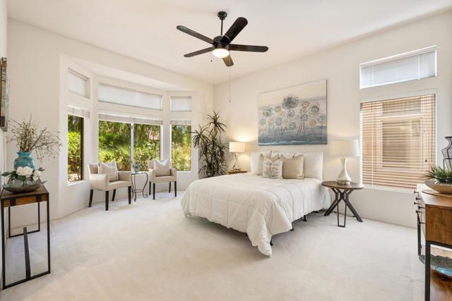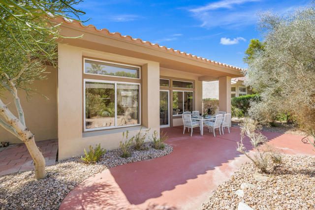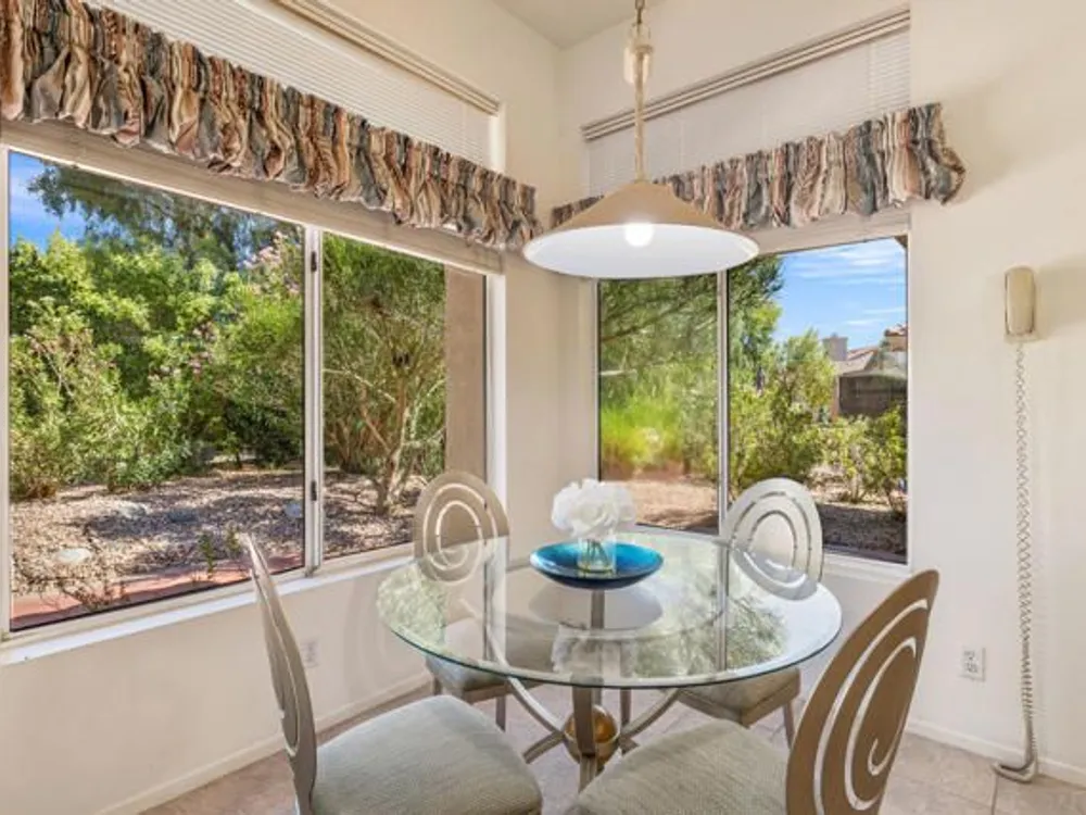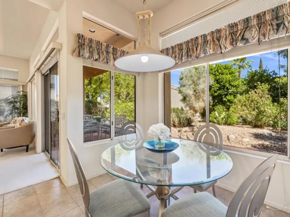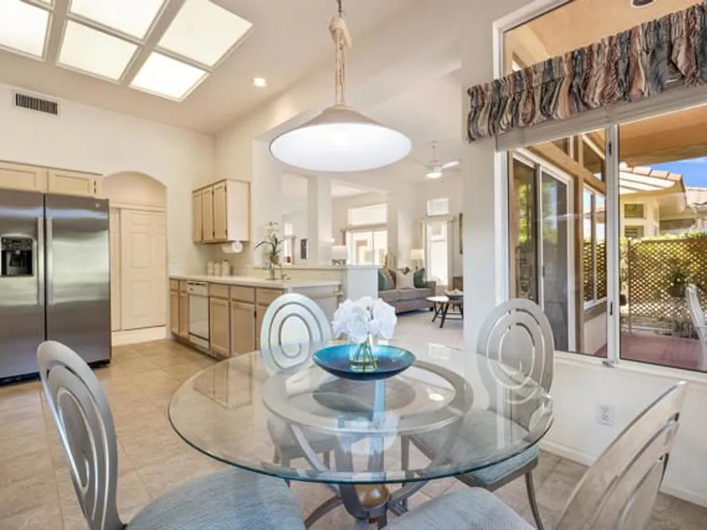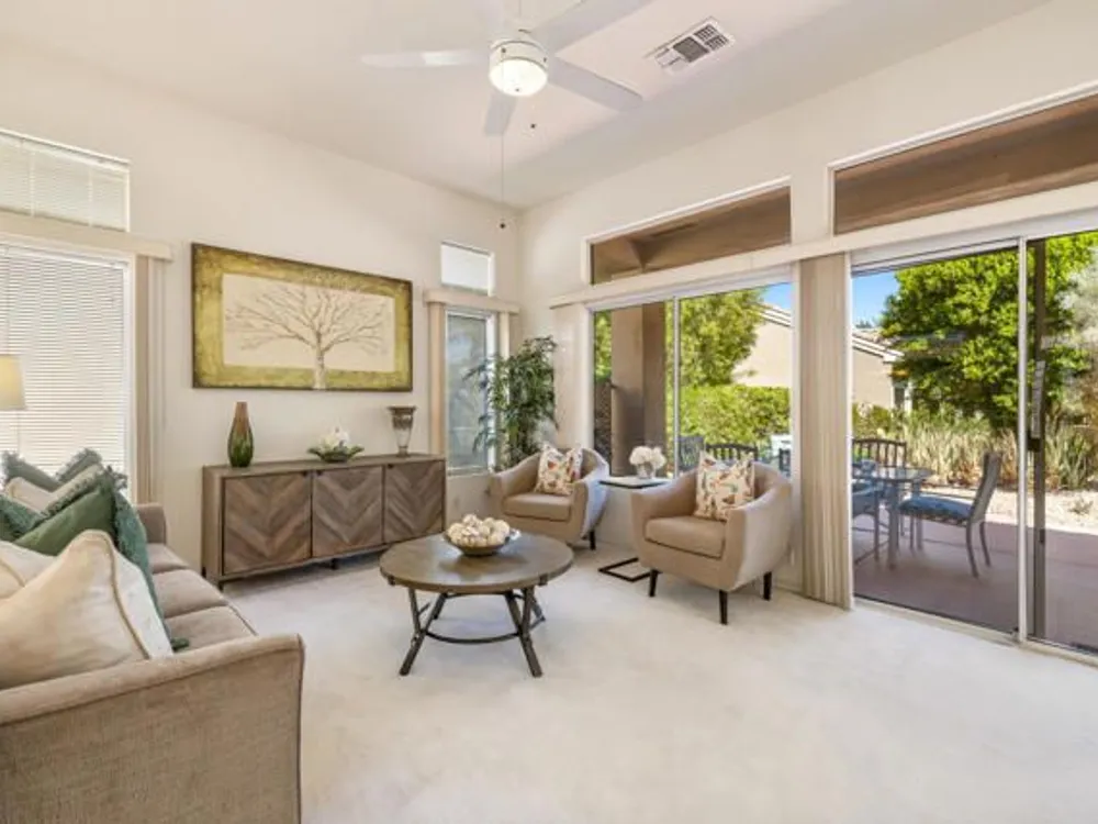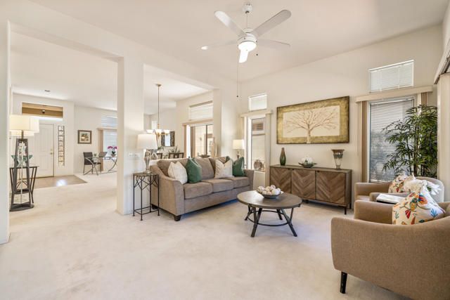 55+ Sun City Palm Desert. The BEST ''Bang for your Buck'' active retirement community in the whole Coachella Valley and beyond! This very popular great room LALIQUE model is located within walking distance or short golf cart ride to the Mountain View Clubhouse. The curb appeal is nice with desert landscaping, spacious gated courtyard with perfect area for your morning coffee. Inside, this home features 2 bedrooms and 2 baths, high ceilings and transom windows creating an airy light space. There are alot of storage space and cabinets,, The kitchen has a breakfast nook with a view and is open to the family room. The master suite features a bay window, a large walk-in closet, bathroom has dual vanity and a large skylight, The guest bedroom is on the opposite side of the home for maximum privacy with a full bath in the hallway just outside the bedroom. The living room can double as a nice office space with a view of the front courtyard. The laundry room has a washer and dryer and is included. The patio is semi-private and perfect for an afternoon BBQ with friends or just relaxing with a good book. ''Buy Where you love to Play....Sun City Palm Desert!''