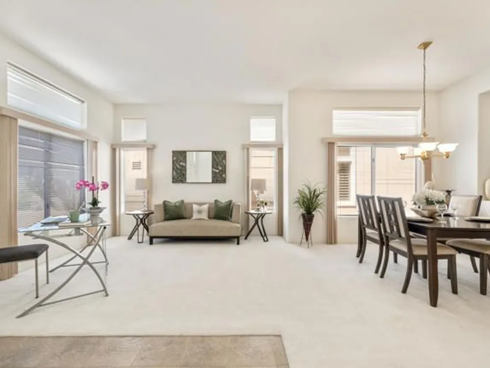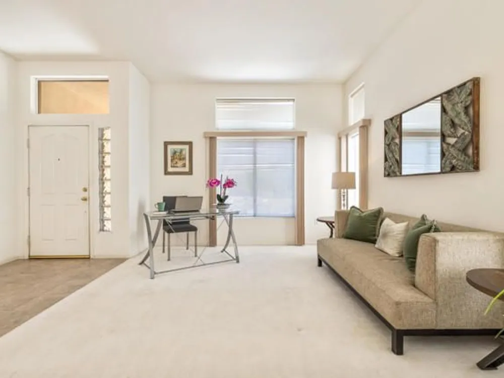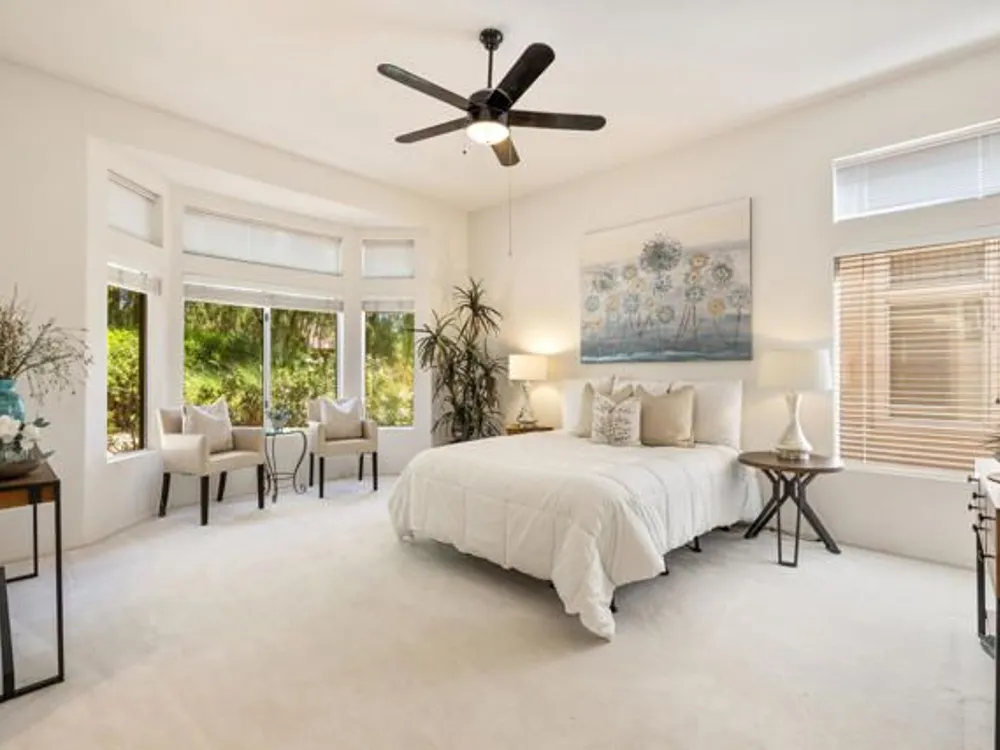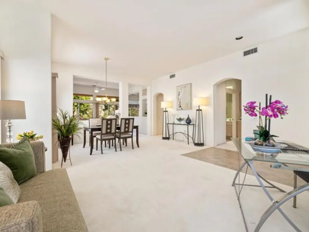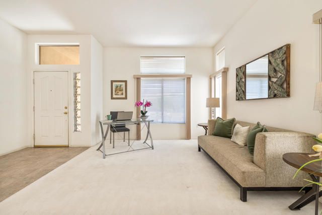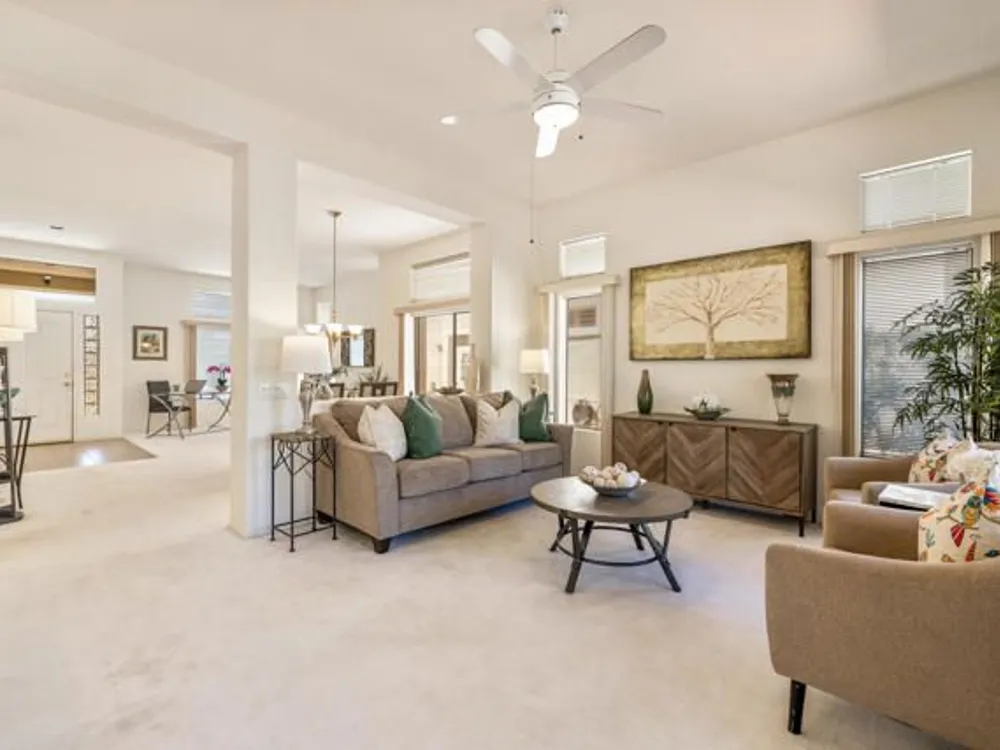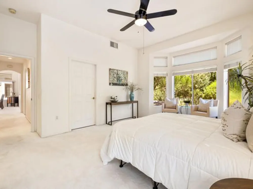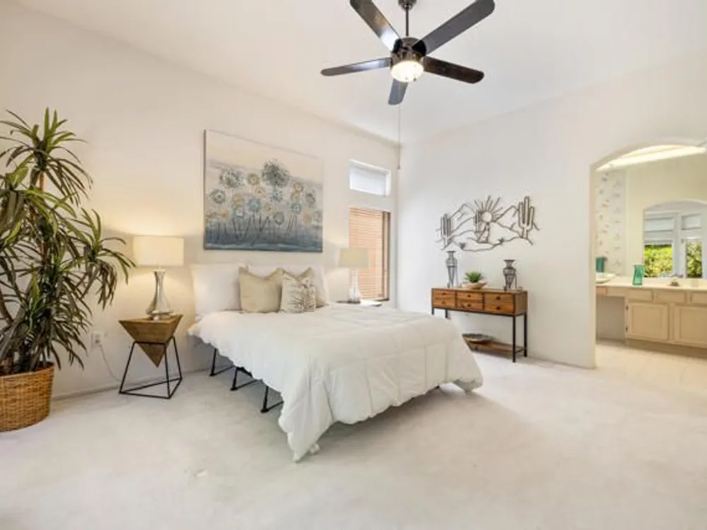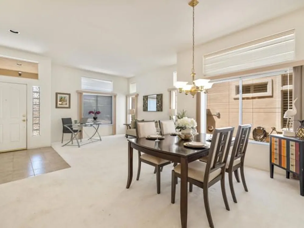 55+ Sun City Palm Desert. The BEST ''Bang for your Buck'' active retirement community in the whole Coachella Valley and beyond! This very popular great room LALIQUE model is located within walking distance or short golf cart ride to the Mountain View Clubhouse. The curb appeal is nice with desert landscaping, spacious gated courtyard with perfect area for your morning coffee. Inside, this home features 2 bedrooms and 2 baths, high ceilings and transom windows creating an airy light space. There are alot of storage space and cabinets,, The kitchen has a breakfast nook with a view and is open to the family room. The master suite features a bay window, a large walk-in closet, bathroom has dual vanity and a large skylight, The guest bedroom is on the opposite side of the home for maximum privacy with a full bath in the hallway just outside the bedroom. The living room can double as a nice office space with a view of the front courtyard. The laundry room has a washer and dryer and is included. The patio is semi-private and perfect for an afternoon BBQ with friends or just relaxing with a good book. ''Buy Where you love to Play....Sun City Palm Desert!''